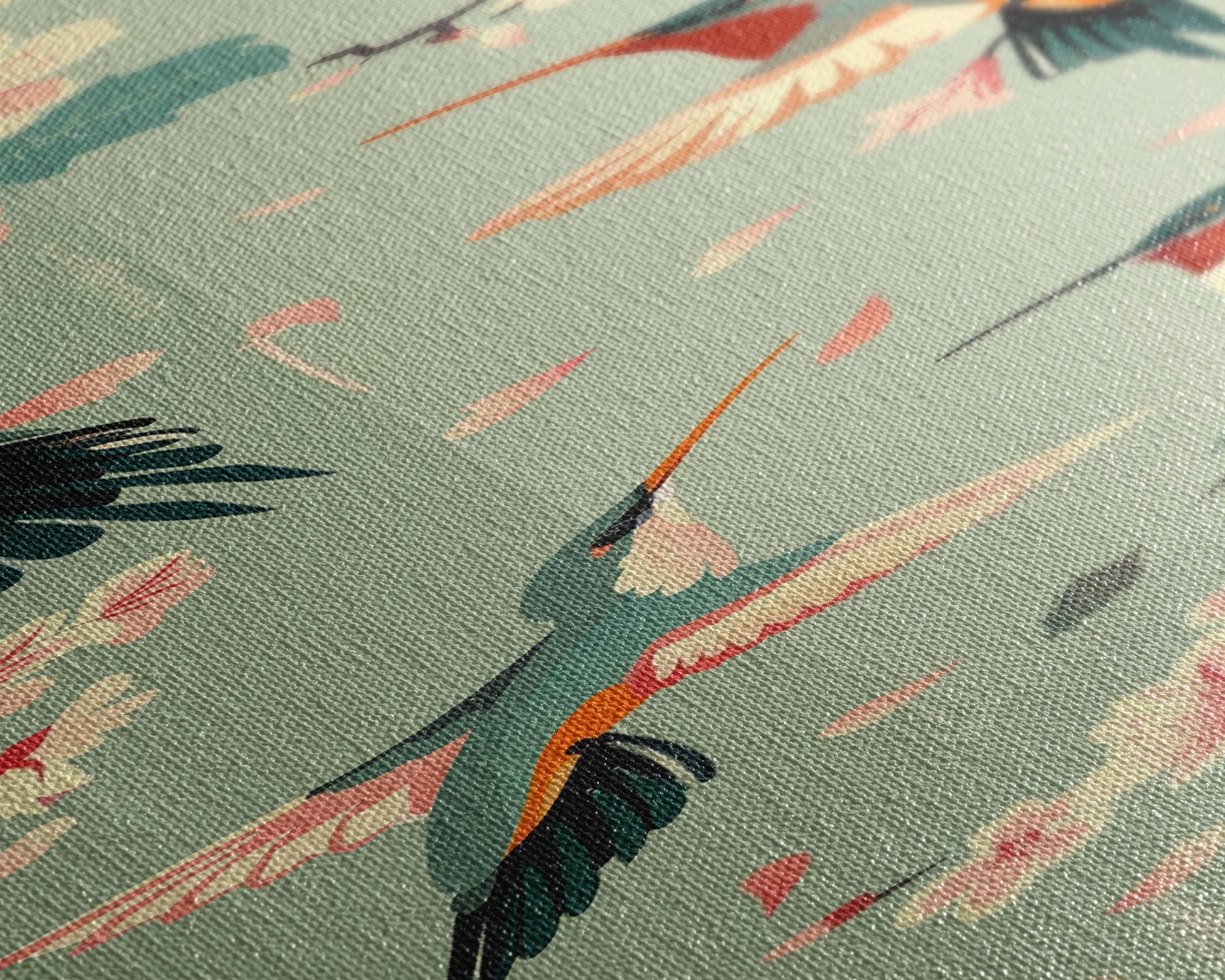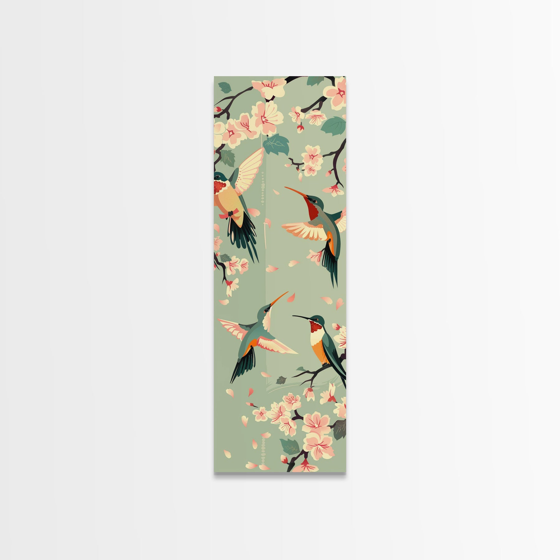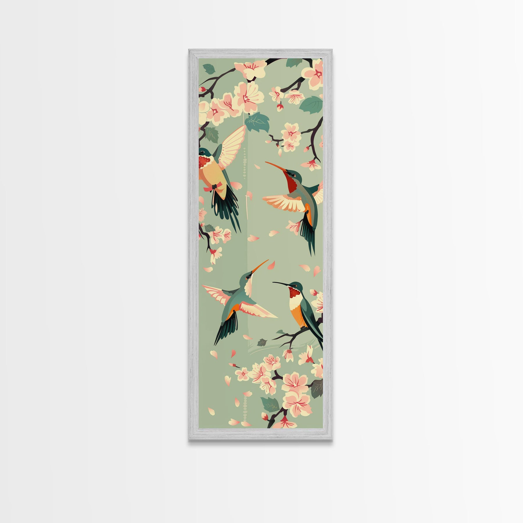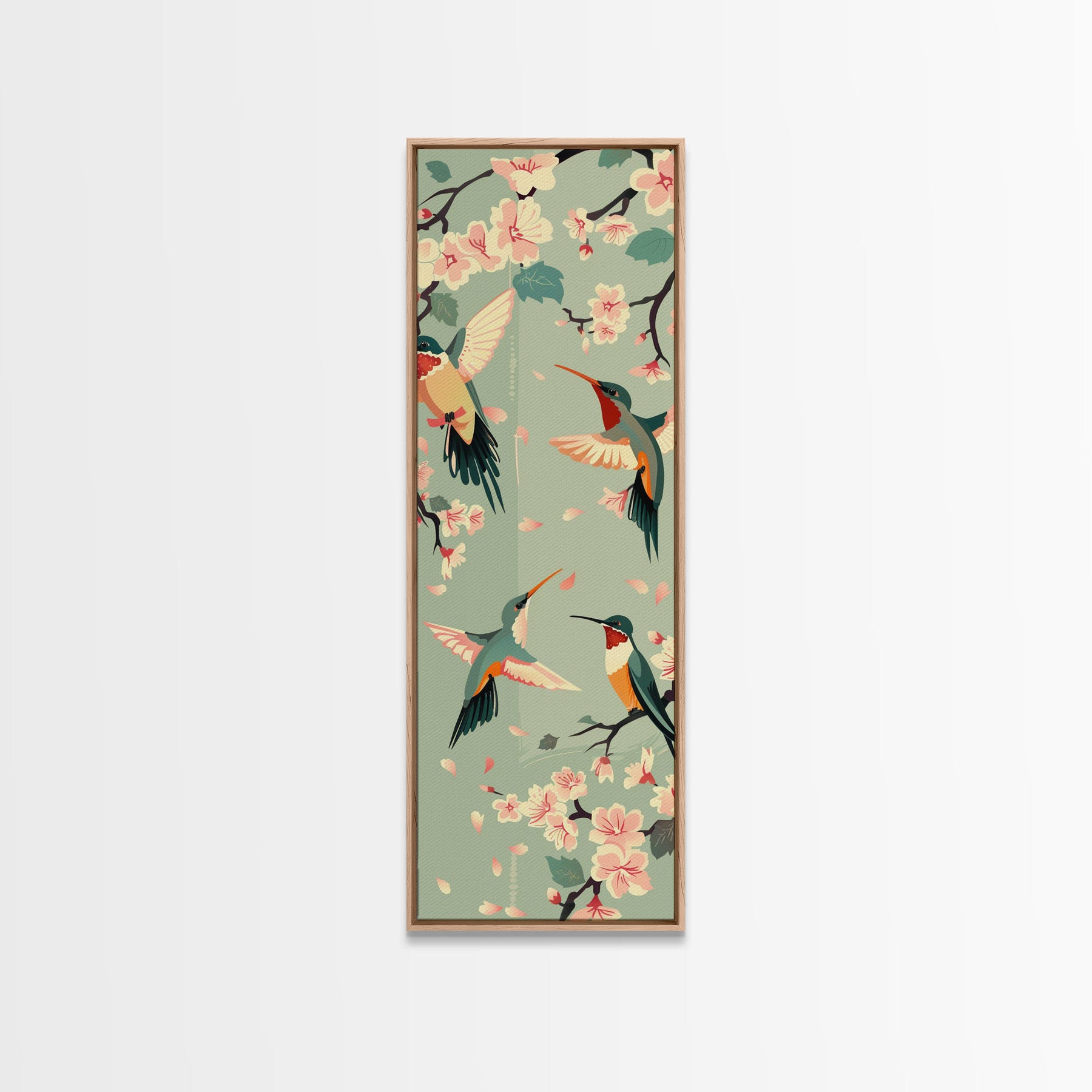 Hummingbirds And Cherry Blossoms In Japanese Style Canvas, Ukiyo-e Inspired Woodblock Art, Framed Canvas Print, Japanese Tall Skinny Wall Art, Ready To Hang