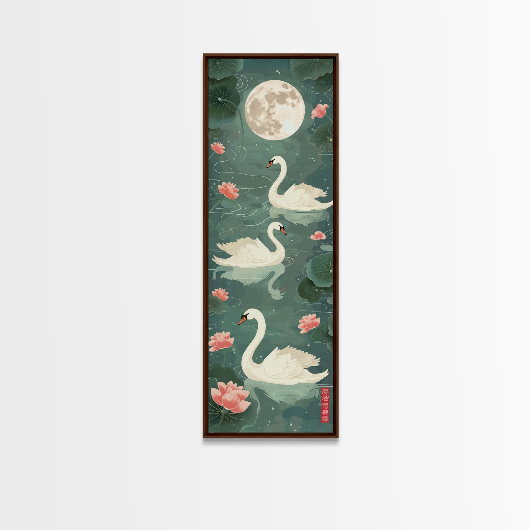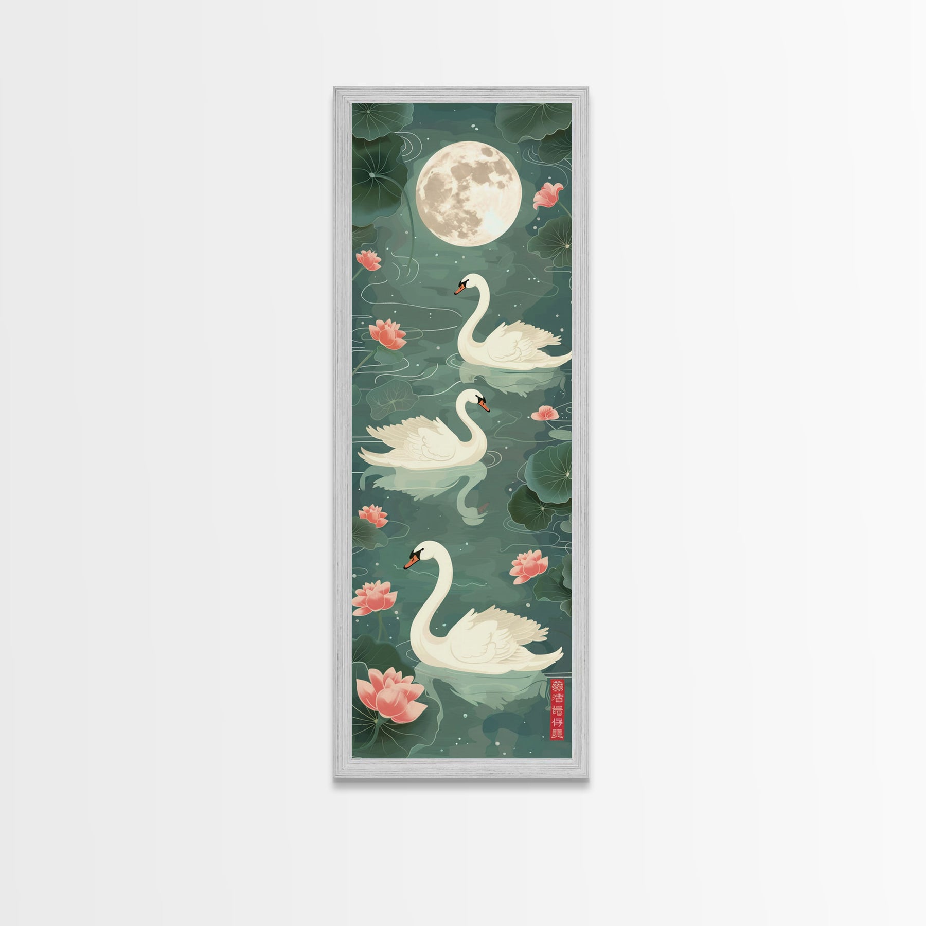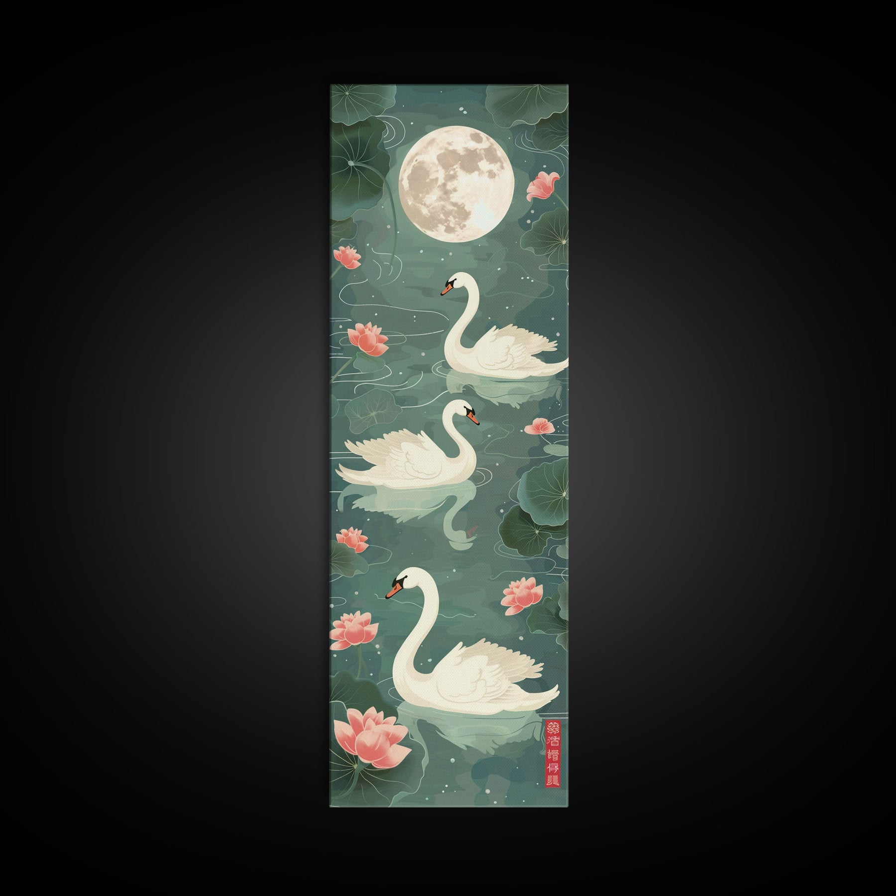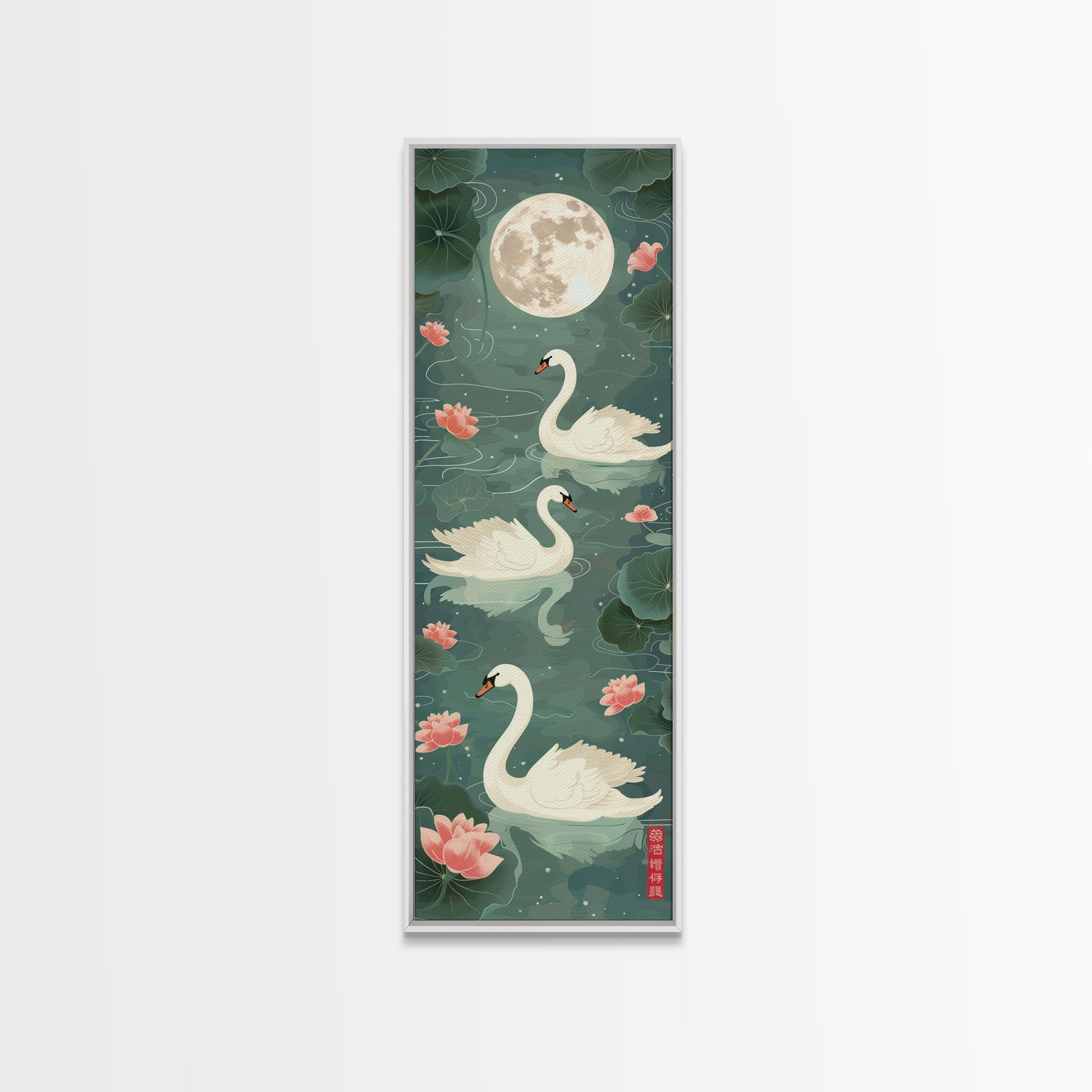 Swans Floating Gracefully Under The Full Moon In Japanese Style Ukiyo-e Art Framed Canvas Print Skinny Art Tall Art