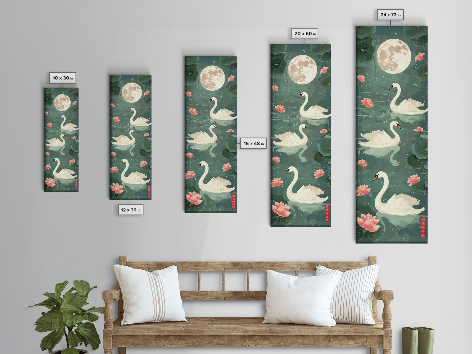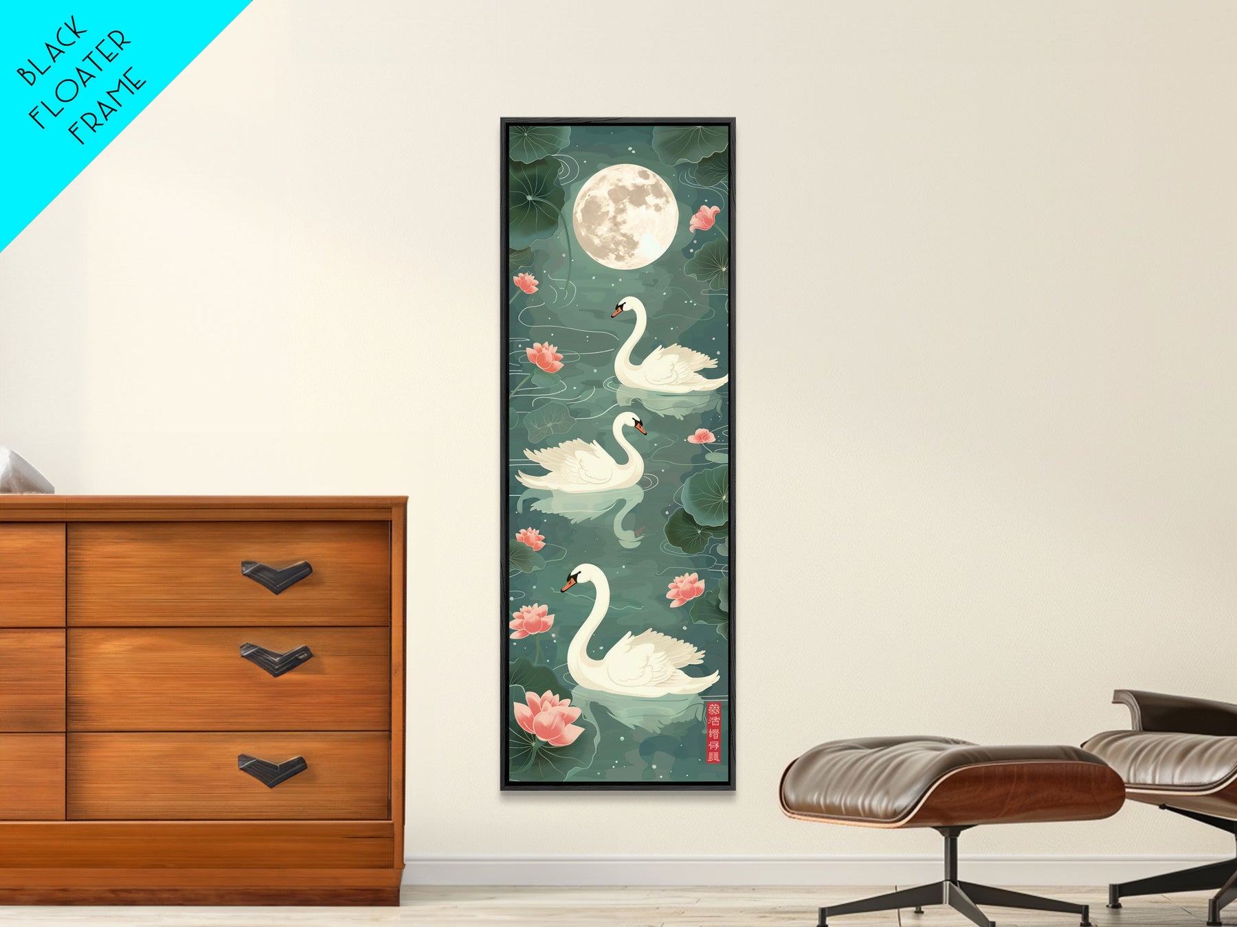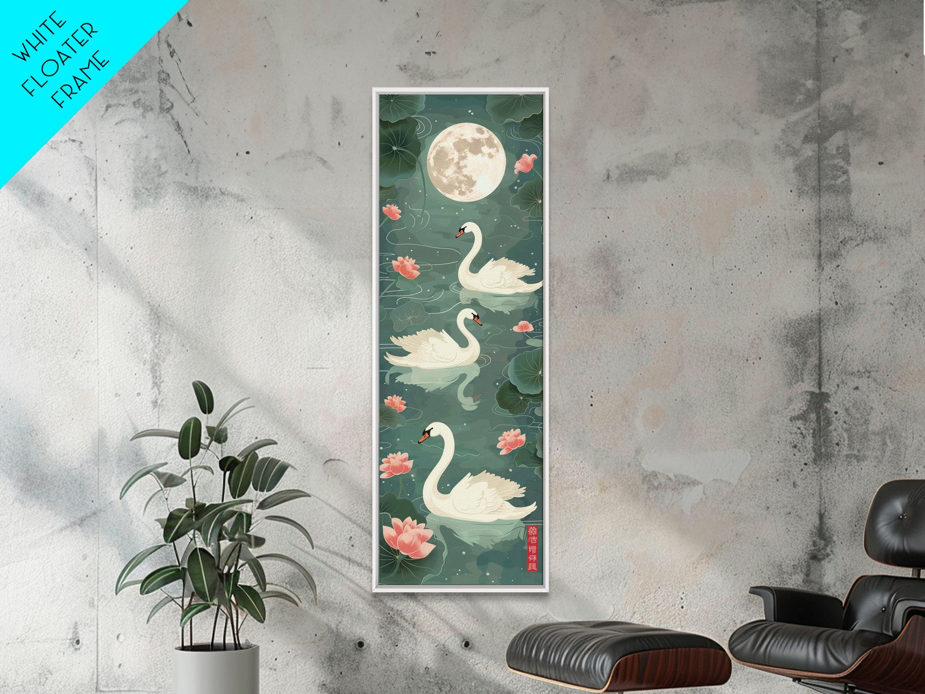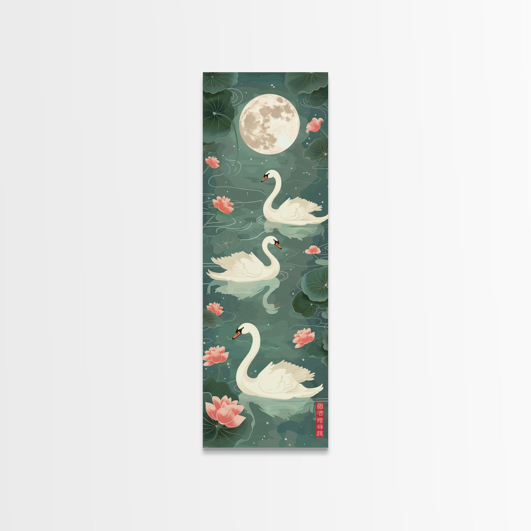 Swans Floating Gracefully Under The Full Moon In Japanese Style Ukiyo-e Art Framed Canvas Print Skinny Art Tall Art