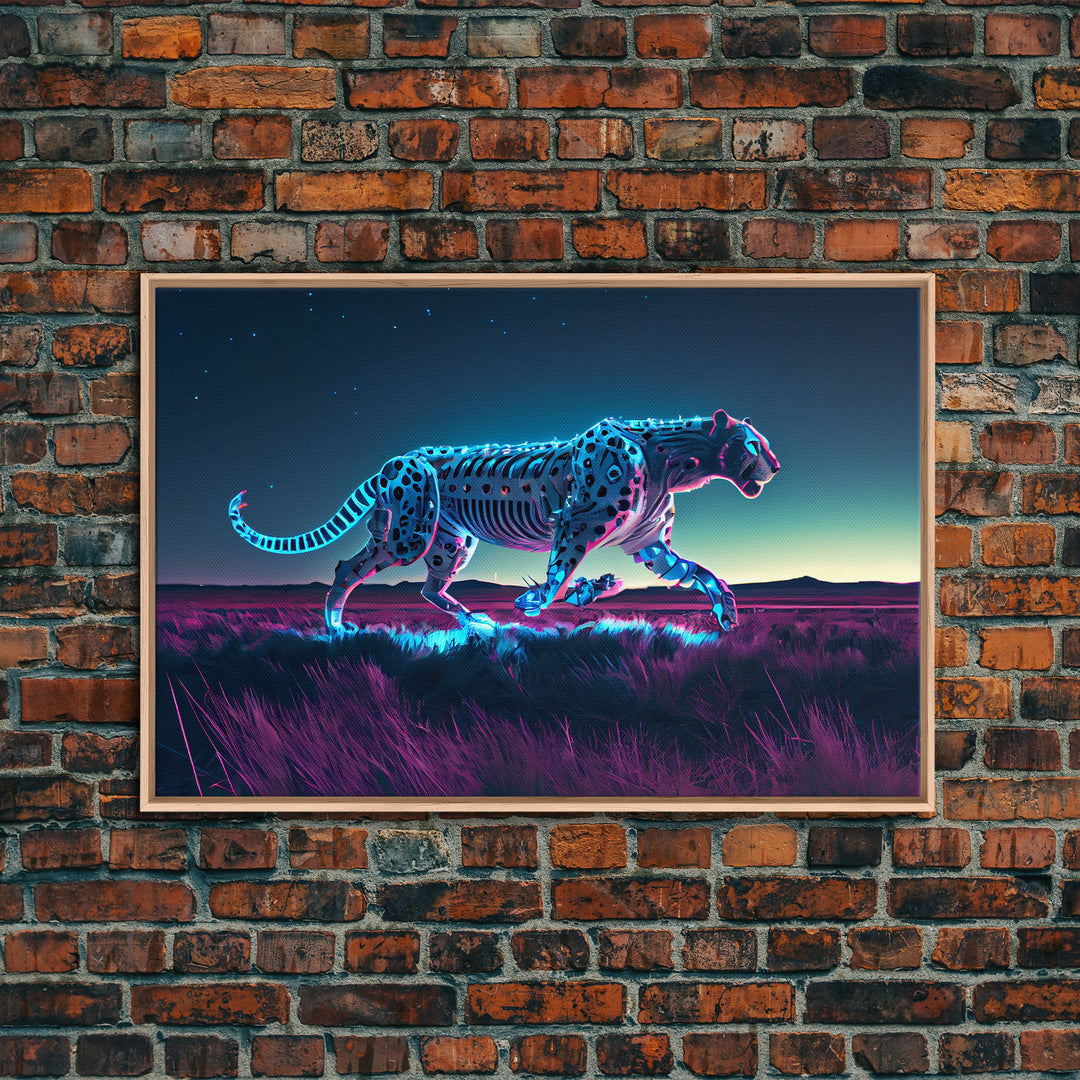 Robot Cheetah, Synthwave cyberpunk art, robot cheetah, framed canvas art, canvas print