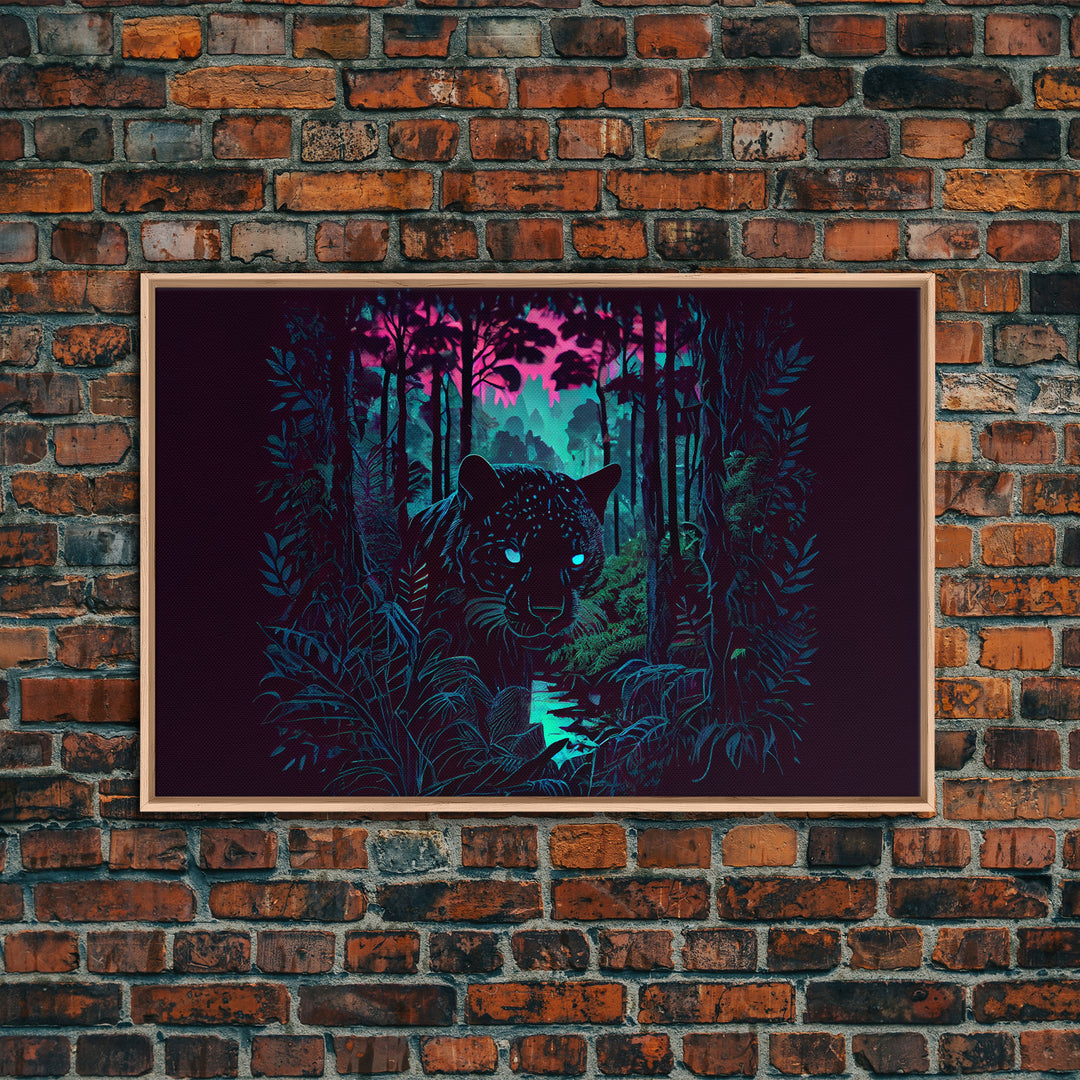 Panther in the jungle, framed canvas print, synthwave / vaporwave art