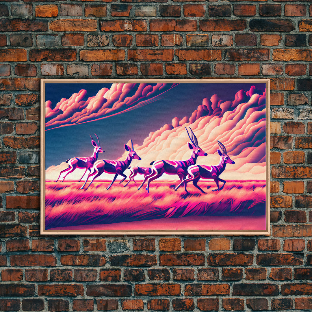 Herd of African Gazelles, vaporwave art, synthwave aesthetic nature print, framed canvas print