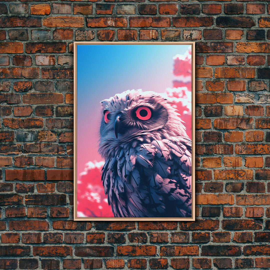 White owl in synthwave forest, vaporwave style animal print art, framed canvas print