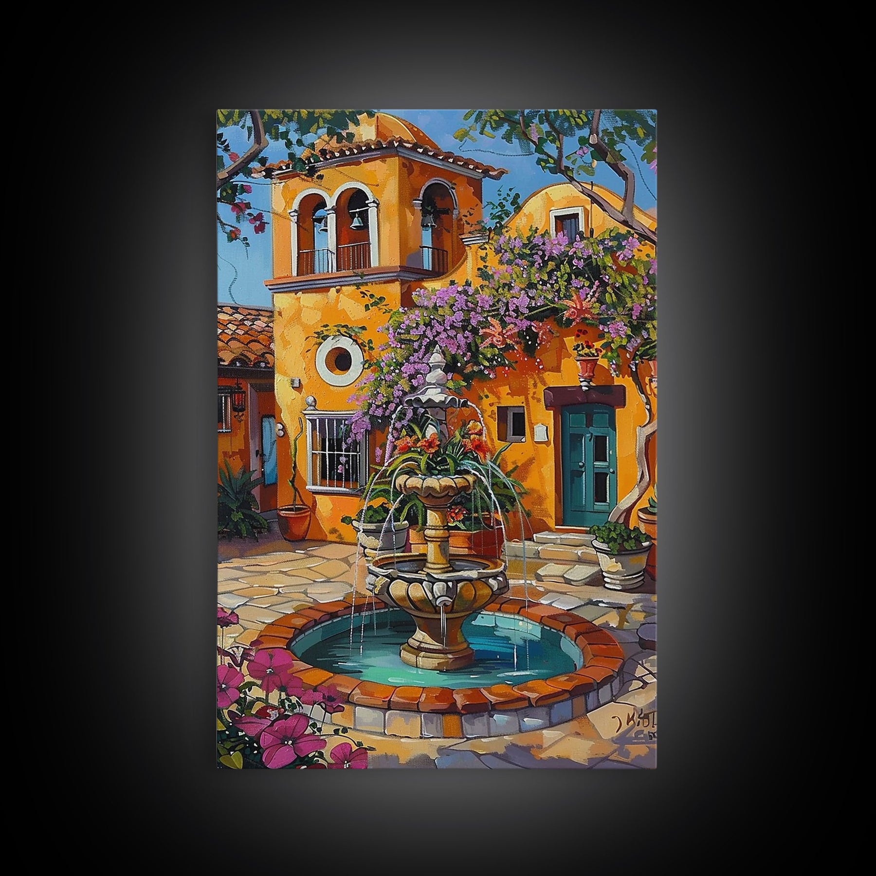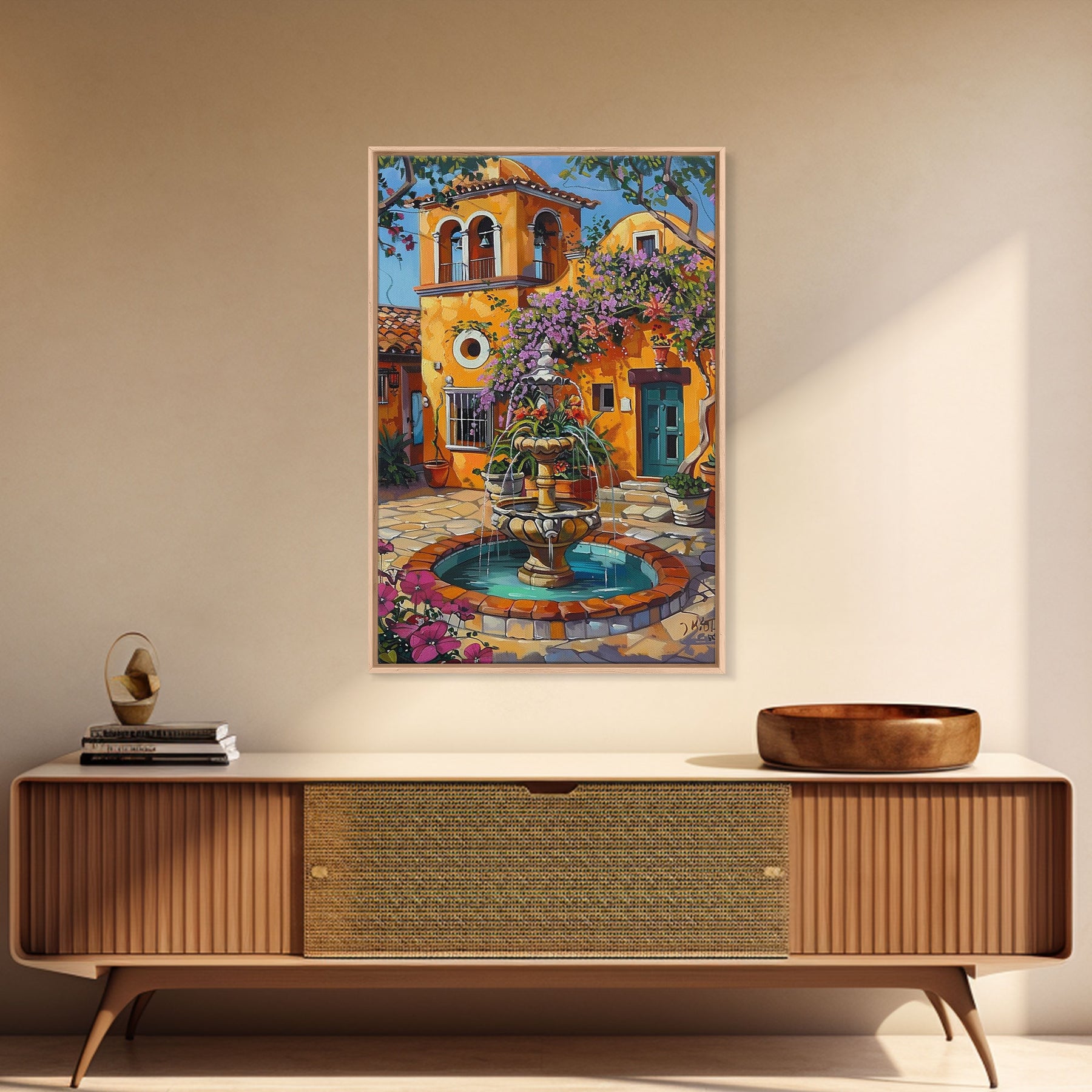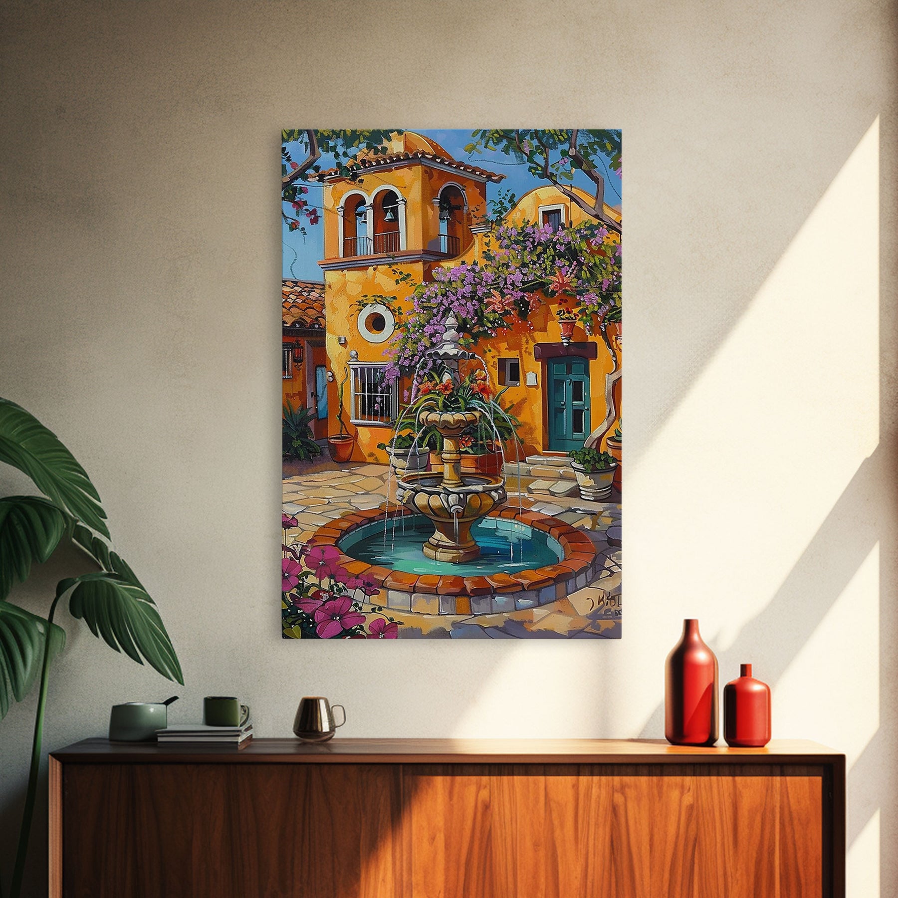 Tall Art Framed Canvas Print Featuring Mexican Style Courtyard Fountain And Vibrant Architecture