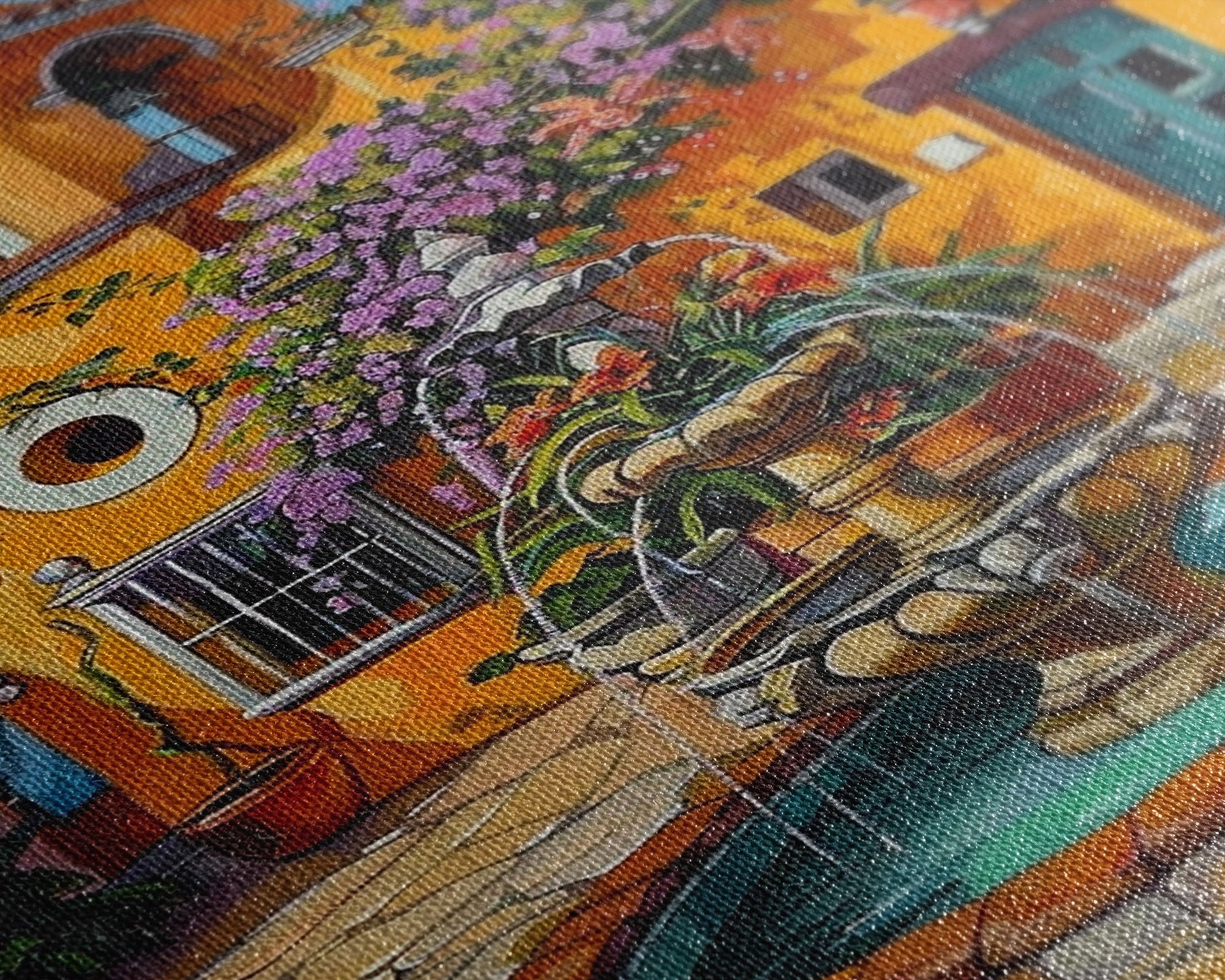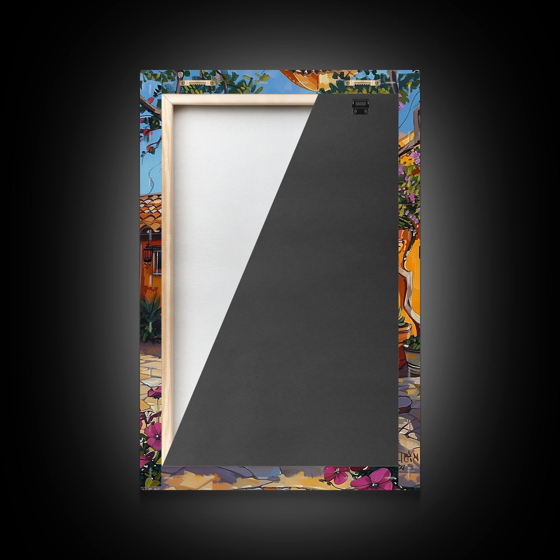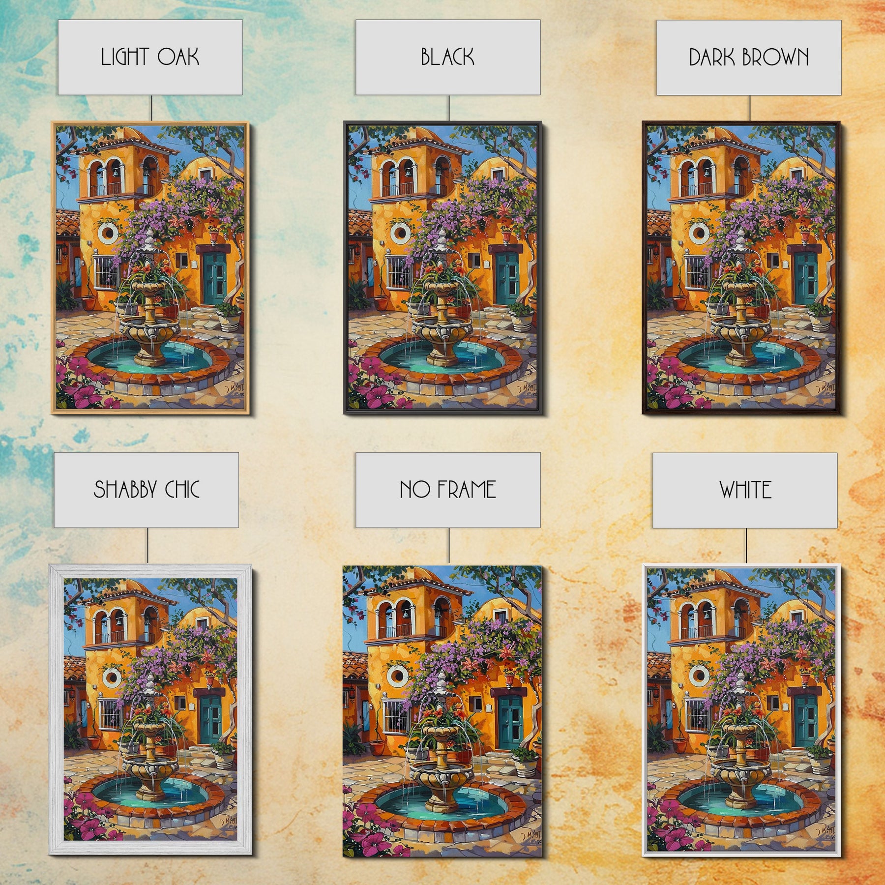 Tall Art Framed Canvas Print Featuring Mexican Style Courtyard Fountain And Vibrant Architecture