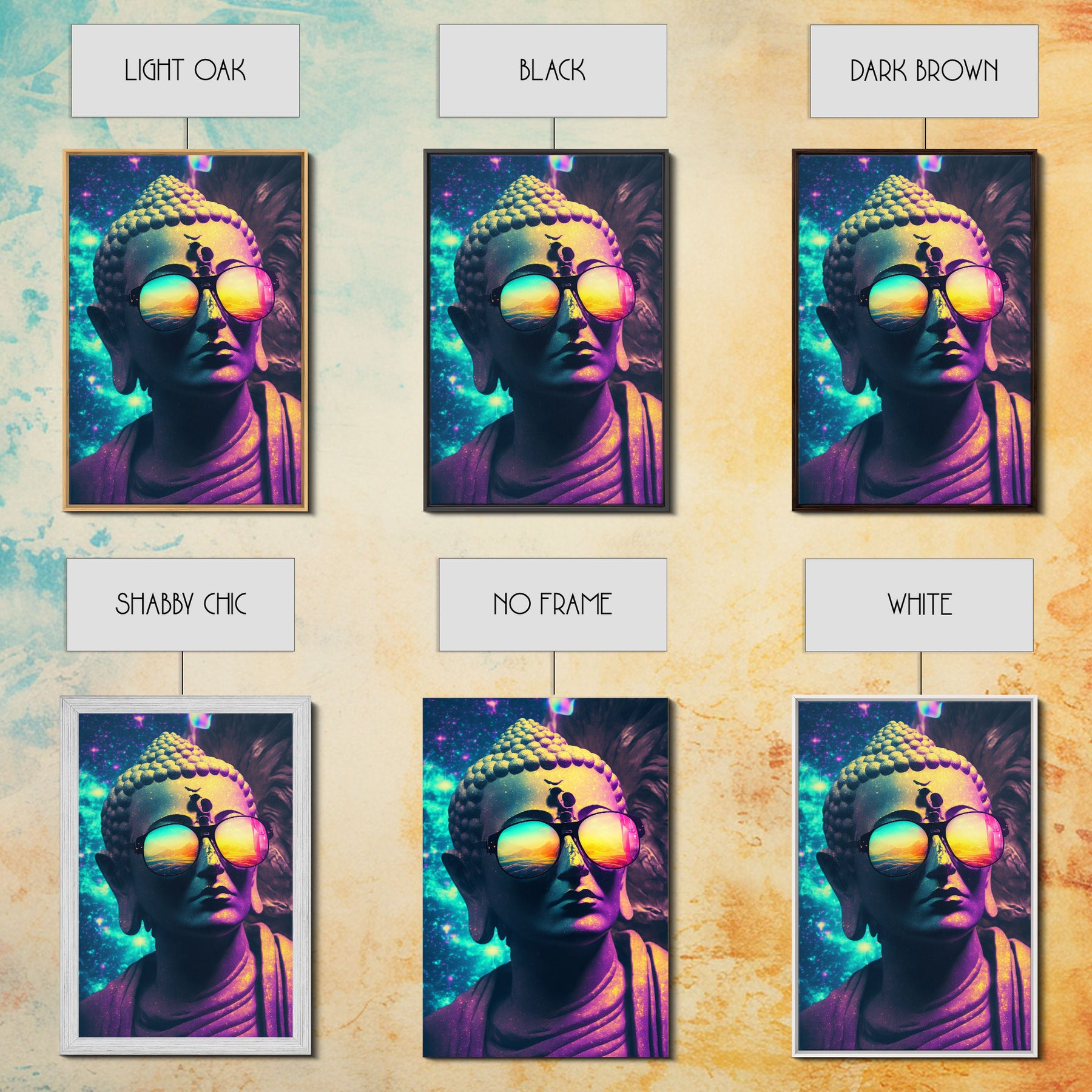 Open Your Mind, Psychedelic Buddha Statue Wearing Aviators / Sunglasses, Meditation Art, Framed Canvas Print, Color Pop Art