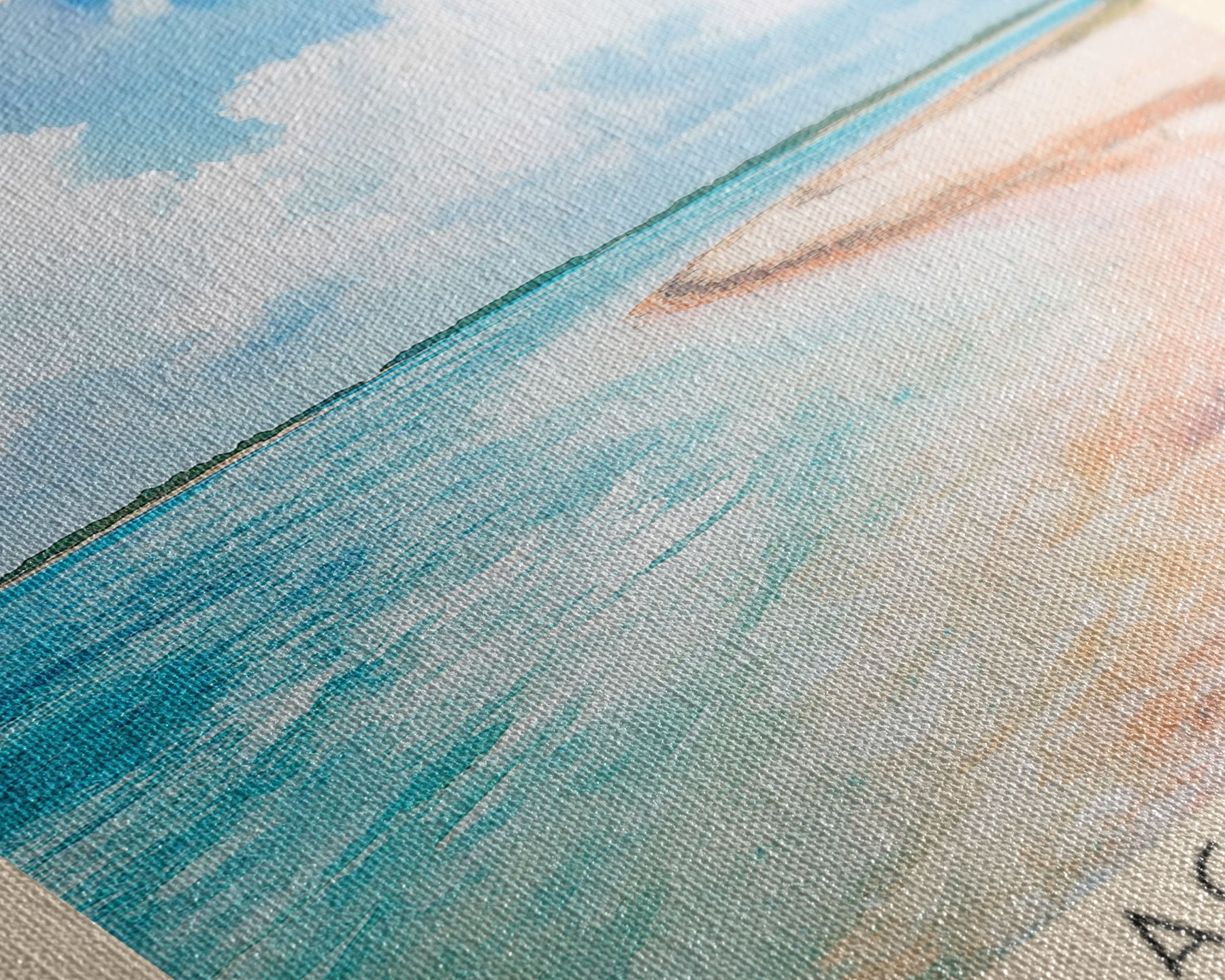 Most of our canvases are made in the USA, with the exception of canvases ordered with the light oak unstained frames, and any large canvases (24x48, 30x60, 16x48 and 20x60) ordered WITH a frame. These are temporarily made in and shipped from Europe, while we try to find a more consistent supplier in the USA.