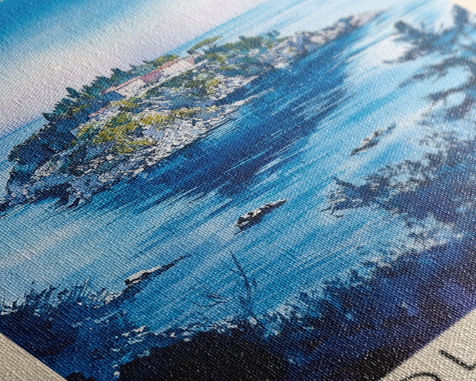 Most of our canvases are made in the USA, with the exception of canvases ordered with the light oak unstained frames, and any large canvases (24x48, 30x60, 16x48 and 20x60) ordered WITH a frame. These are temporarily made in and shipped from Europe, while we try to find a more consistent supplier in the USA.