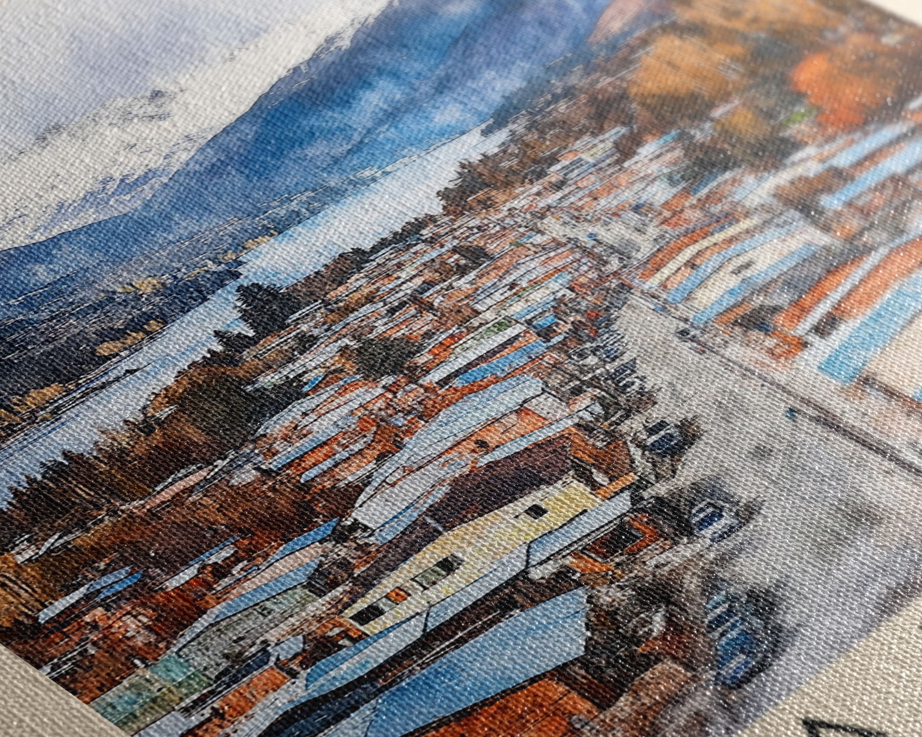 Most of our canvases are made in the USA, with the exception of canvases ordered with the light oak unstained frames, and any large canvases (24x48, 30x60, 16x48 and 20x60) ordered WITH a frame. These are temporarily made in and shipped from Europe, while we try to find a more consistent supplier in the USA.