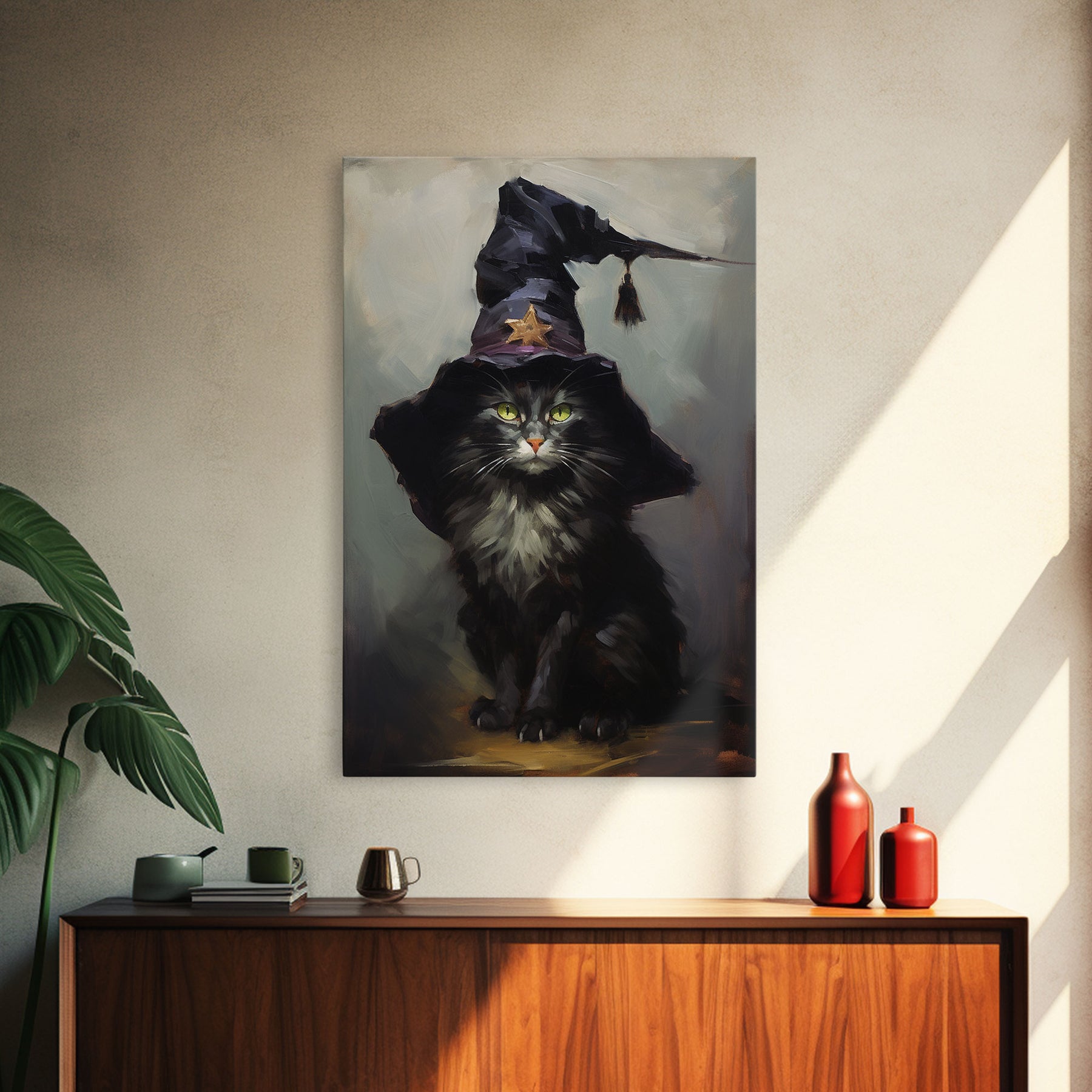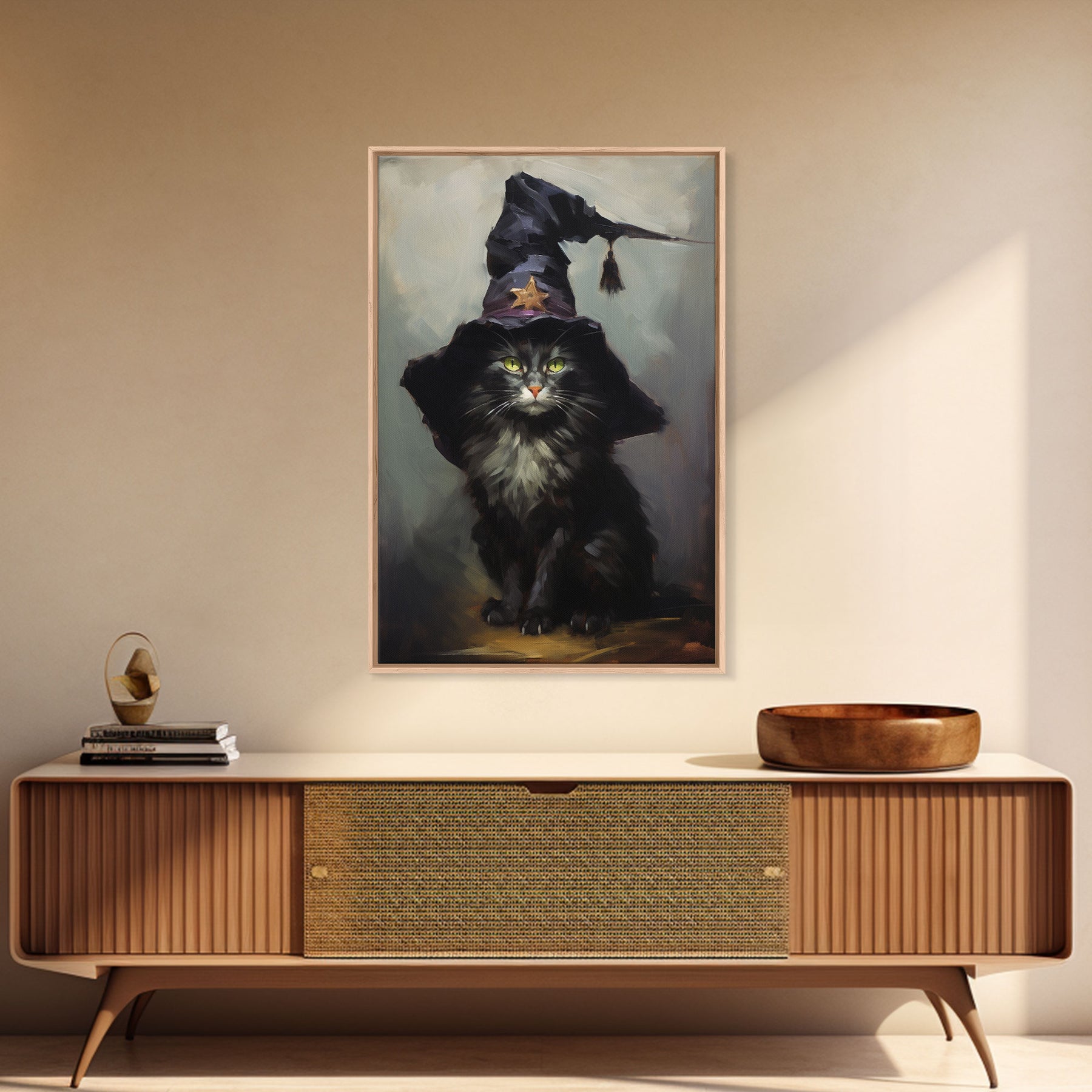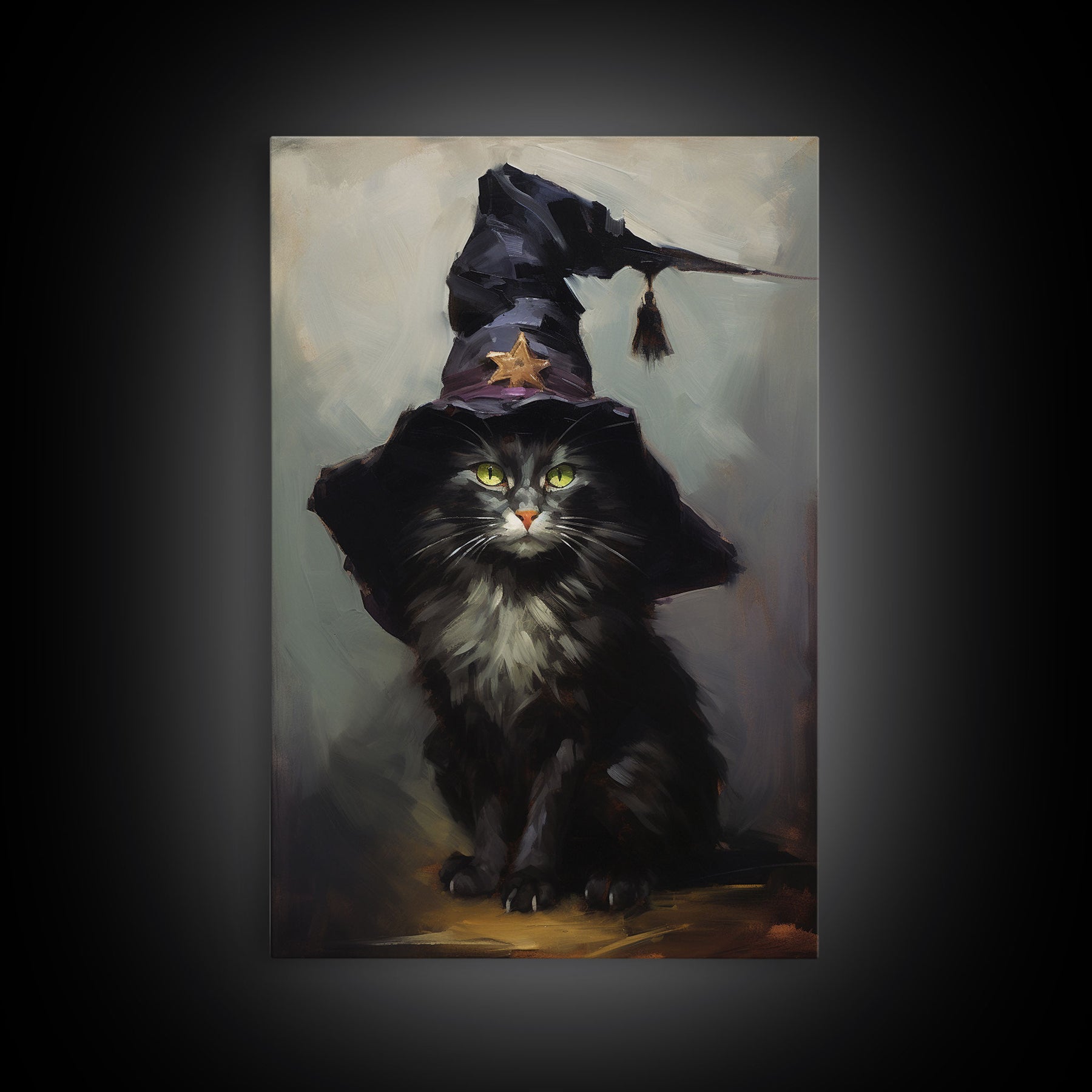 The Wizard Cat, Framed Canvas Print, Dark Academia Halloween Art, Victorian Cat Oil Painting, Goth Halloween Decor