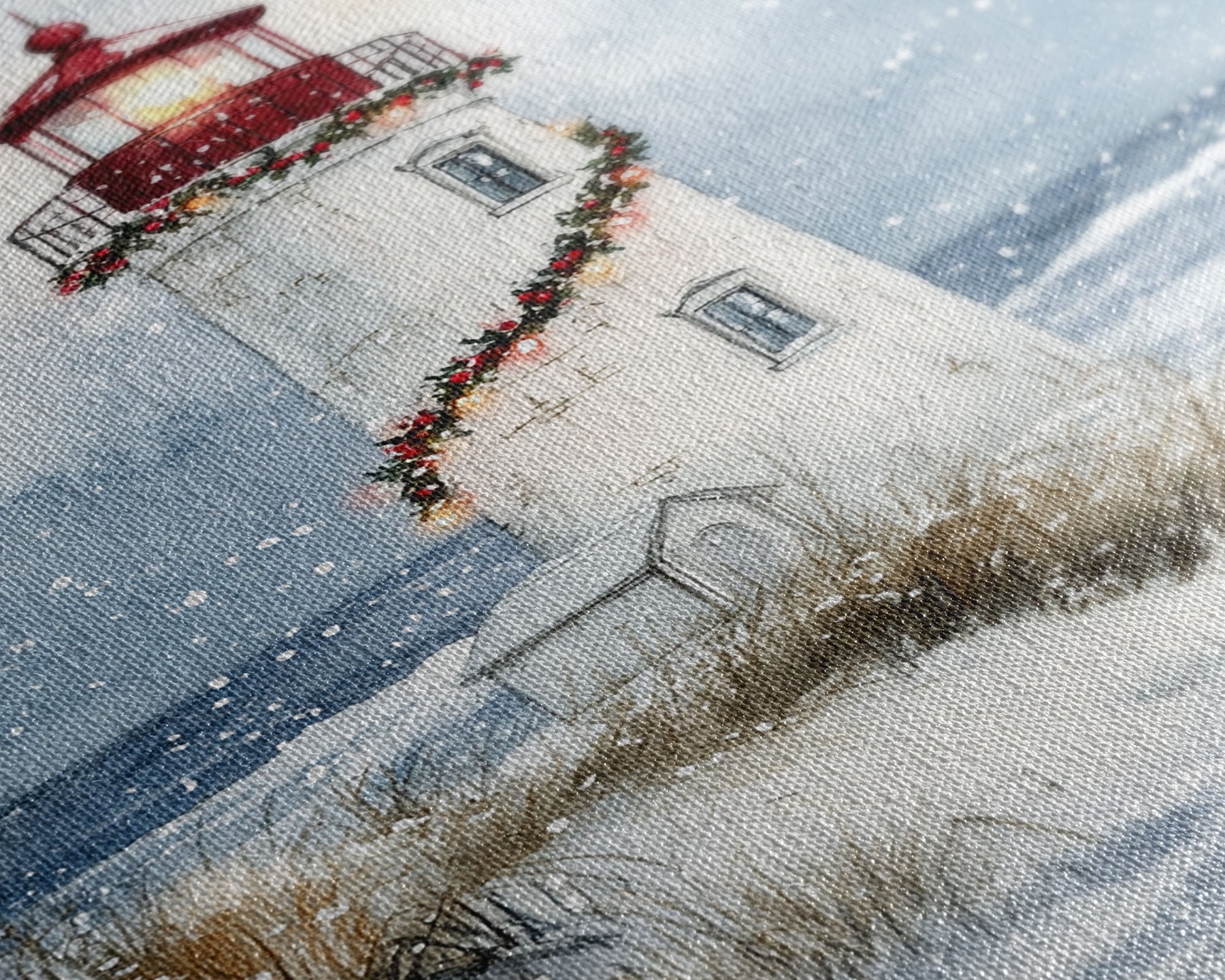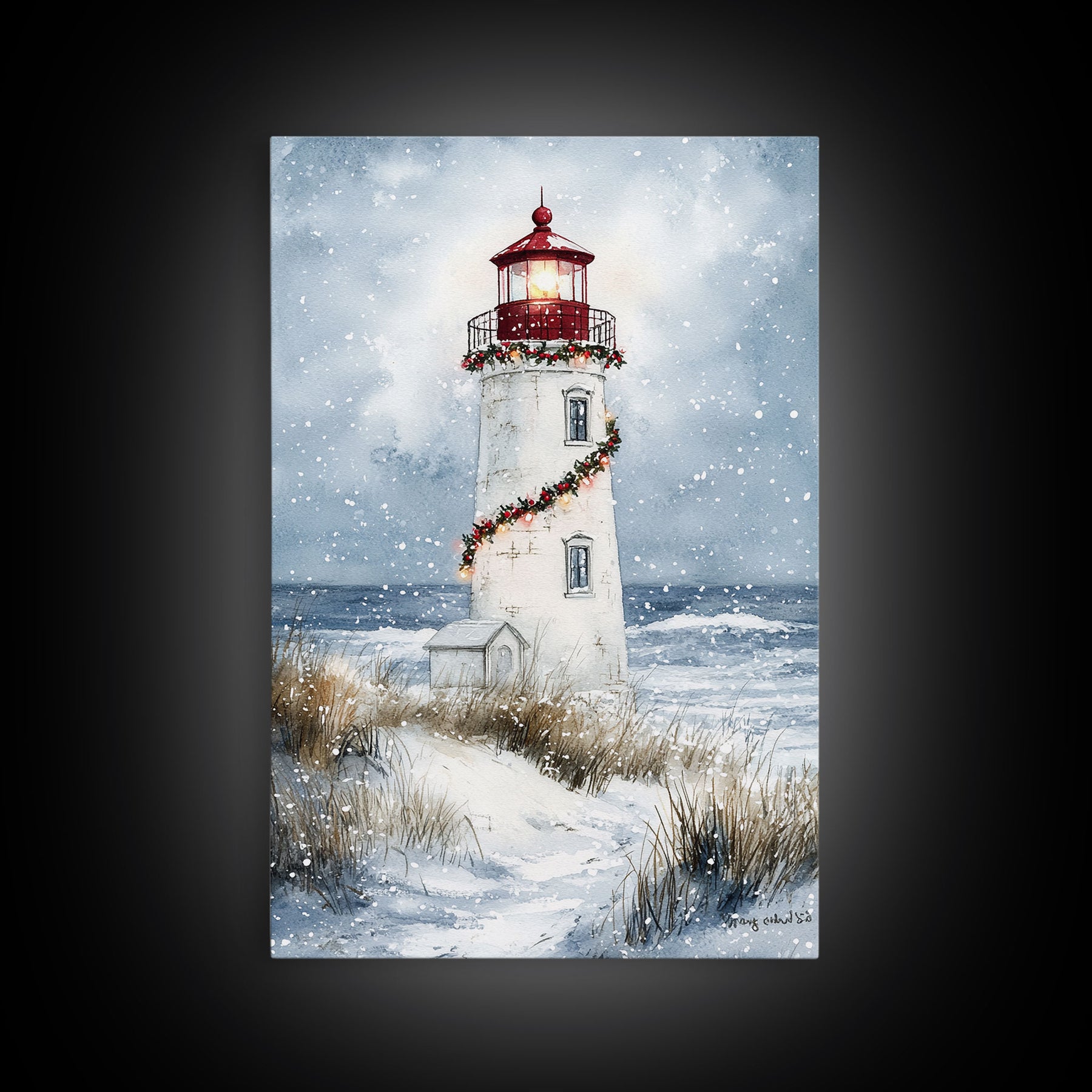 Snowy lighthouse wrapped with festive garland, Framed Canvas Print, beach Christmas decor, holiday wall art perfect for coastal homes