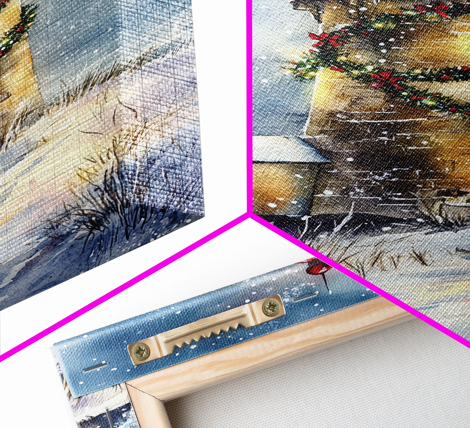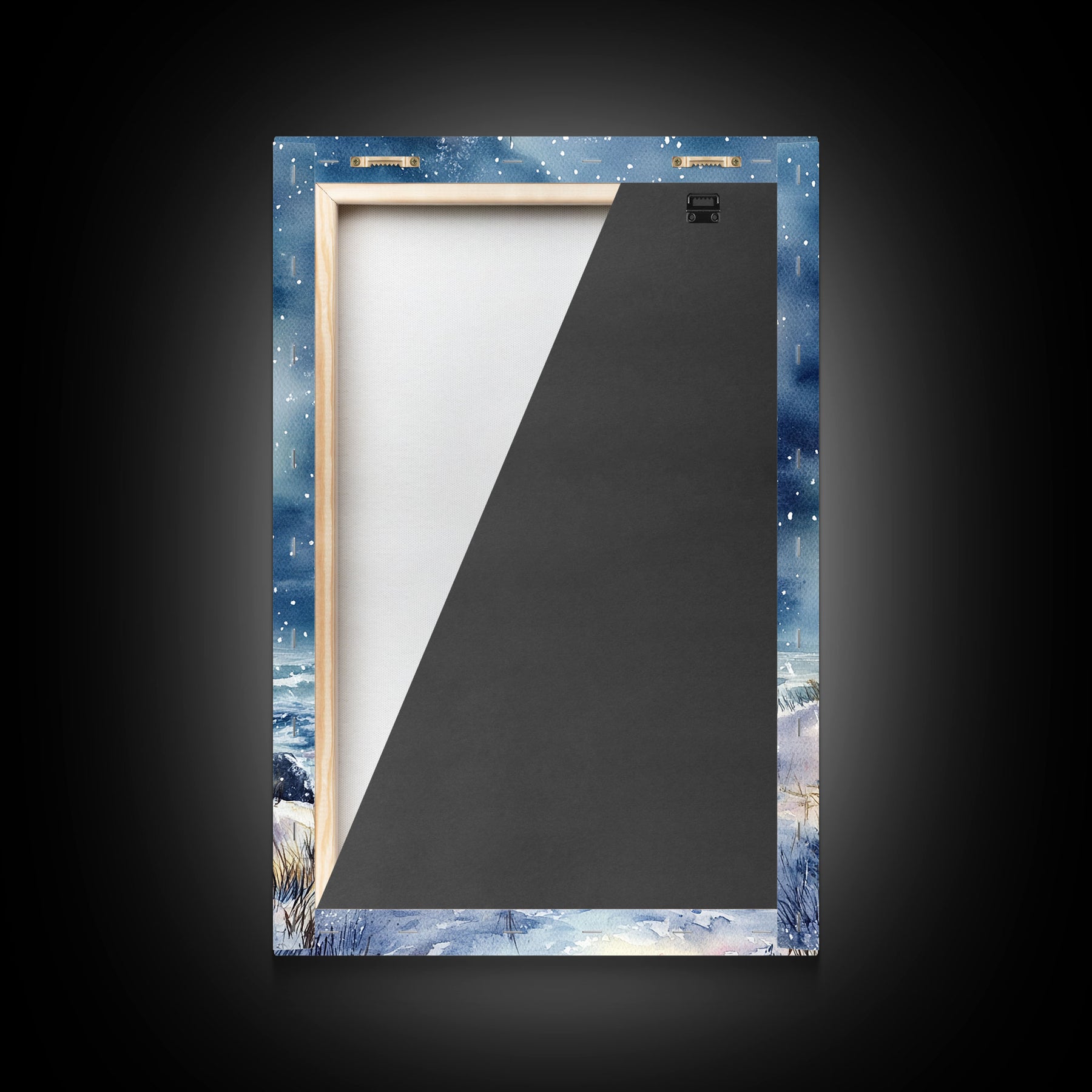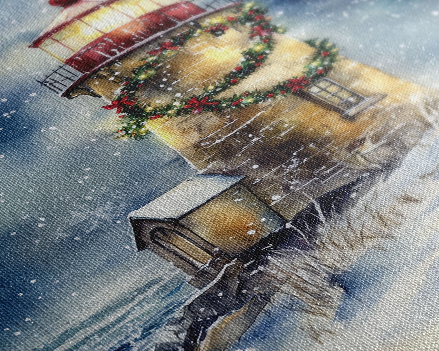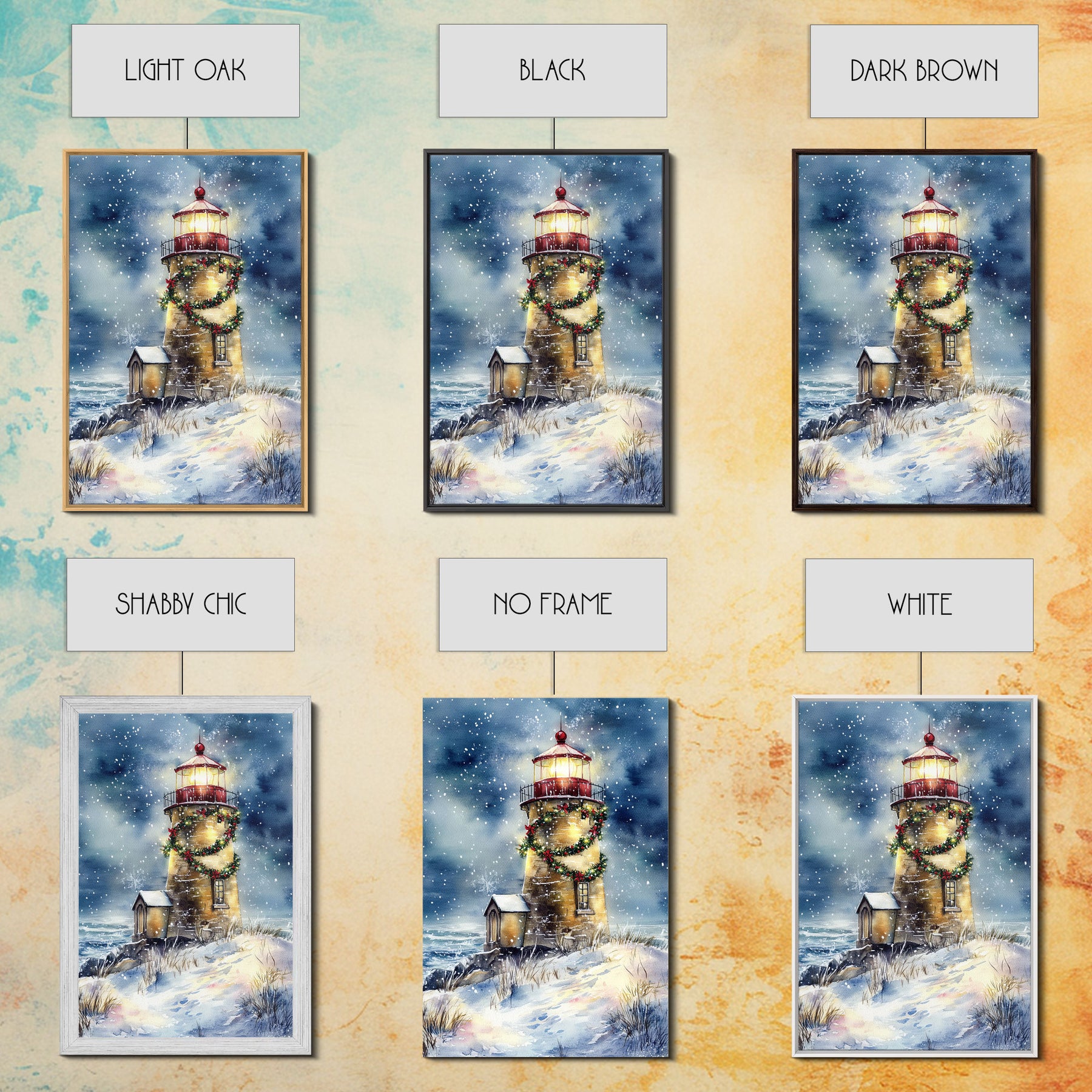 Snowy lighthouse under moonlit sky with wreath, Framed Canvas Print, beach Christmas decor for winter wonderland, holiday wall art