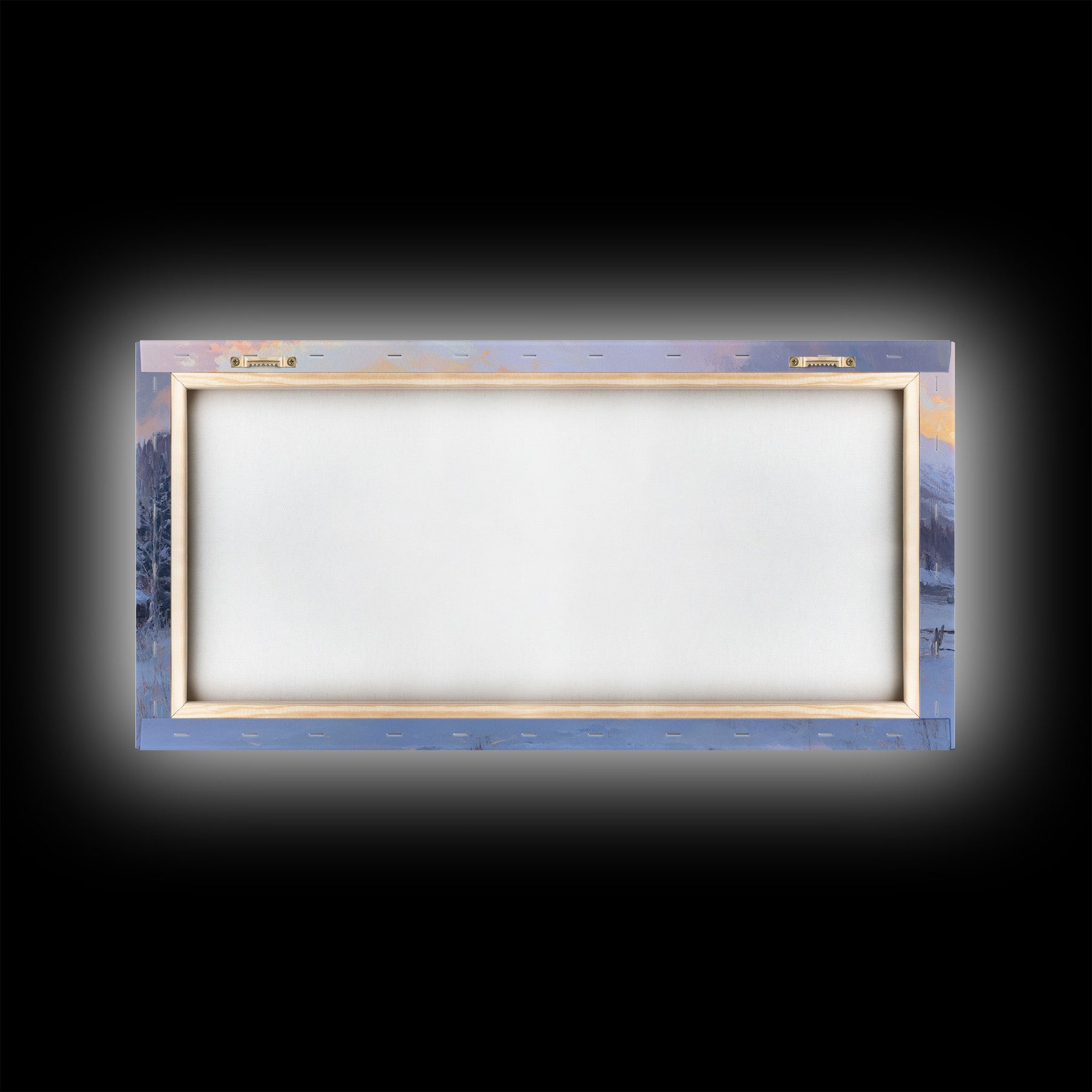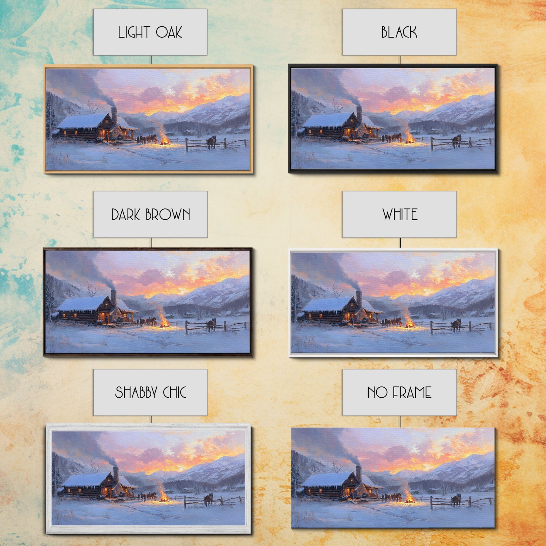 Cozy Snowy Log Cabin Tall Art Framed Canvas Print Winter Home Decor With Warm Fireplace And Horse Rider Under A Beautiful Sunset Scene