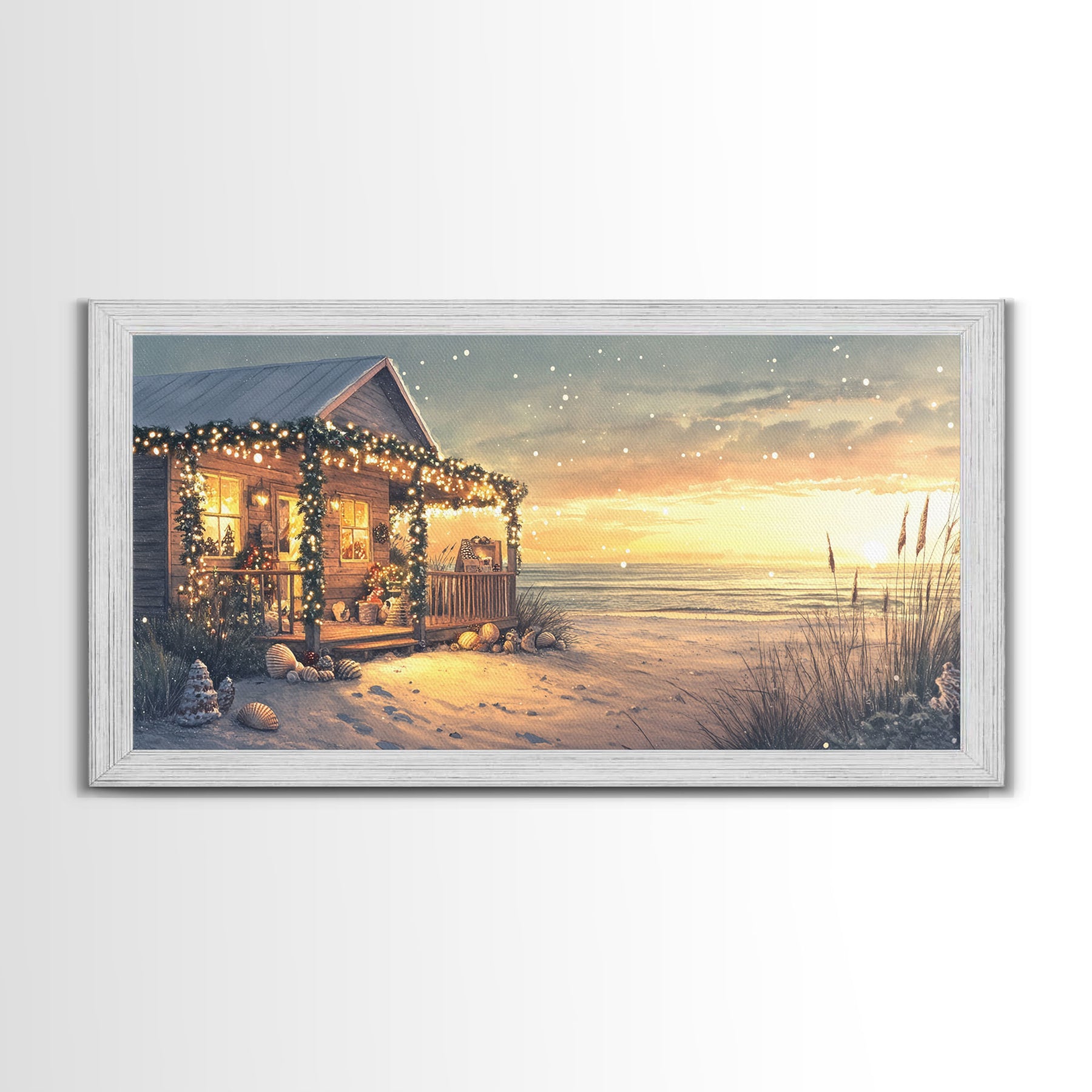 Christmas beach house decor, coastal holiday home art, seaside Christmas wall art, festive beach house print, framed canvas print
