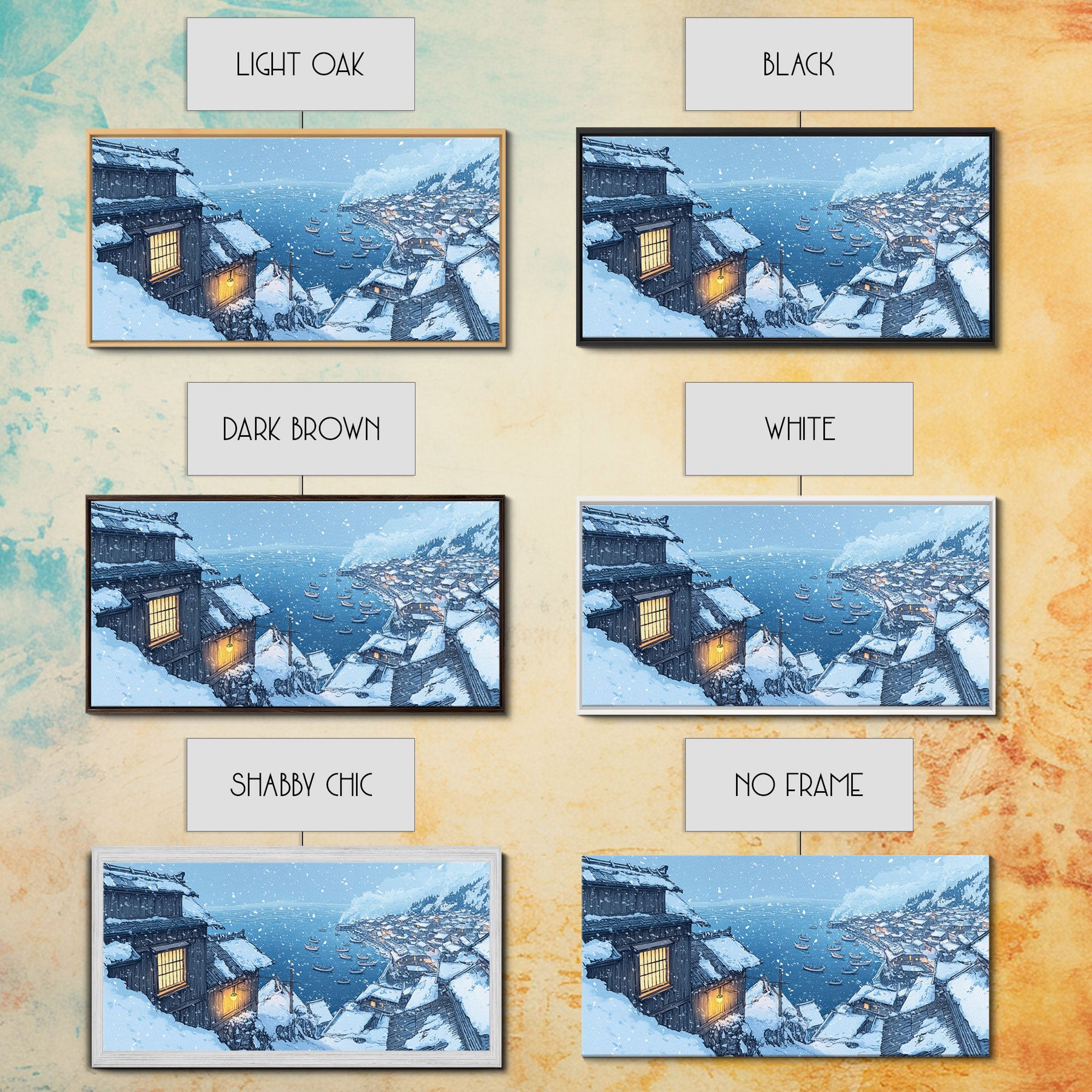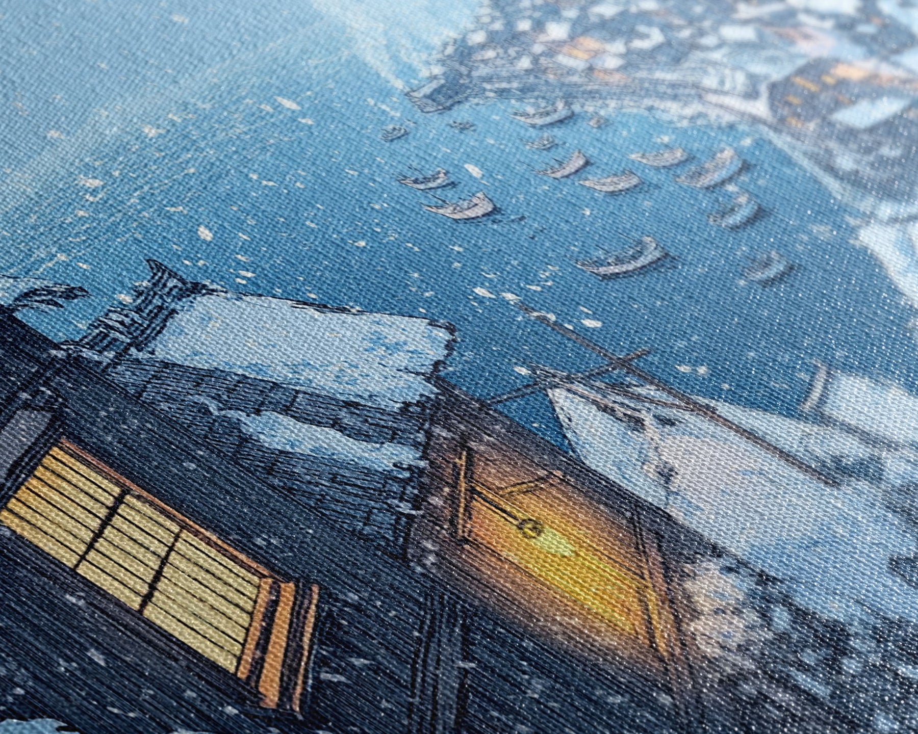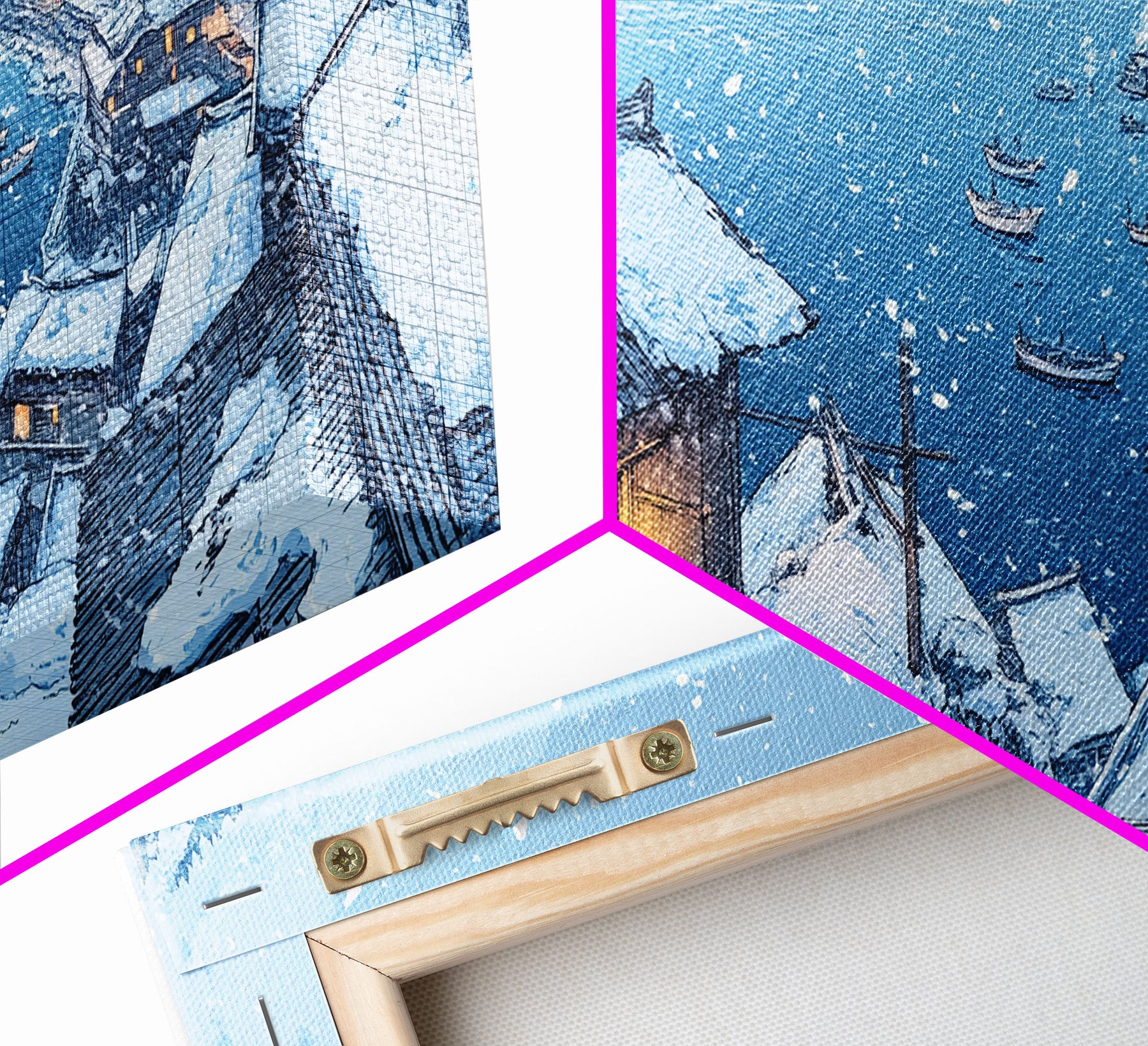 Snowy Village by the Sea, Framed Canvas Print, Nautical Christmas Art, Winter Wonderland, Coastal Christmas Decor, Holiday Wall Print