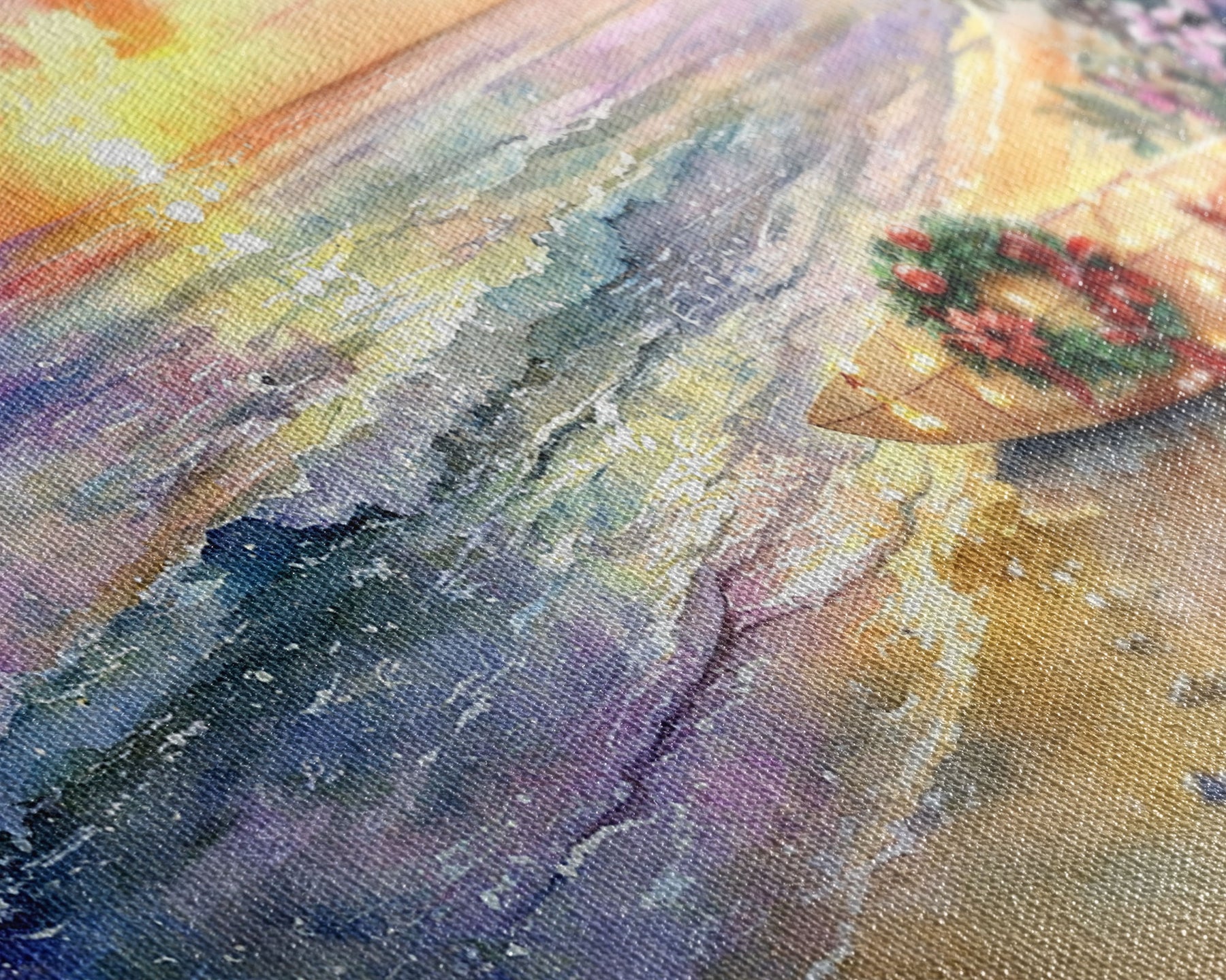Most of our canvases are made in the USA, with the exception of canvases ordered with the light oak unstained frames, and any large canvases (24x48, 30x60, 16x48 and 20x60) ordered WITH a frame. These are temporarily made in and shipped from Europe, while we try to find a more consistent supplier in the USA.