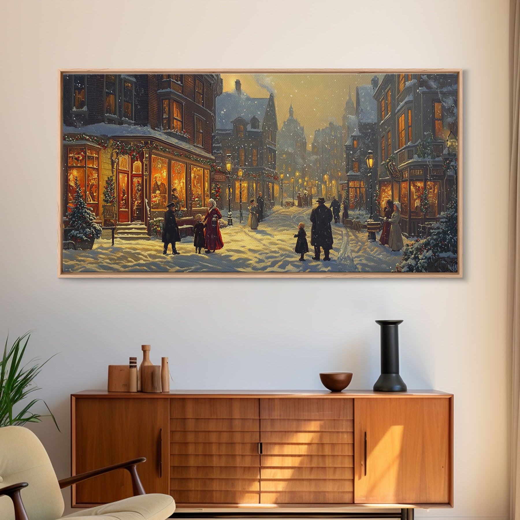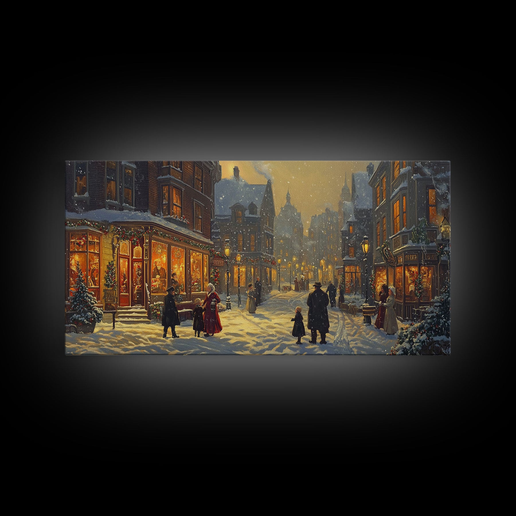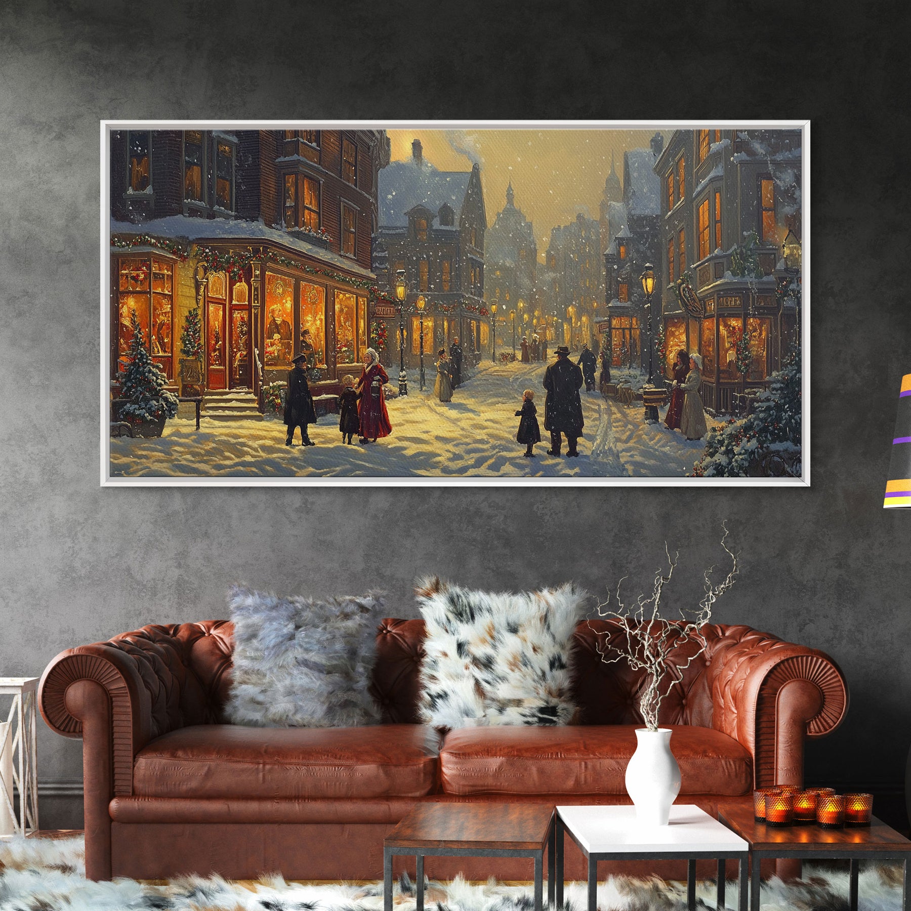 Victorian Christmas Street Scene With Families Shopping, Cozy Winter Wonderland Wall Art, Framed Canvas Print, Vintage Christmas Decor