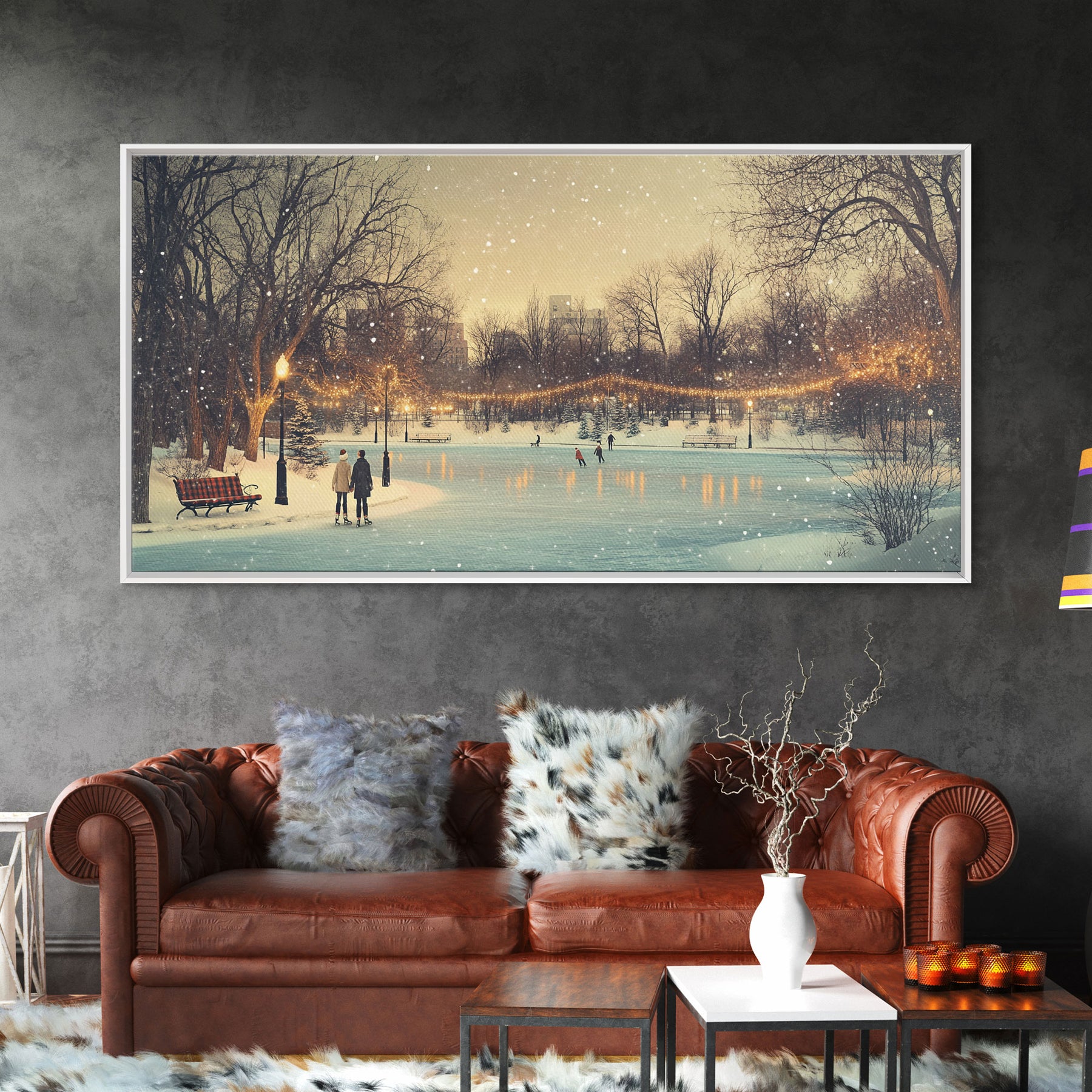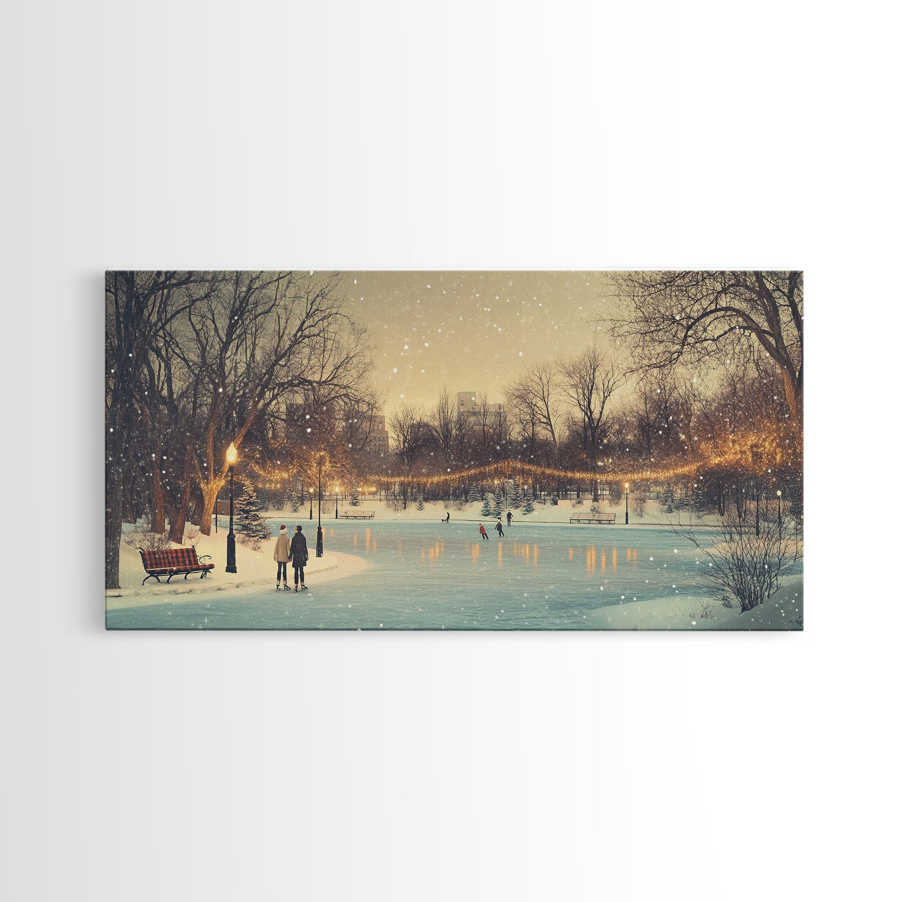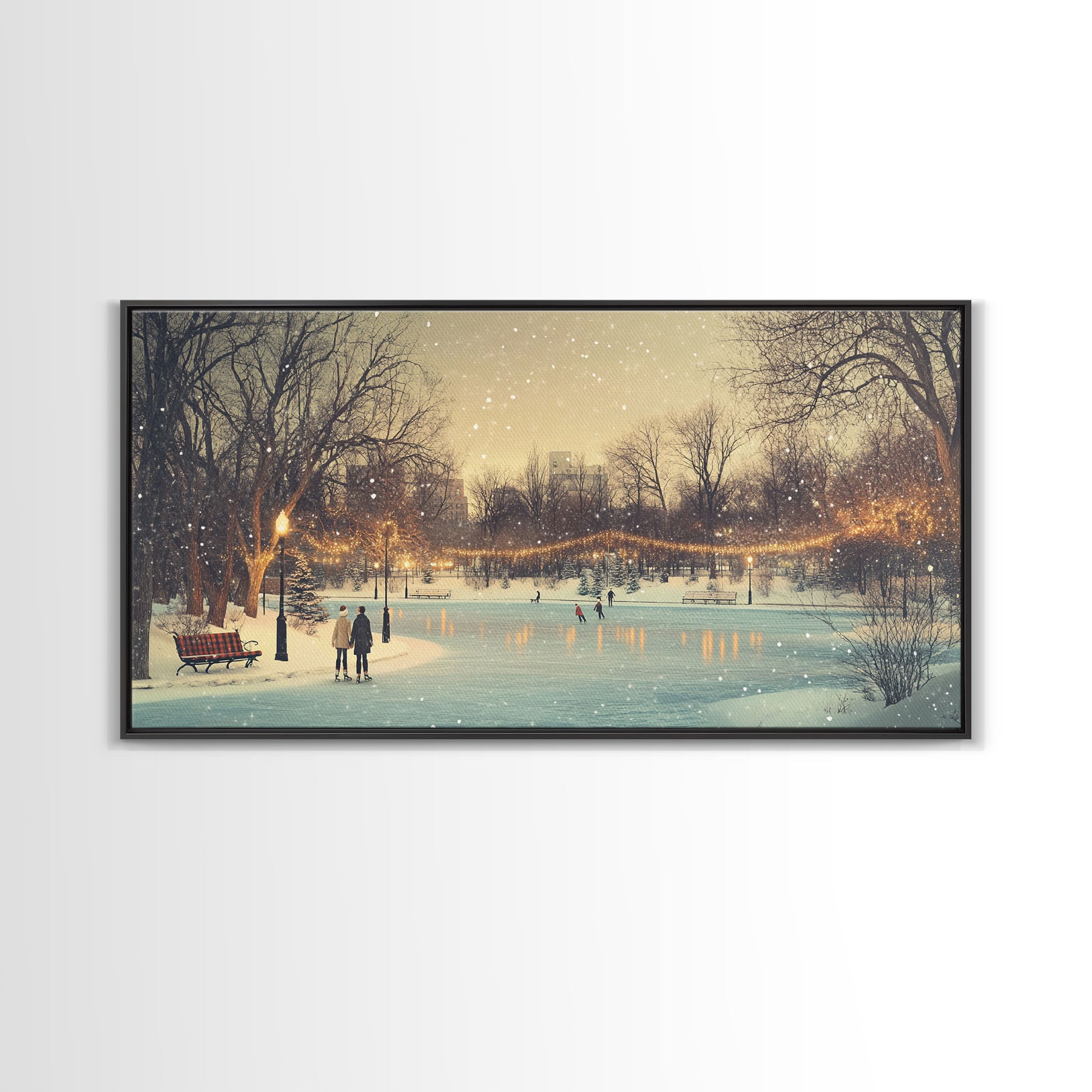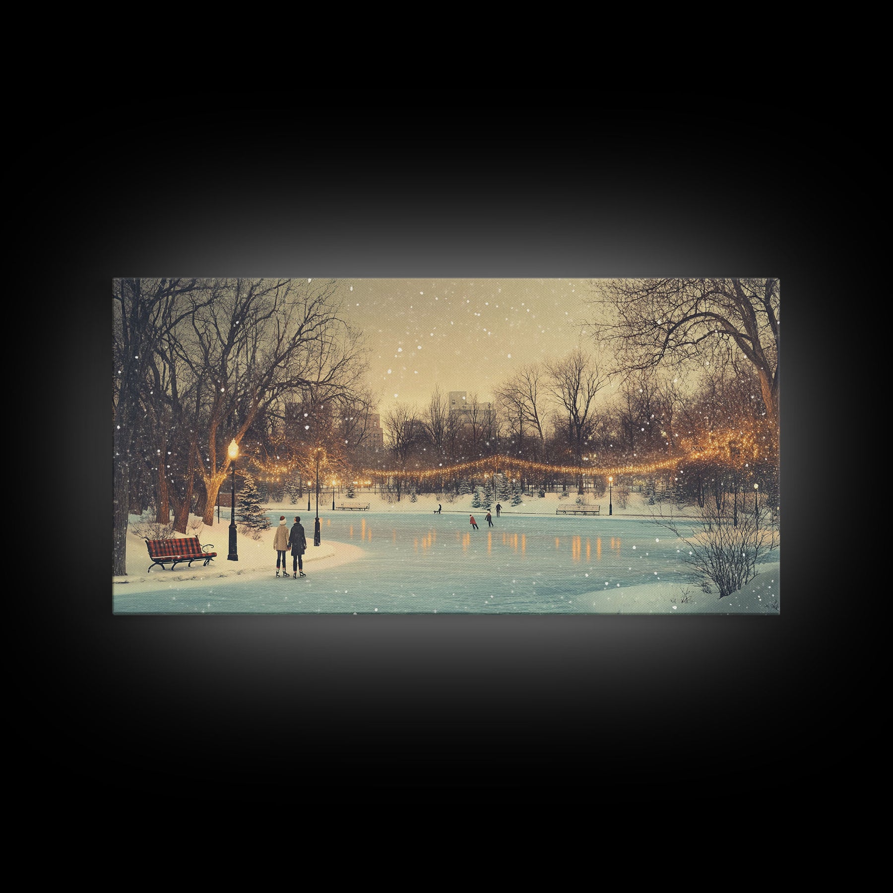 Snowy Ice Skating Framed Canvas Print, Winter Wonderland Scene Art, Vintage Christmas Decor, Christmas Vacation Art, Best Holiday Wall Art