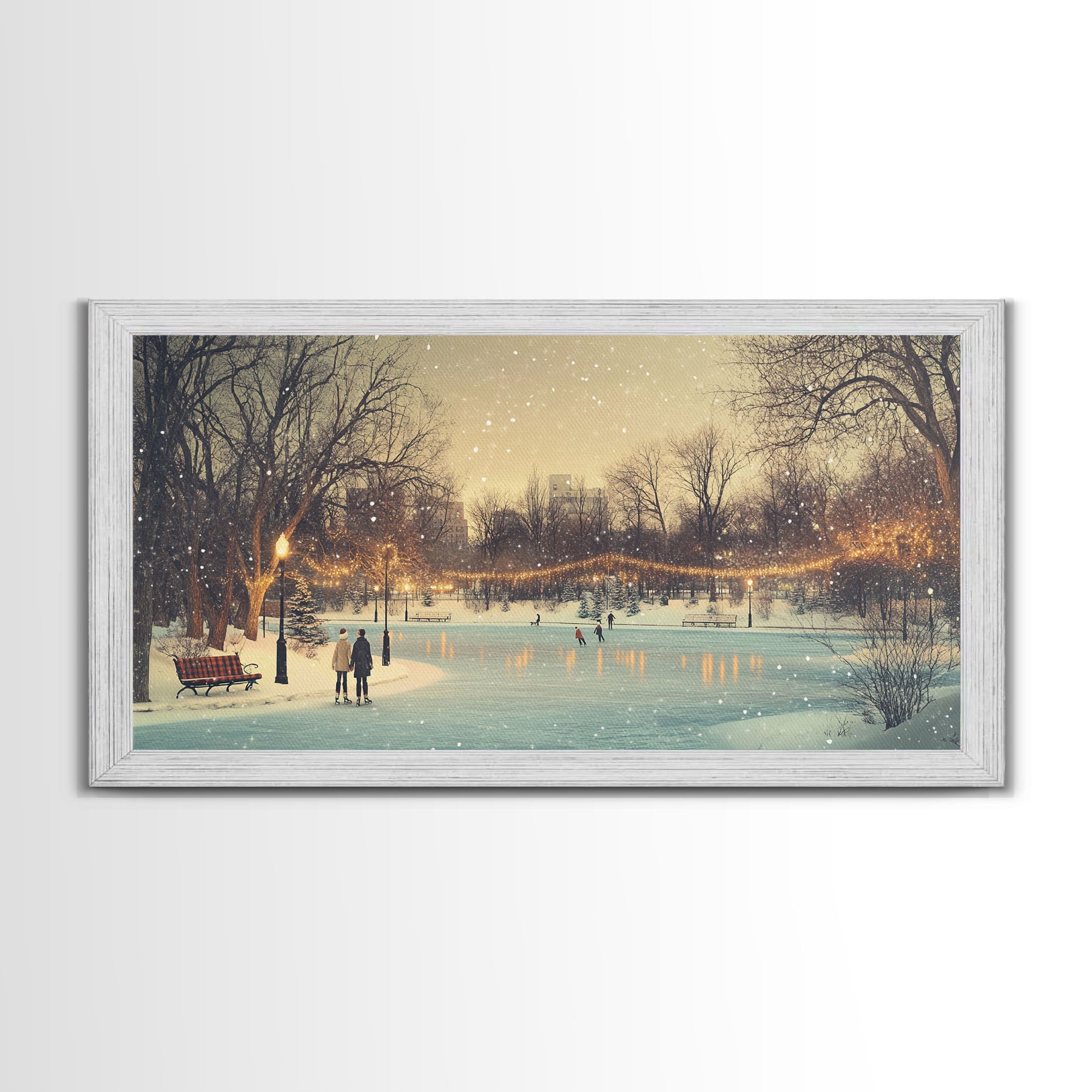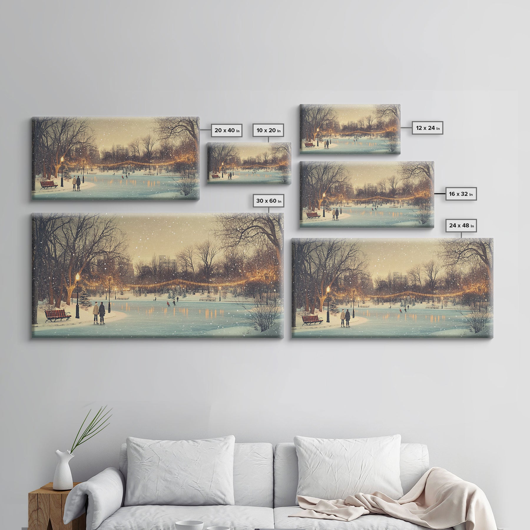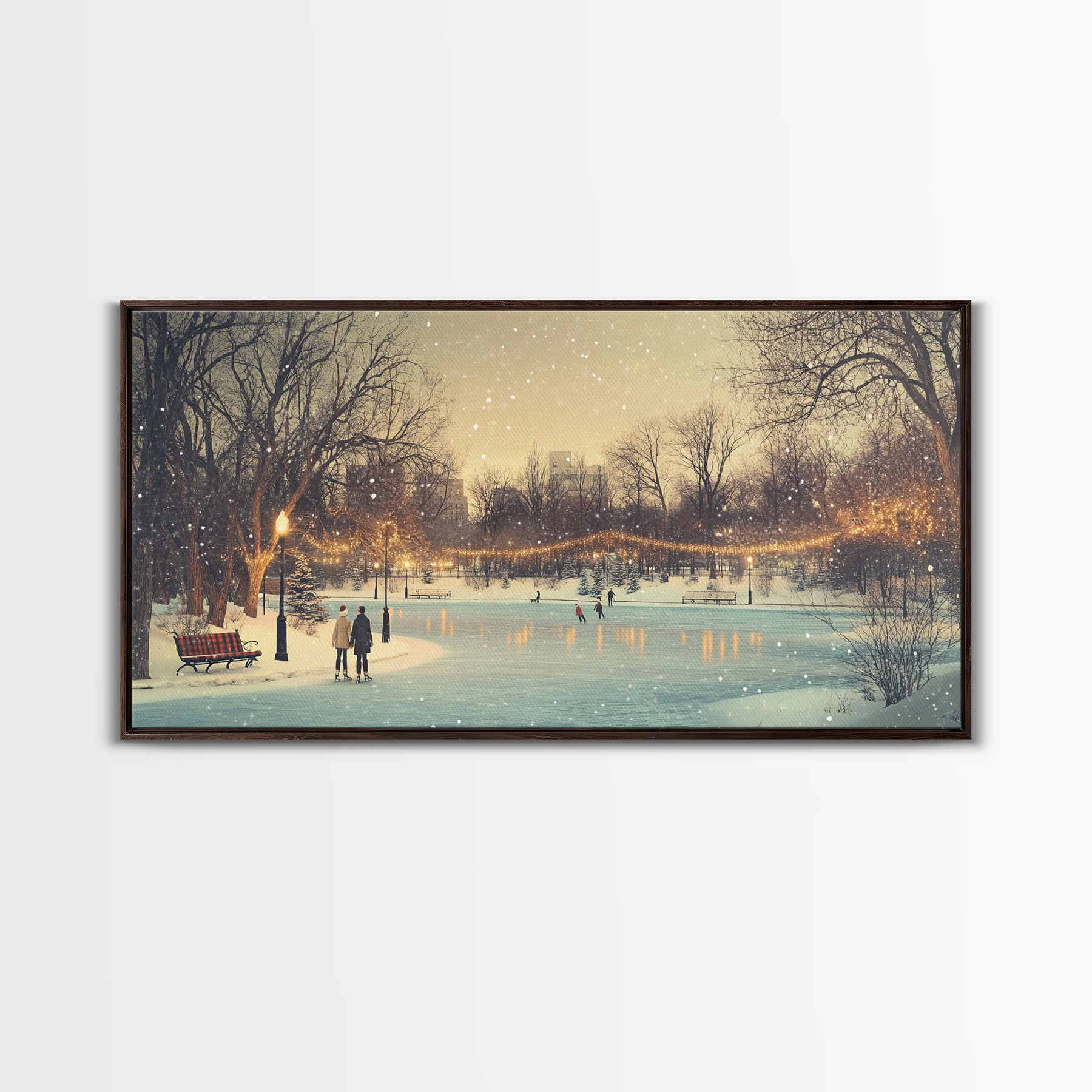 Snowy Ice Skating Framed Canvas Print, Winter Wonderland Scene Art, Vintage Christmas Decor, Christmas Vacation Art, Best Holiday Wall Art