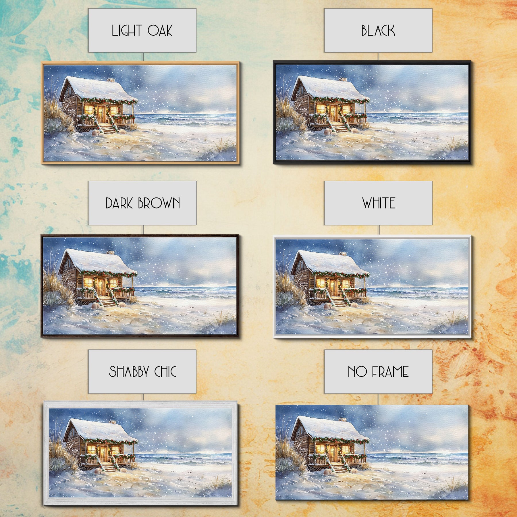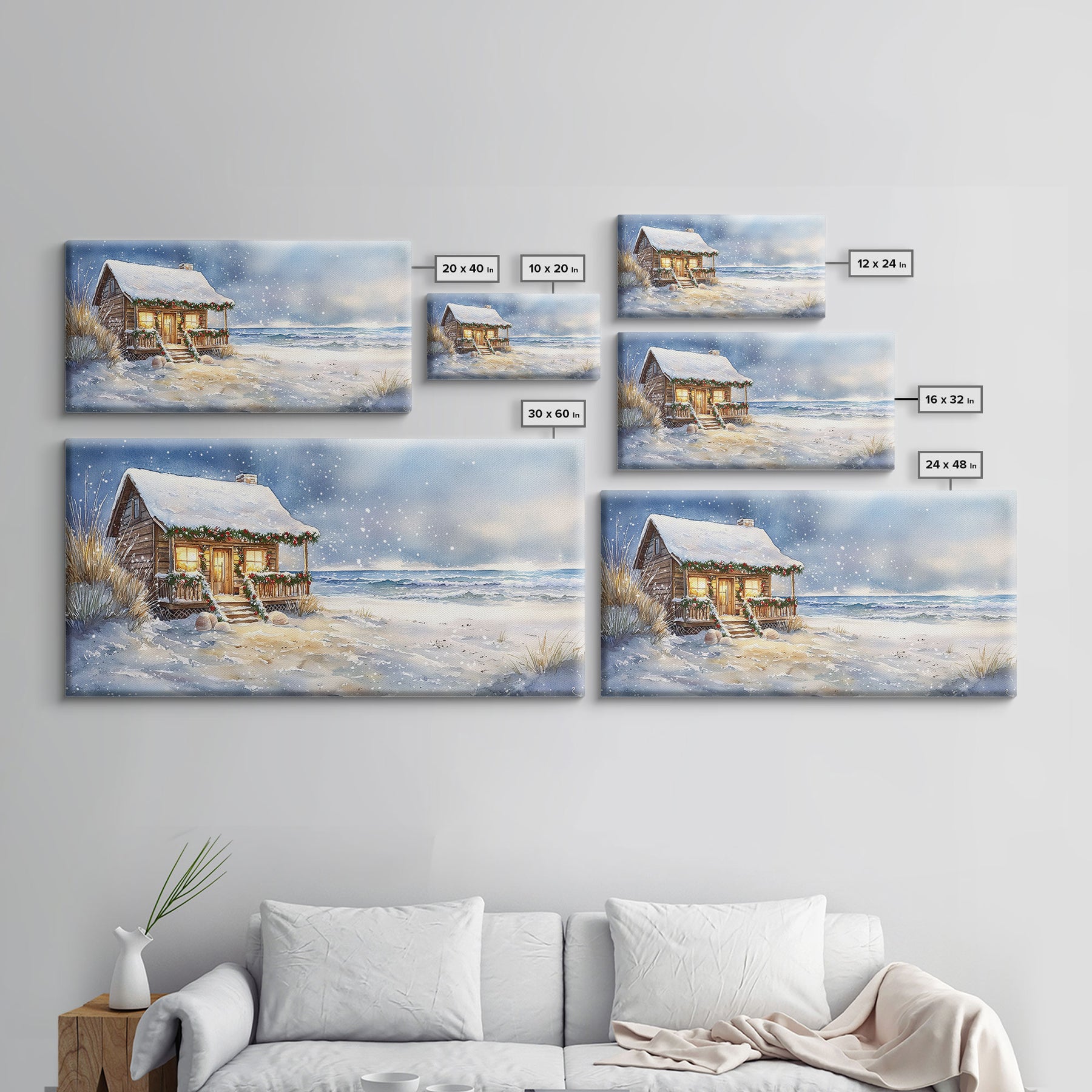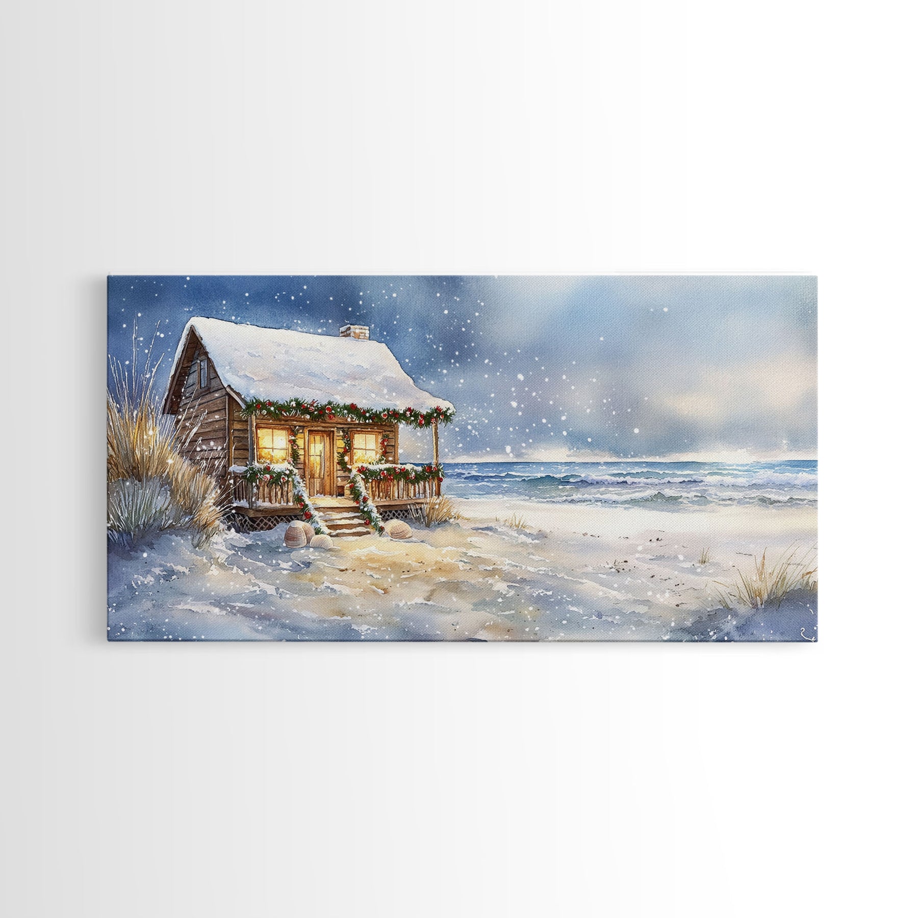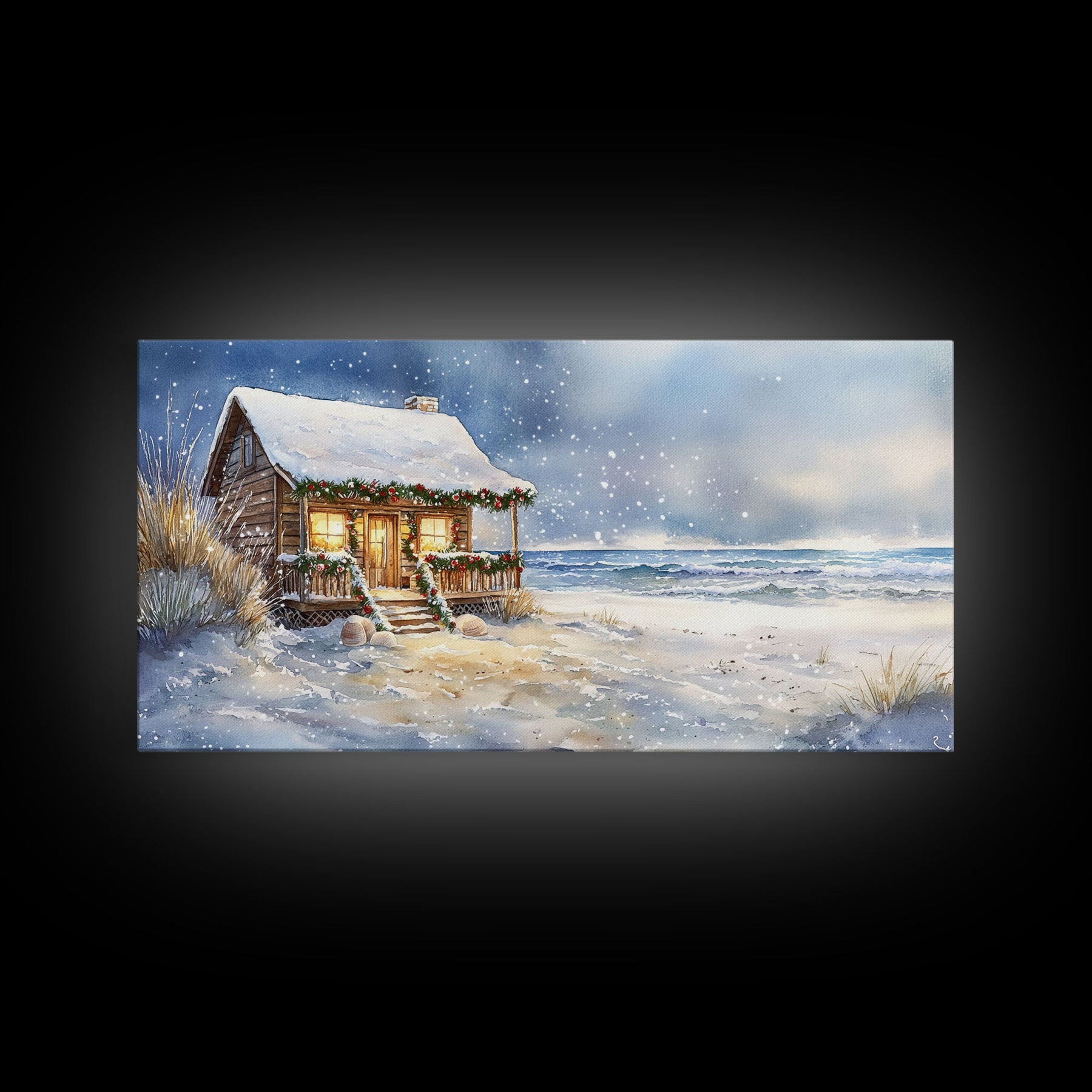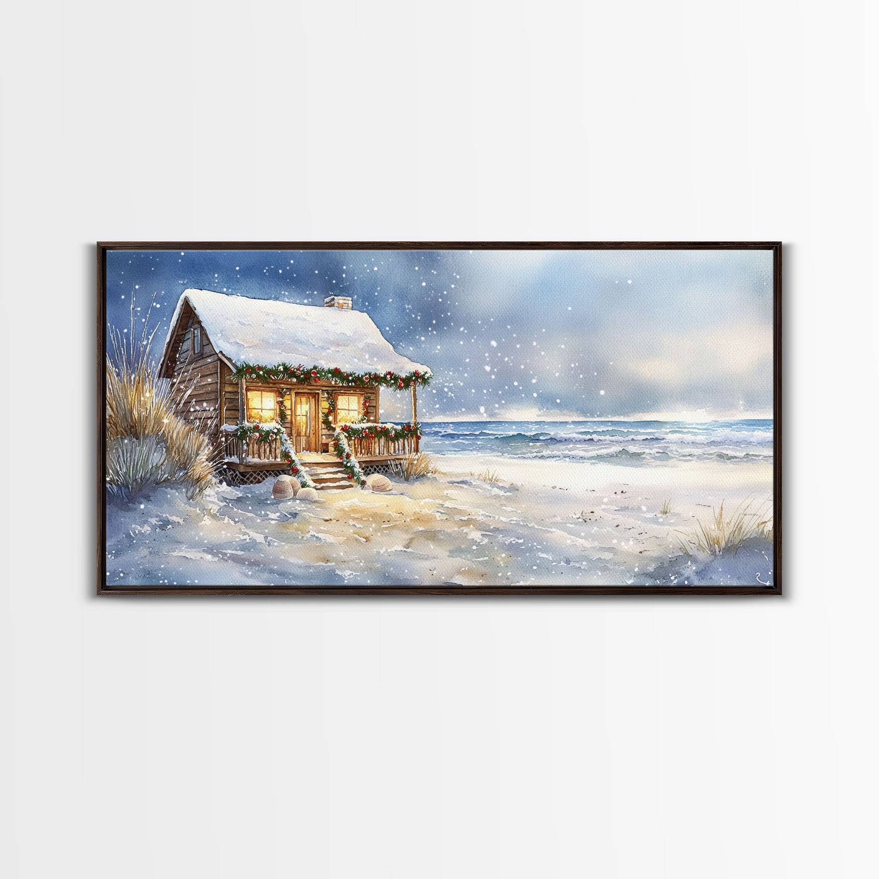 Coastal Winter Cottage Snowy Christmas Scene With Framed Canvas Print, Winter Wonderland Beach House Christmas Decor Wall Art