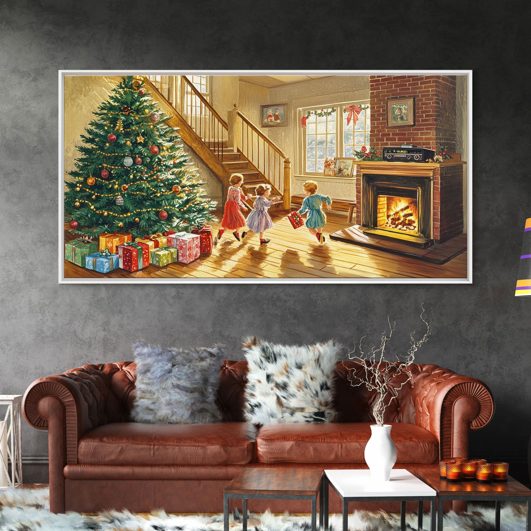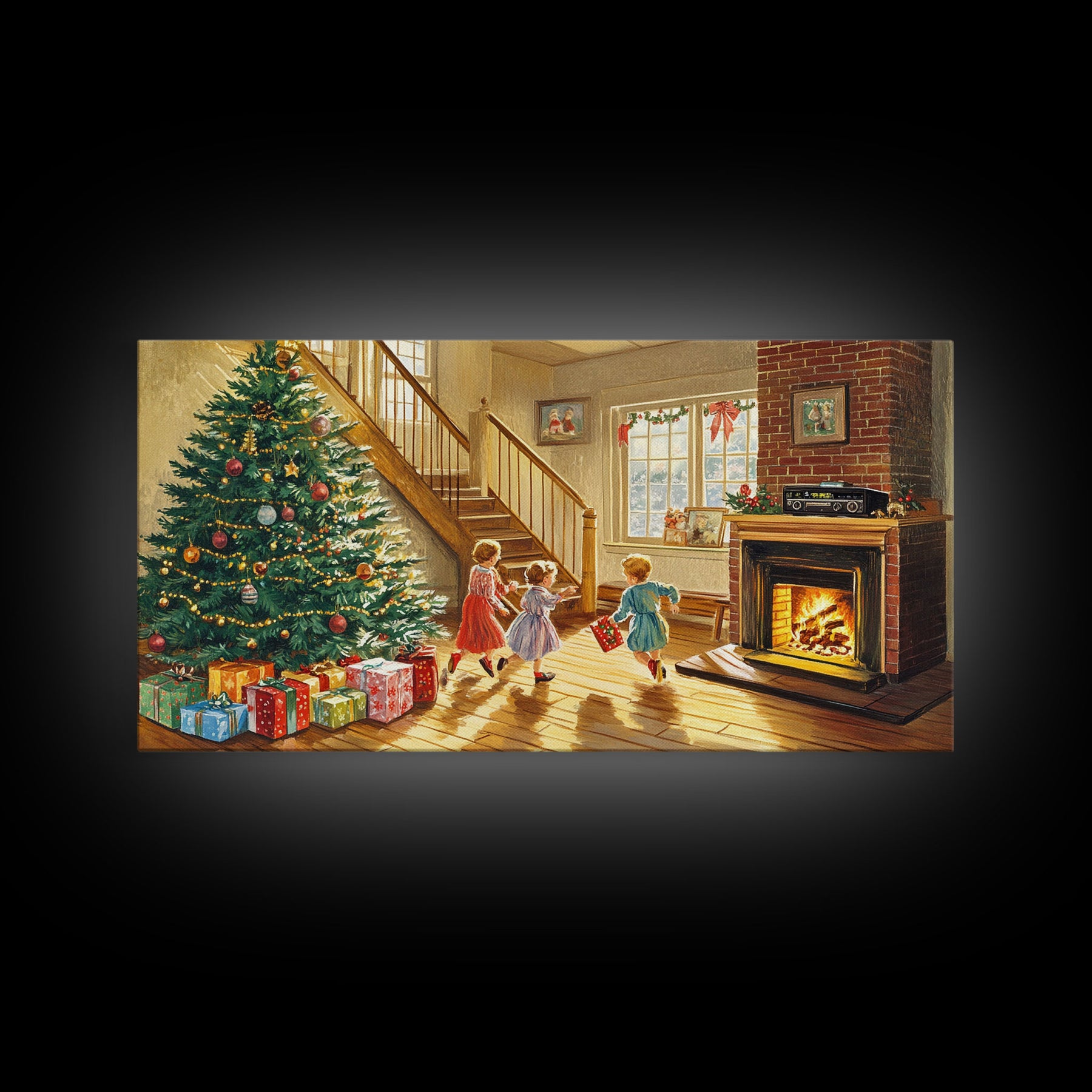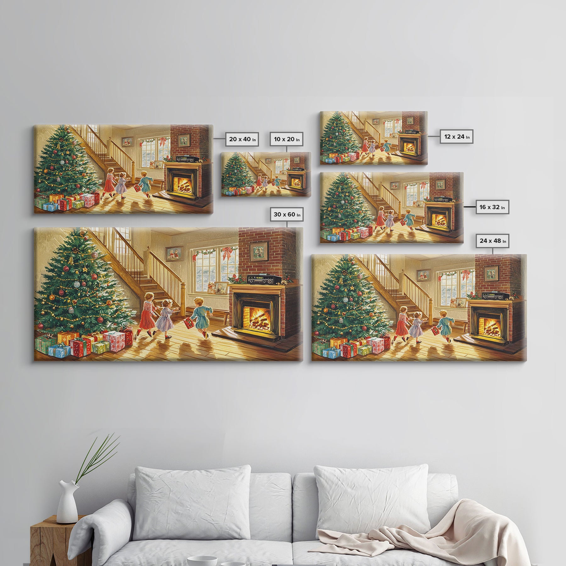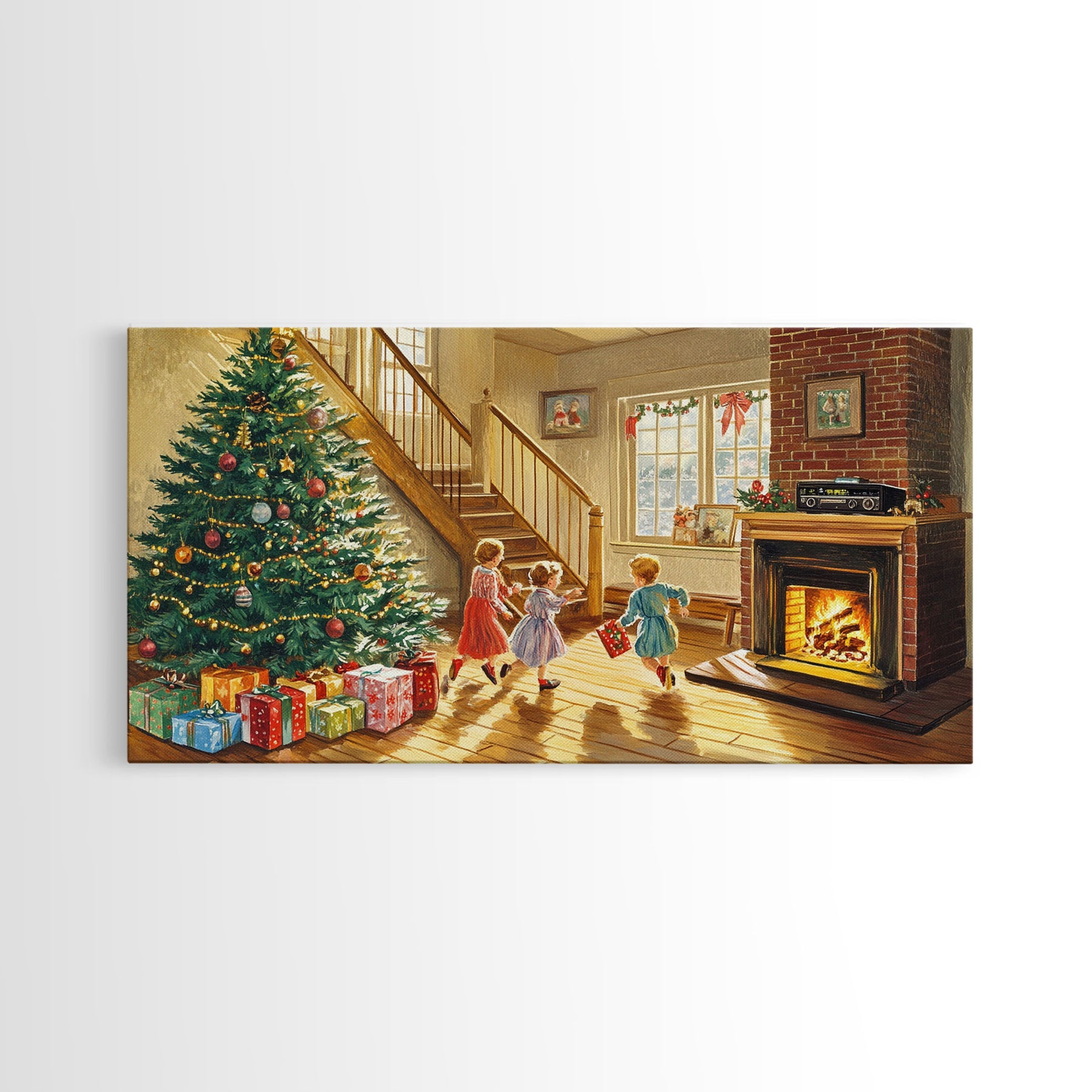 Cozy Christmas living room scene with tree and presents, vintage holiday decor, canvas print, Christmas wall art, Christmas decor