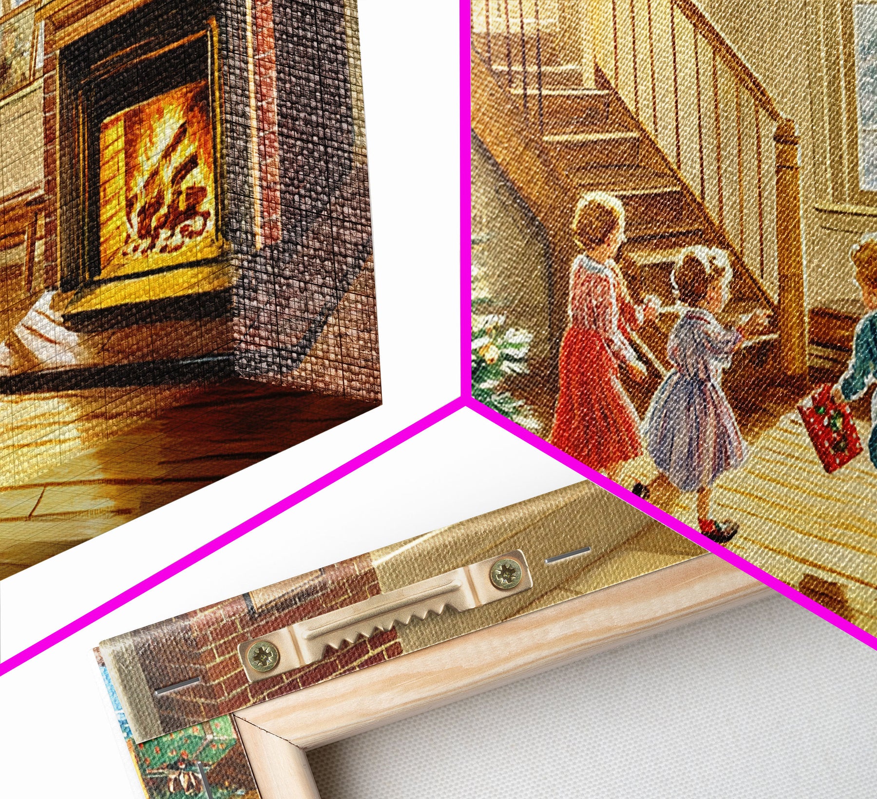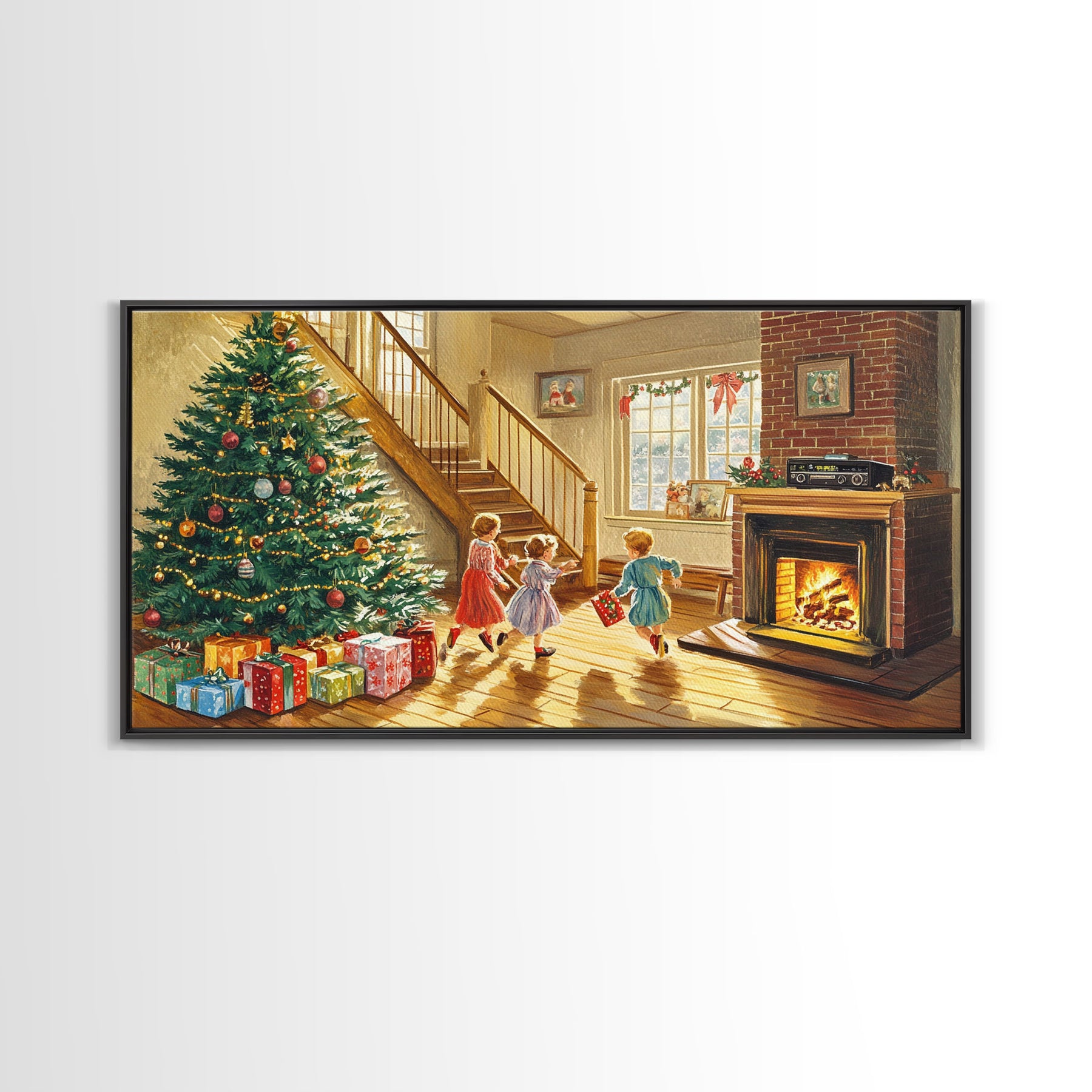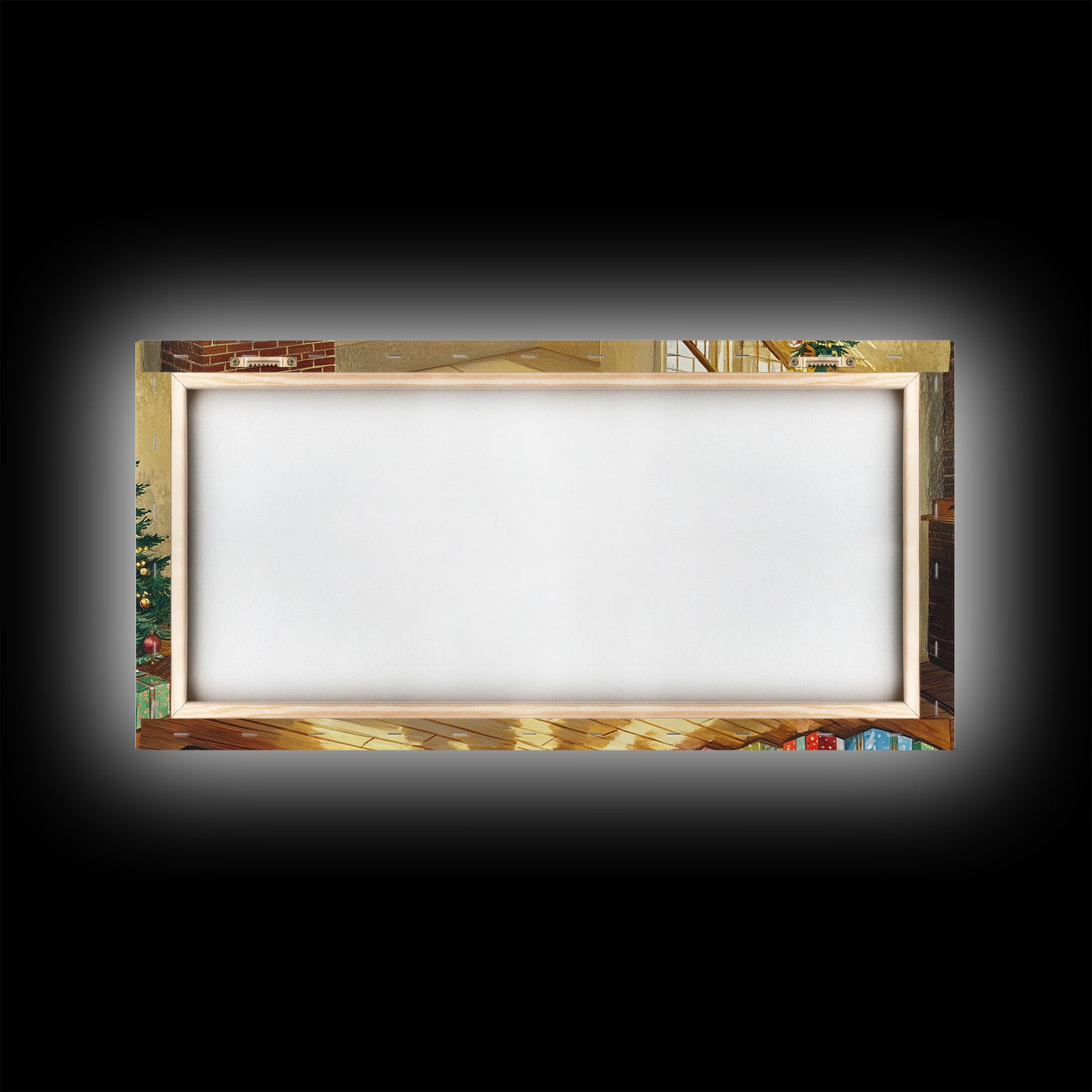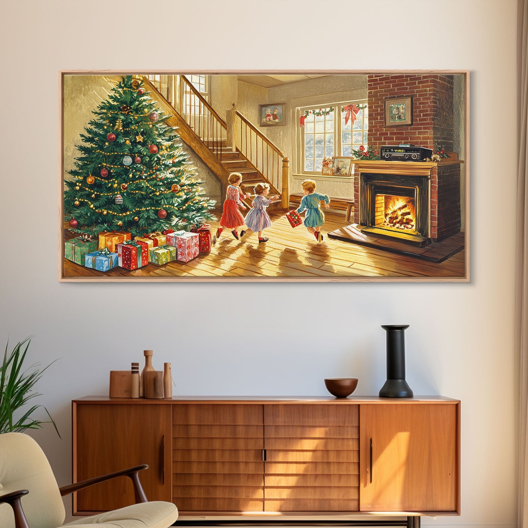 Cozy Christmas living room scene with tree and presents, vintage holiday decor, canvas print, Christmas wall art, Christmas decor