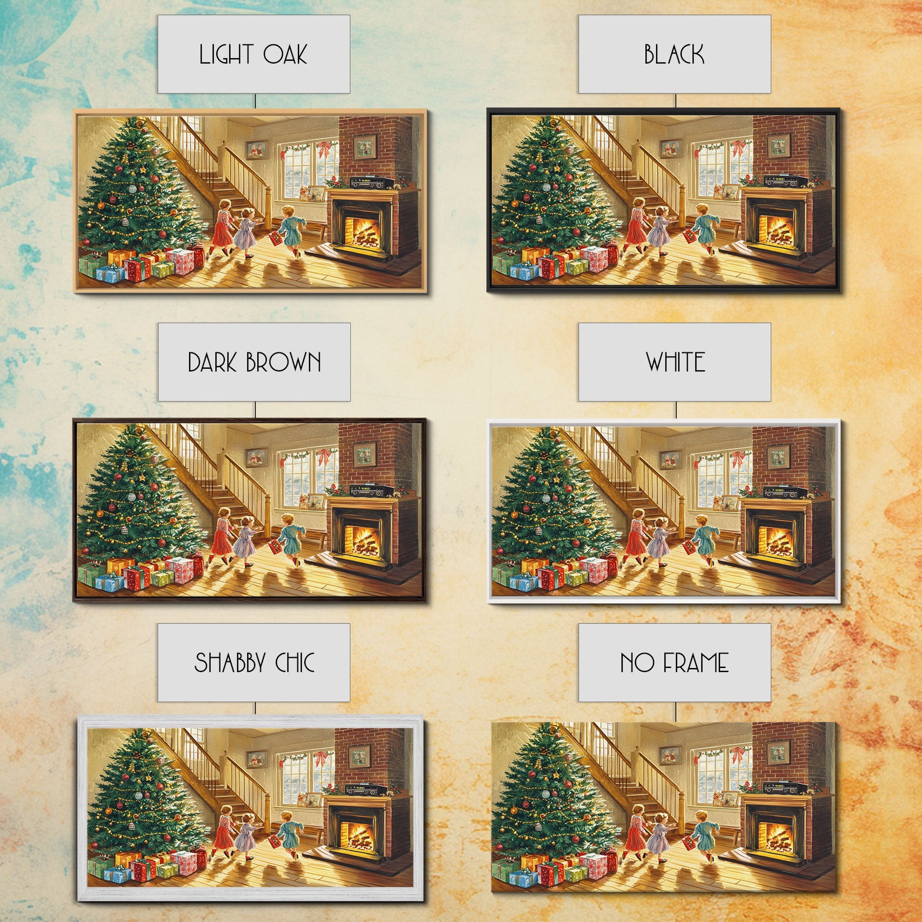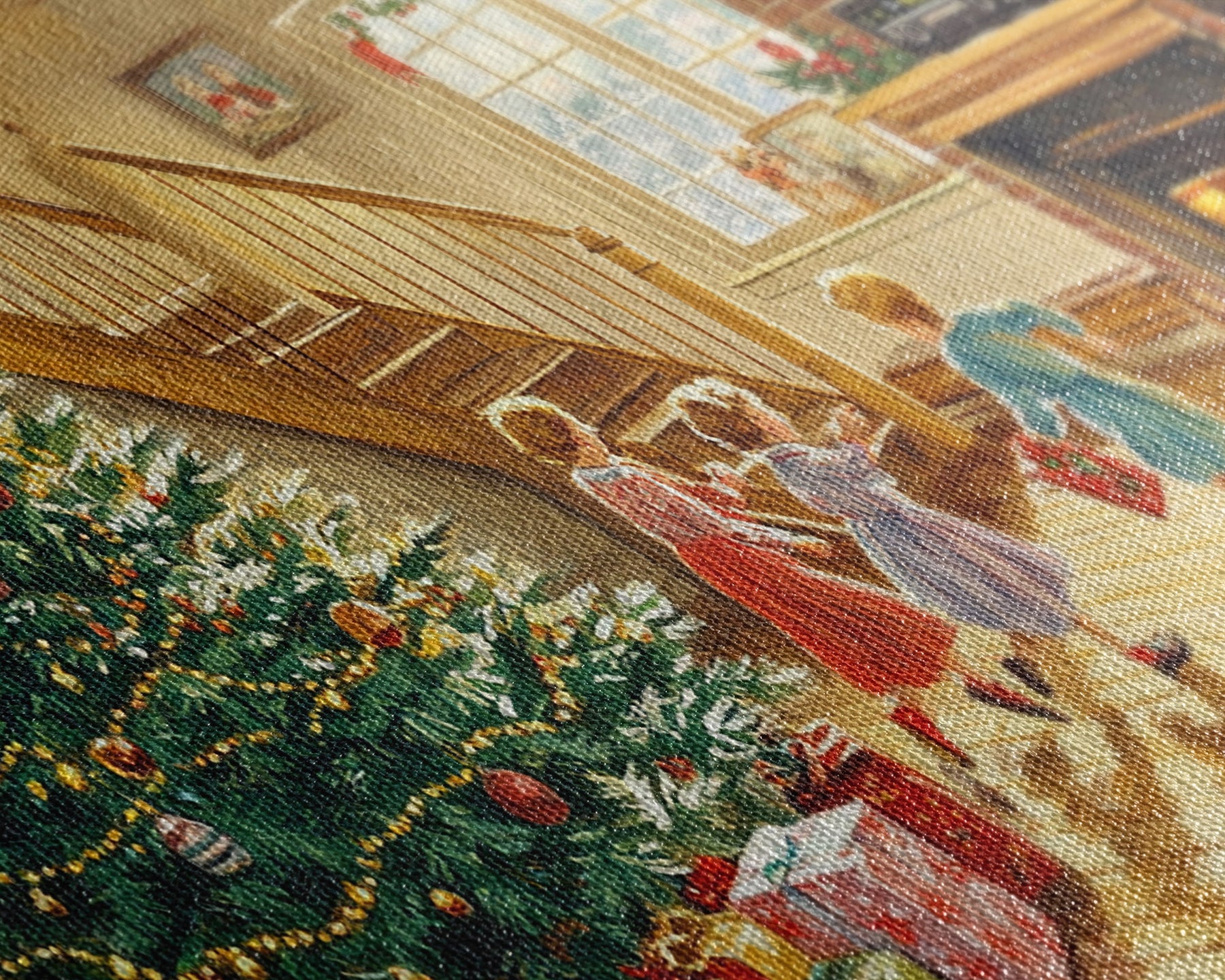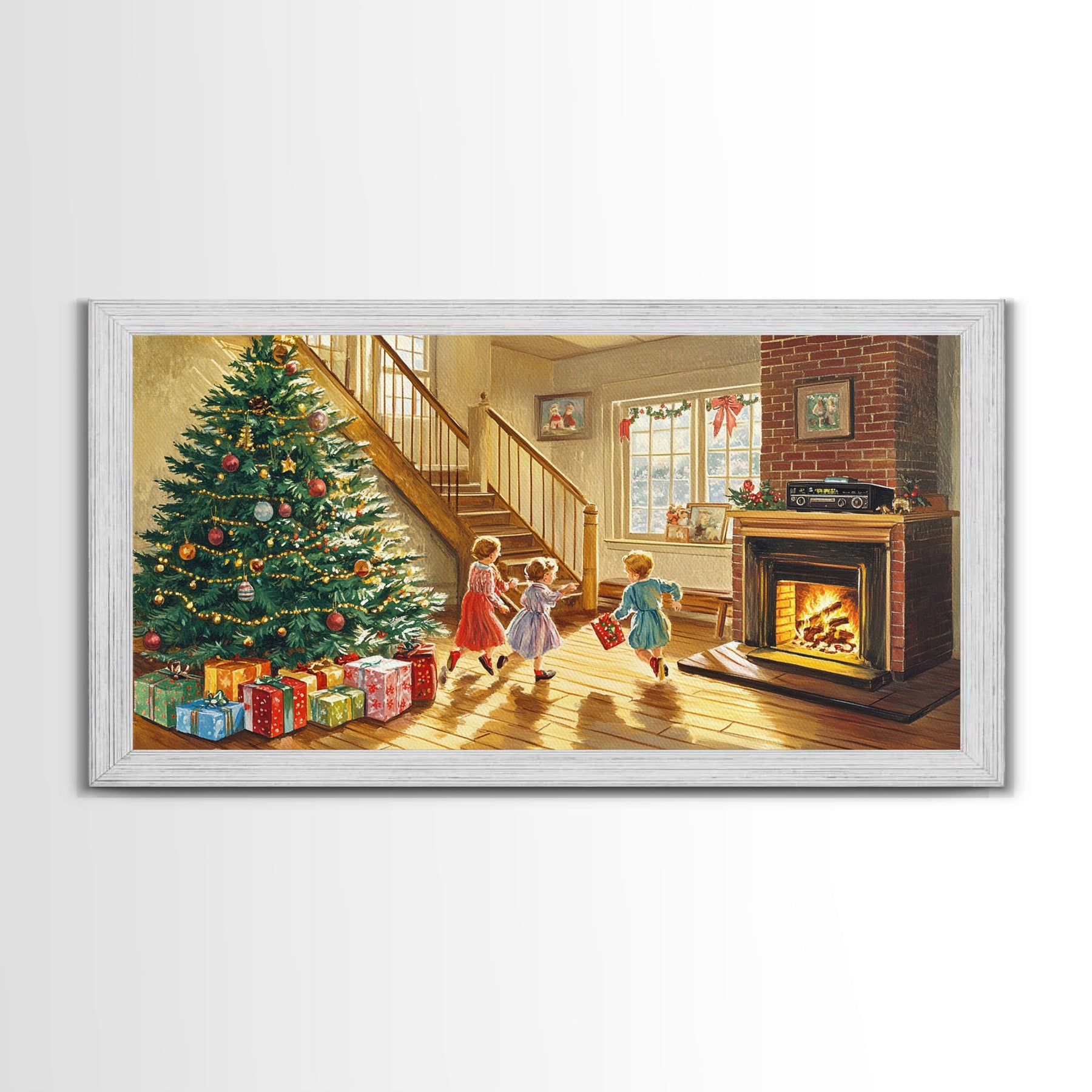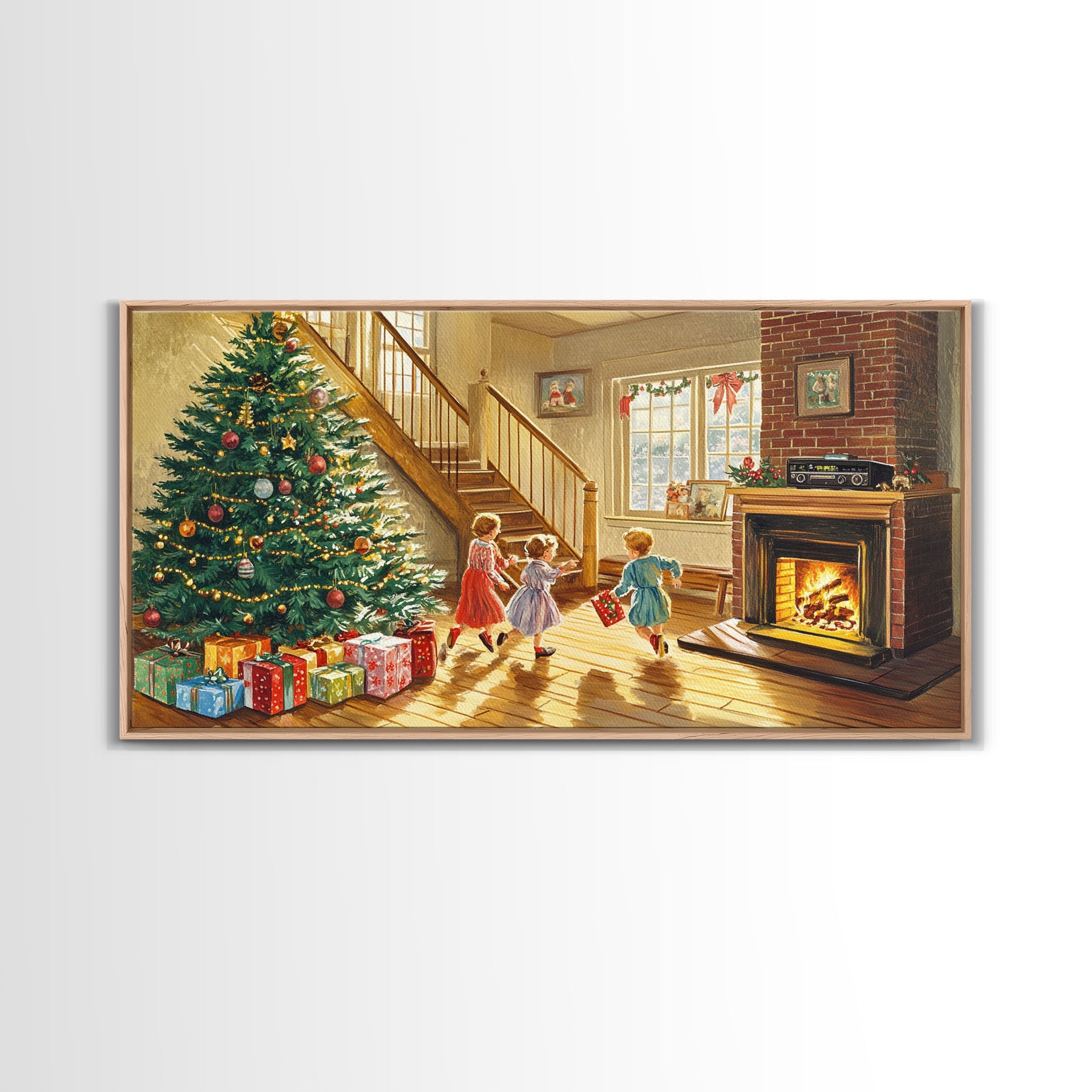 Cozy Christmas living room scene with tree and presents, vintage holiday decor, canvas print, Christmas wall art, Christmas decor