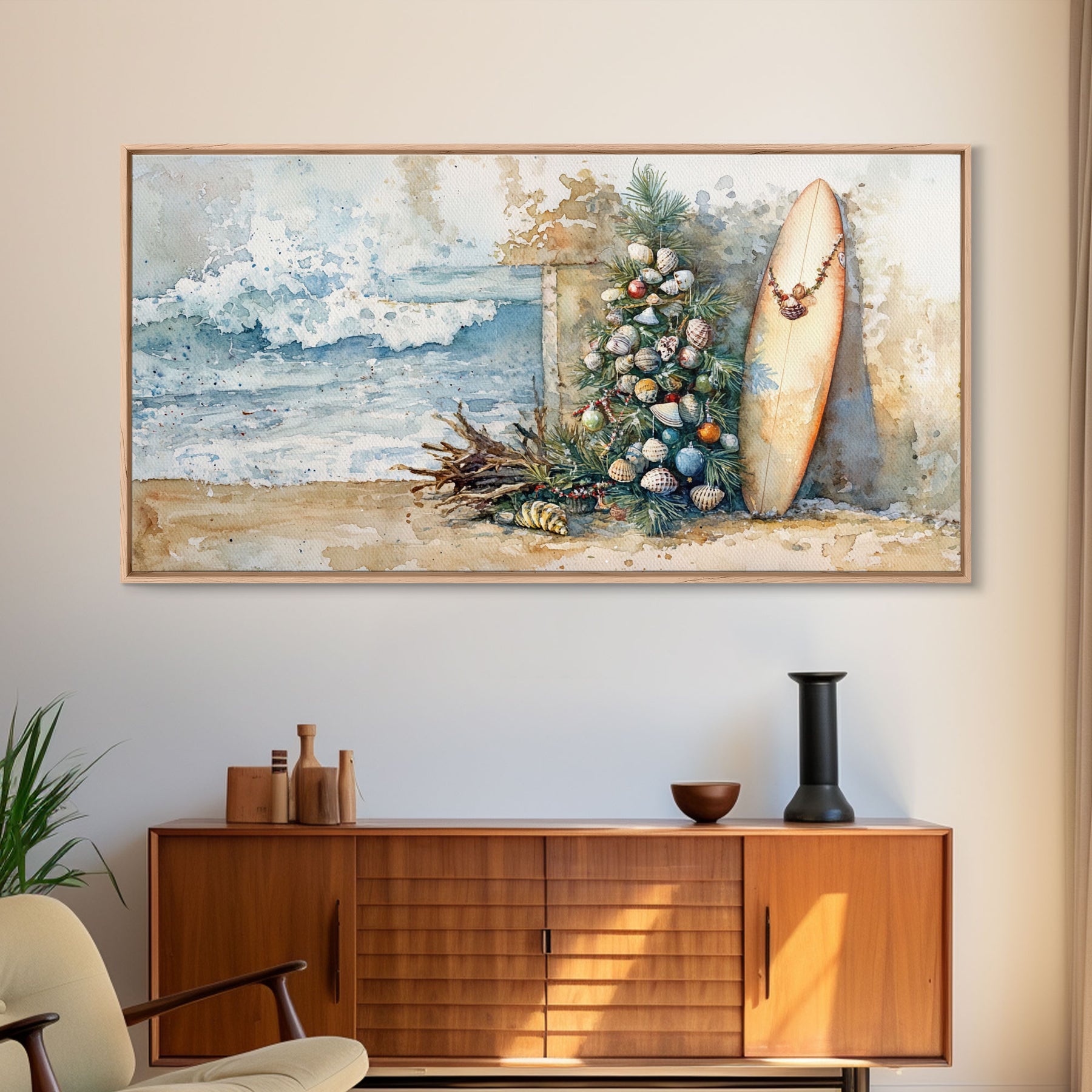 Coastal Christmas Scene Surfboards Christmas Tree Framed Canvas Print, Beach Holiday Decor Wall Art With Surfing Theme