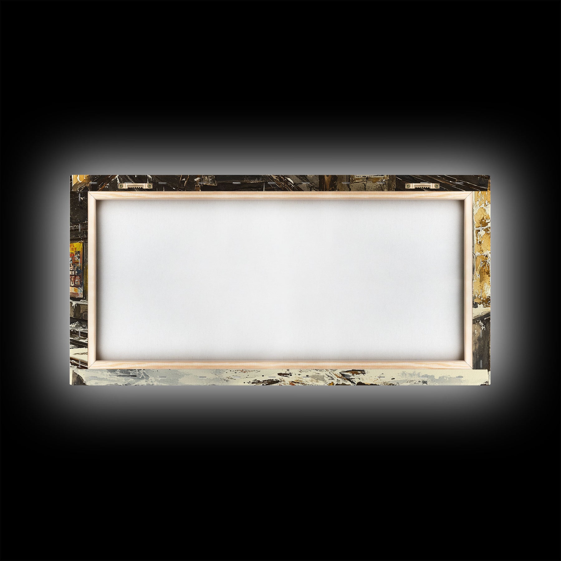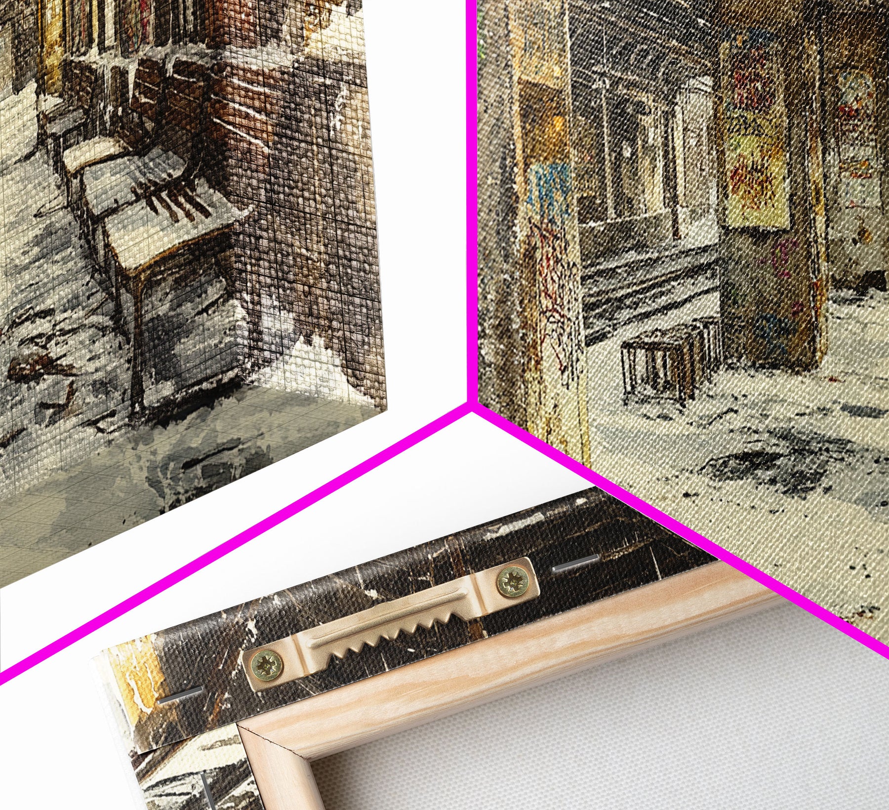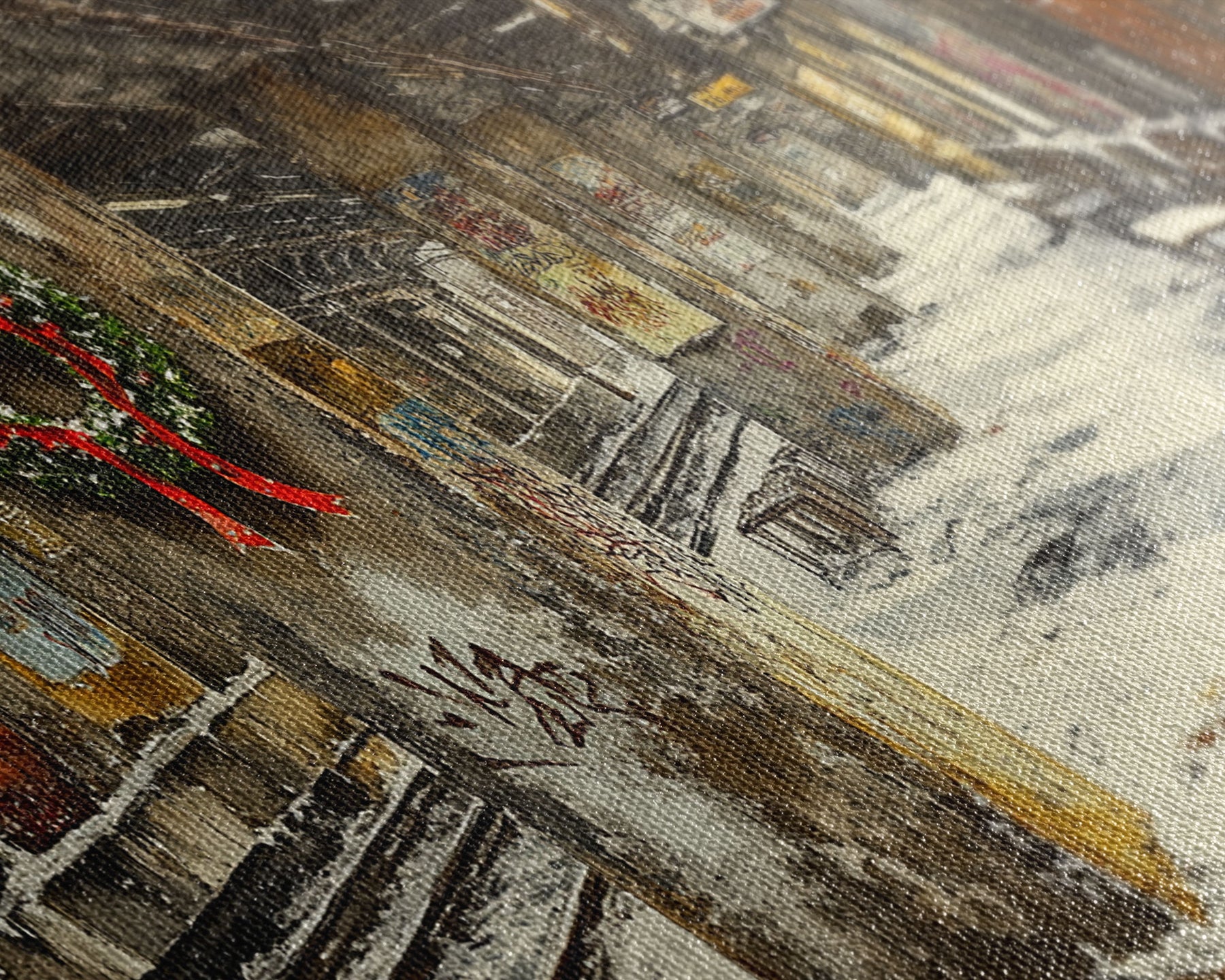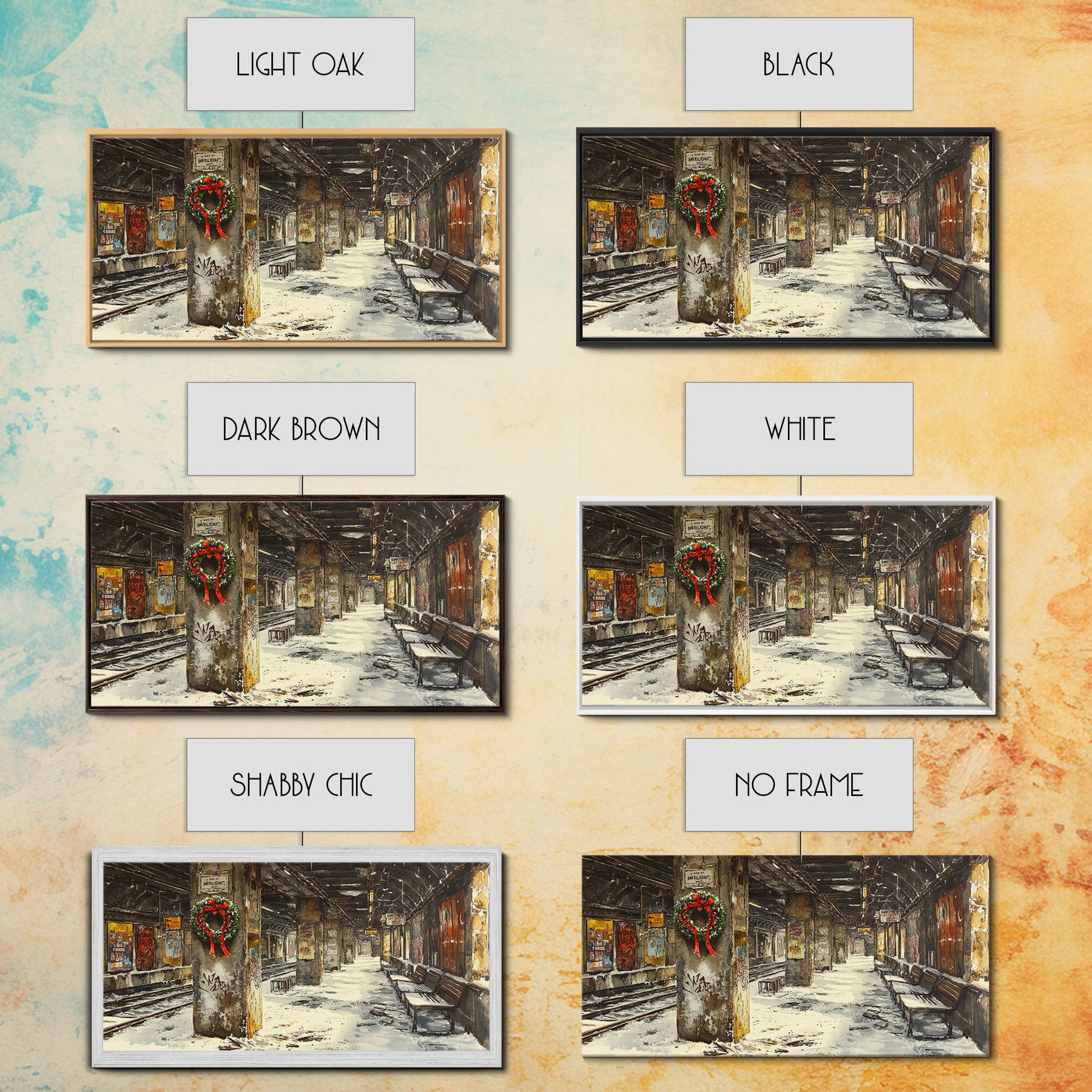 Underground subway station winter scene framed canvas print, snowy platform with festive wreath and urban decay, Christmas display