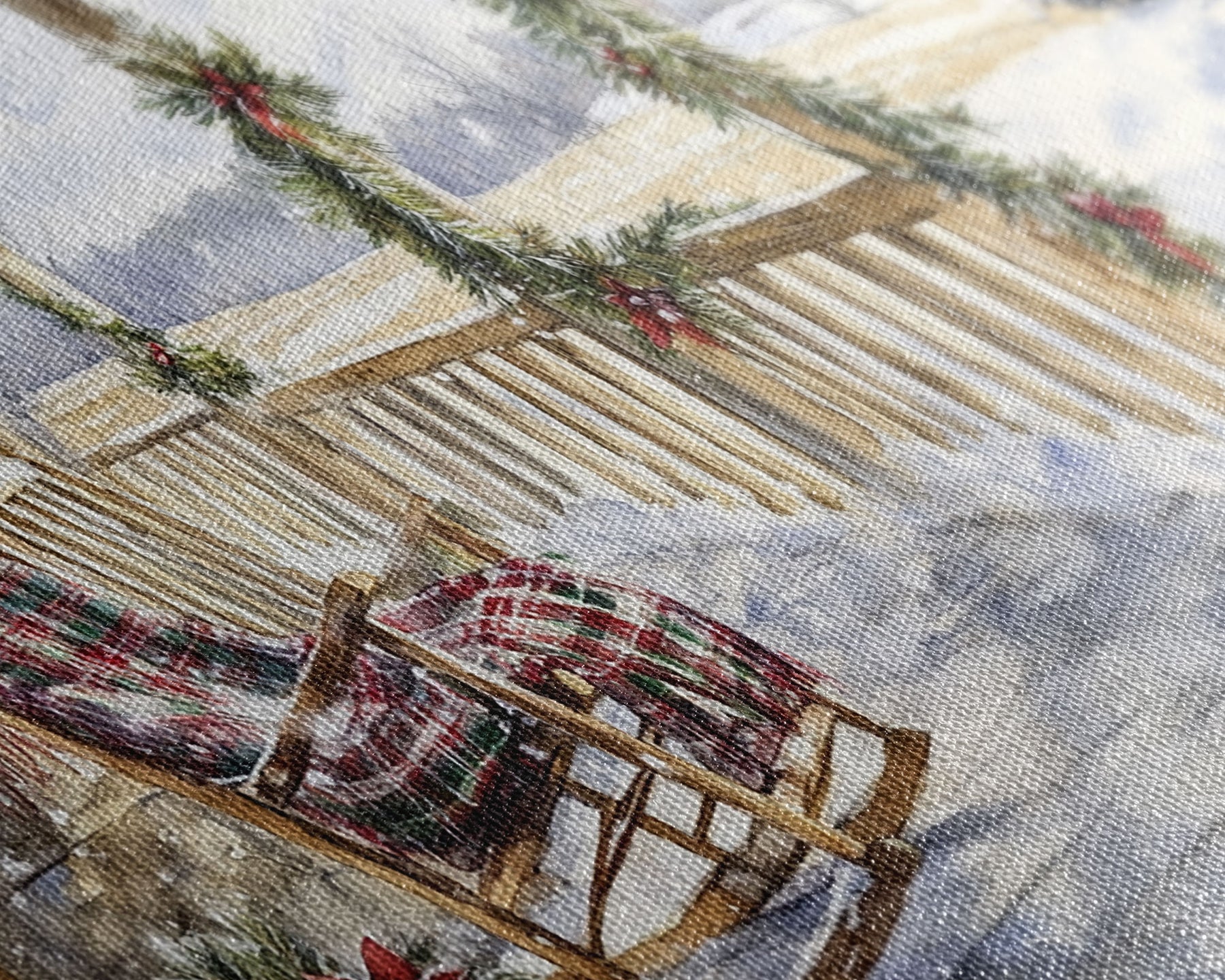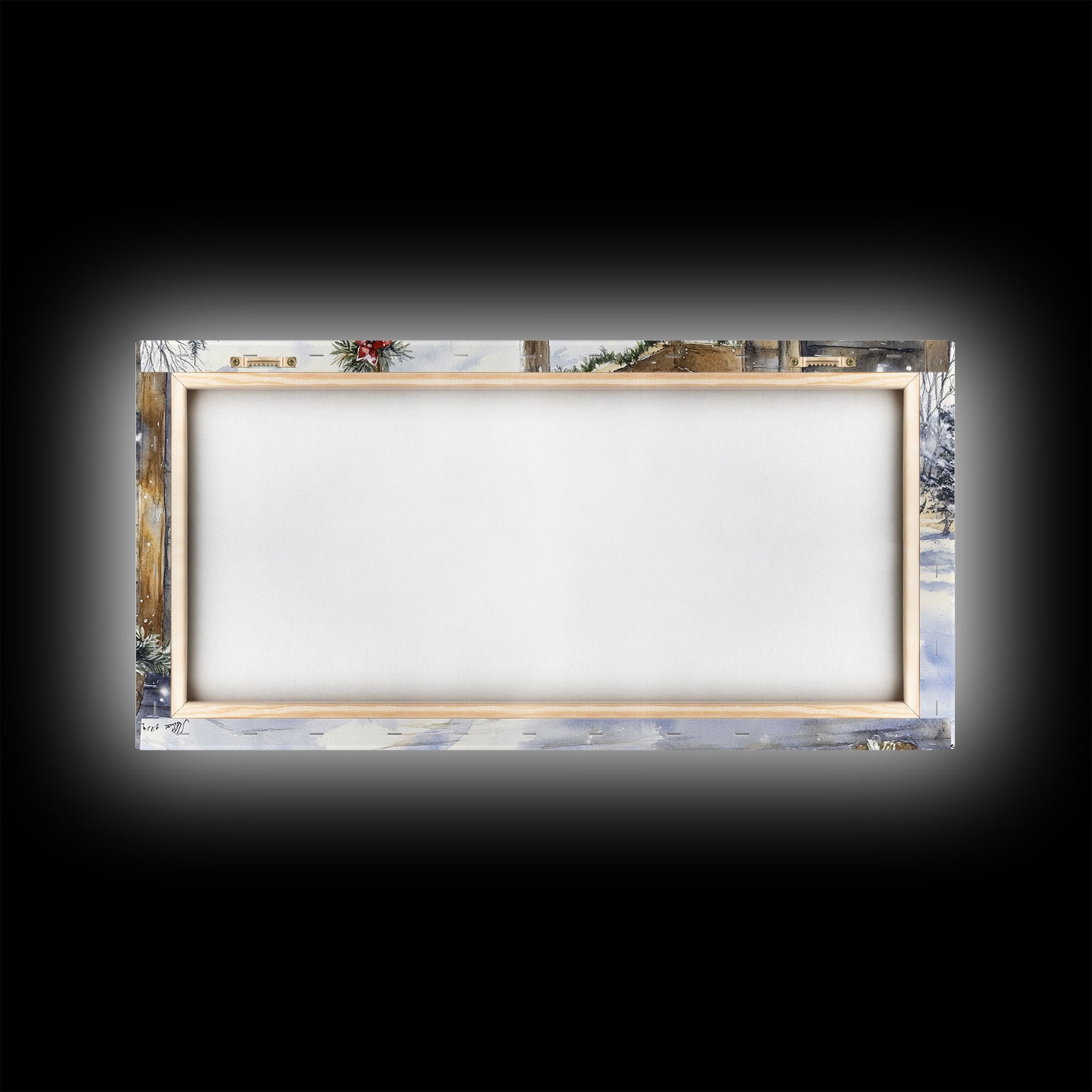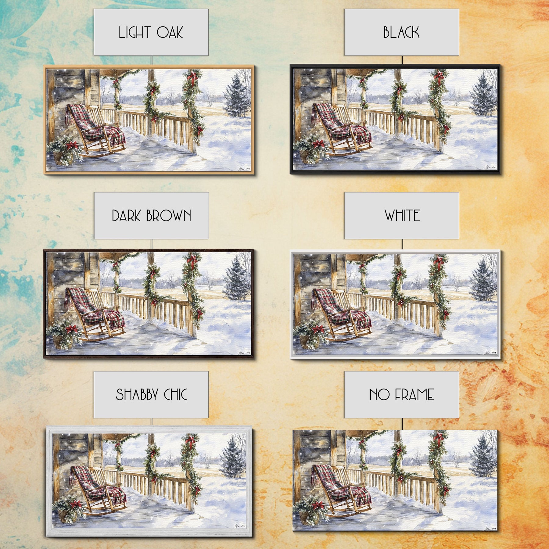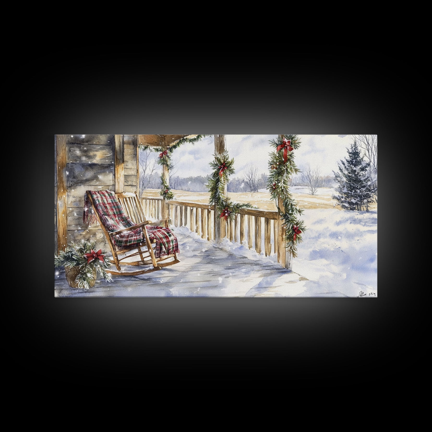 Snowy porch scene with wreaths and holiday greenery, framed canvas print, cozy winter Christmas decor perfect holiday wall display