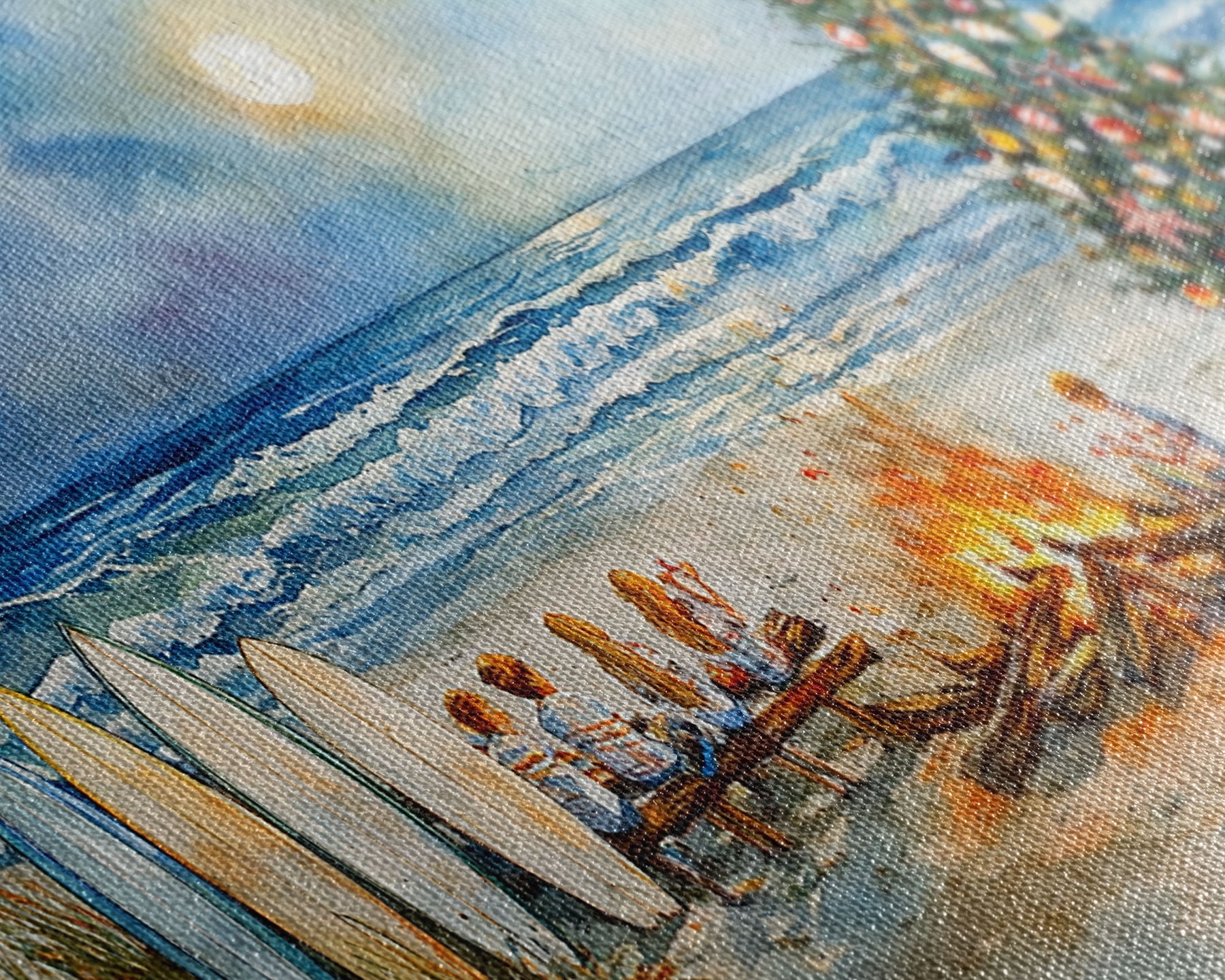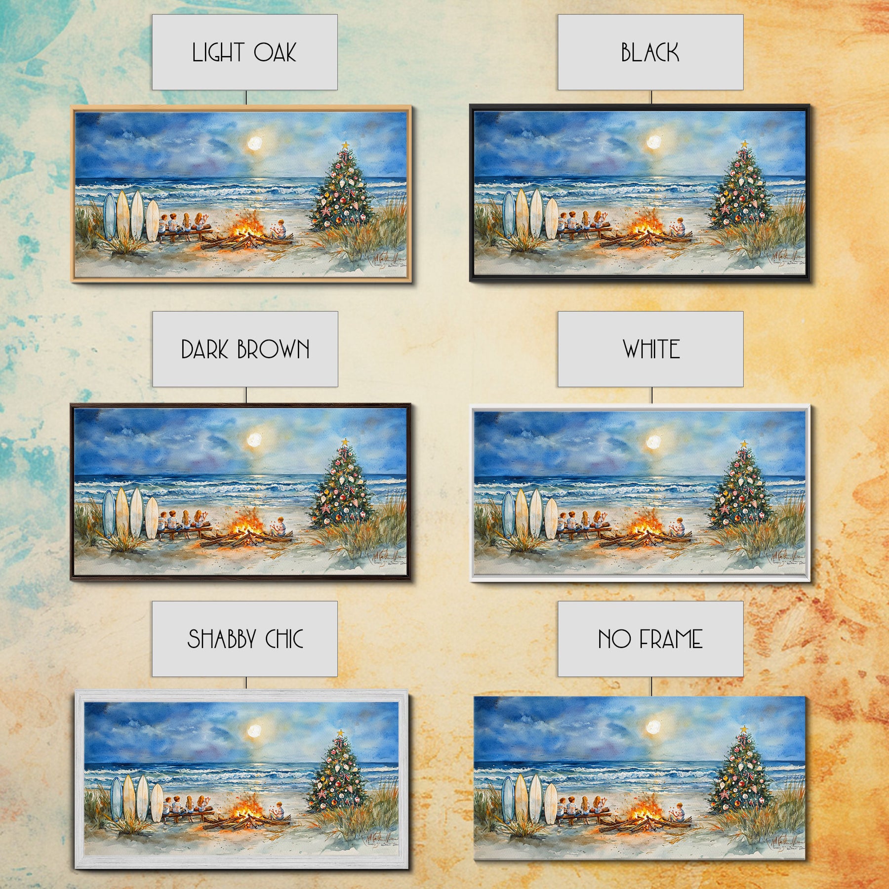 Christmas bonfire on the beach with surfboards and decorated tree, framed canvas print ideal tropical holiday wall art decor