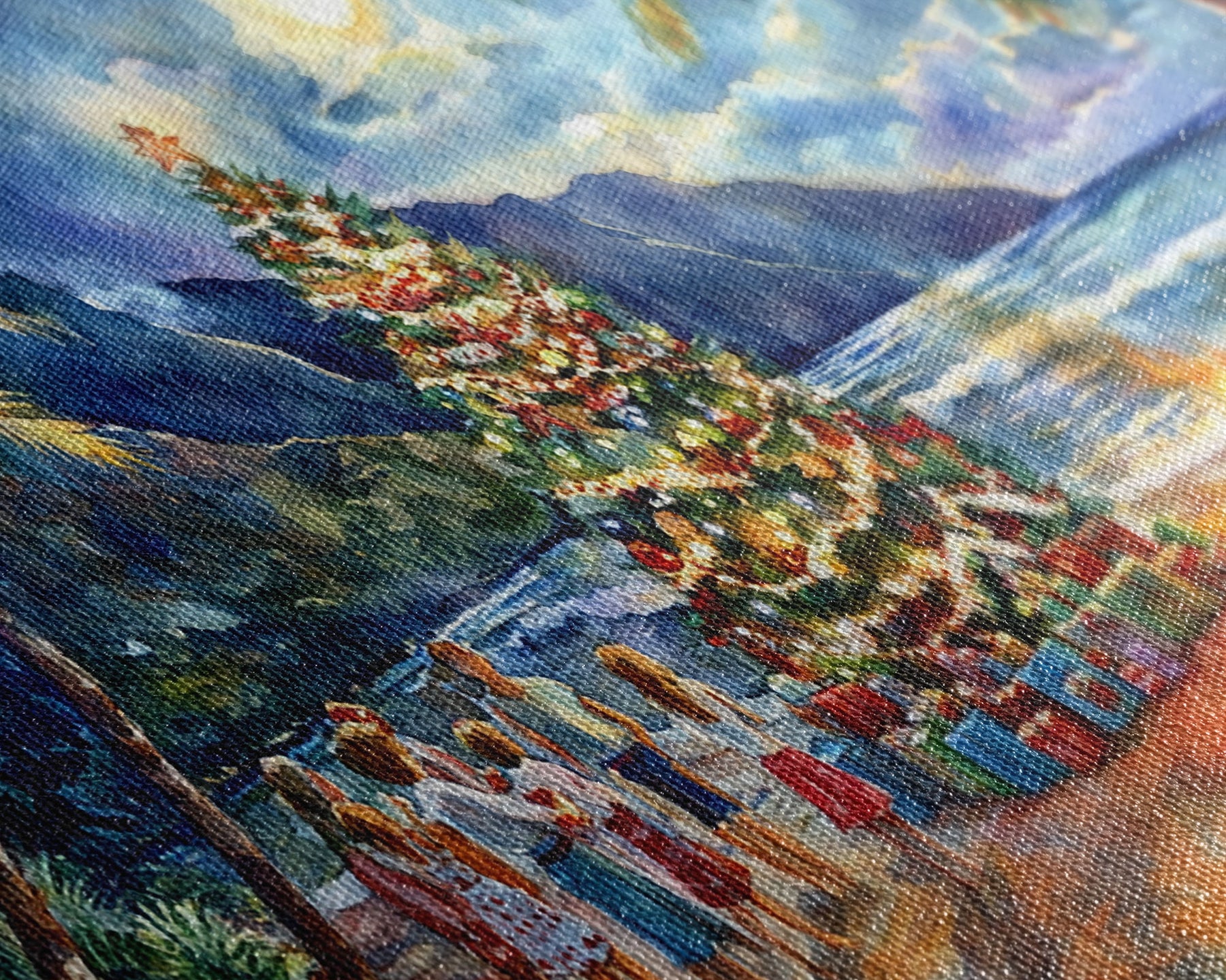 Most of our canvases are made in the USA, with the exception of canvases ordered with the light oak unstained frames, and any large canvases (24x48, 30x60, 16x48 and 20x60) ordered WITH a frame. These are temporarily made in and shipped from Europe, while we try to find a more consistent supplier in the USA.
