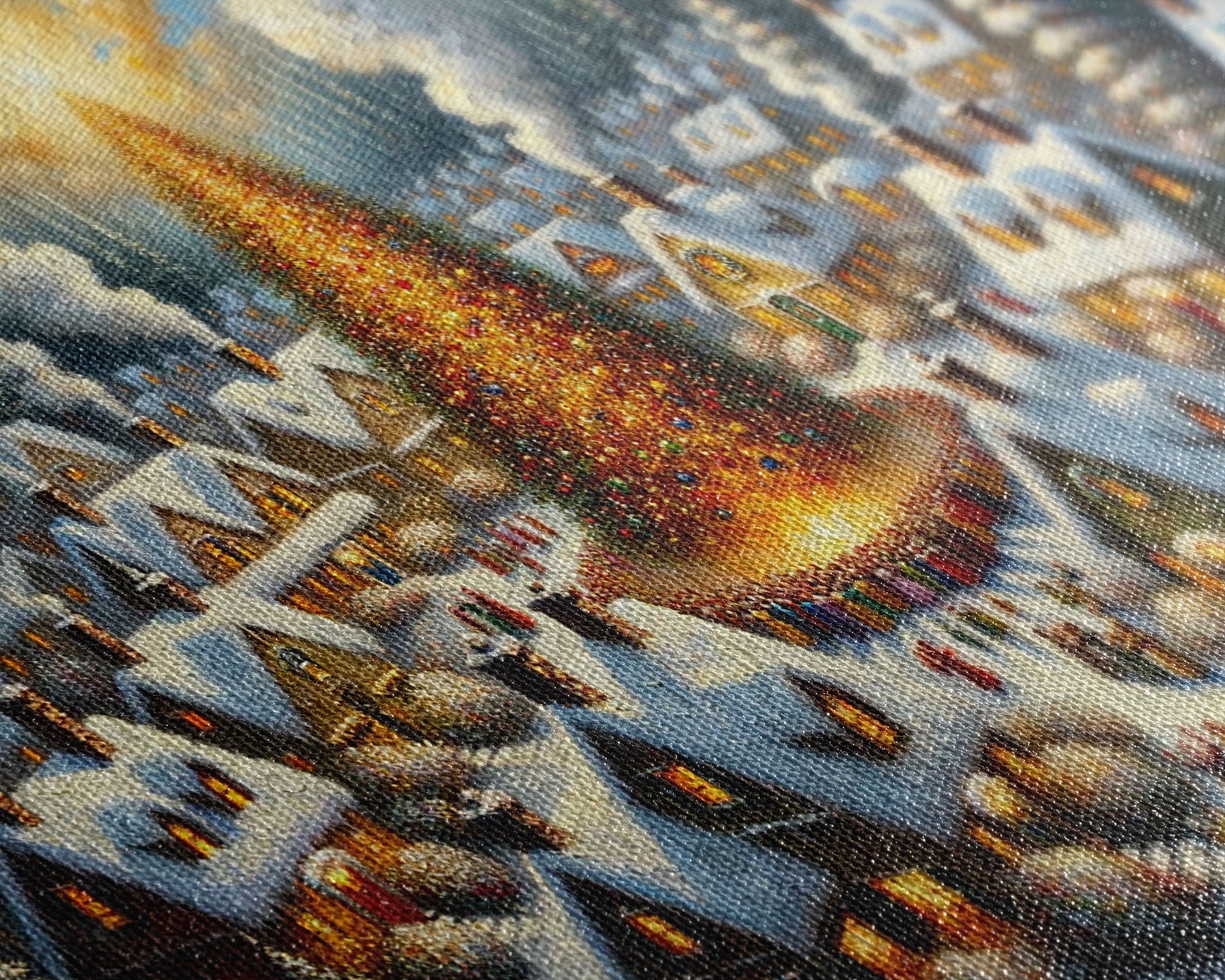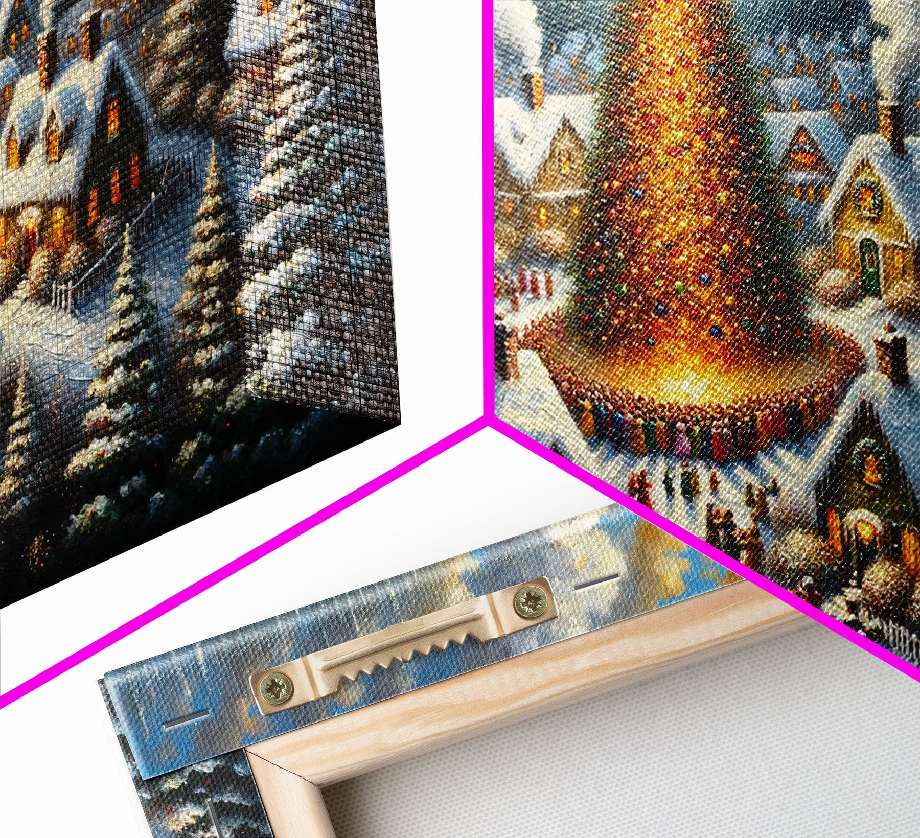 Abstract Christmas Village Centerpiece Wall Art | Framed Canvas Print | Christmas Oil Painting Winter Wonderland | Retro Farmhouse Christmas