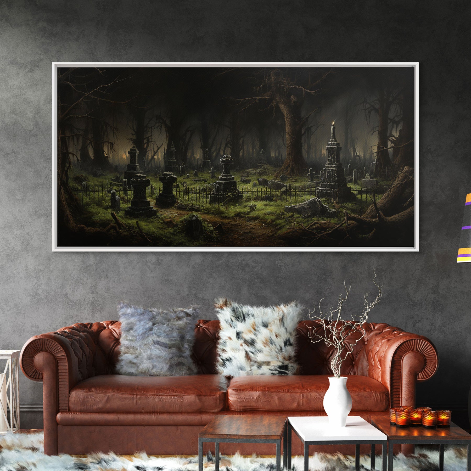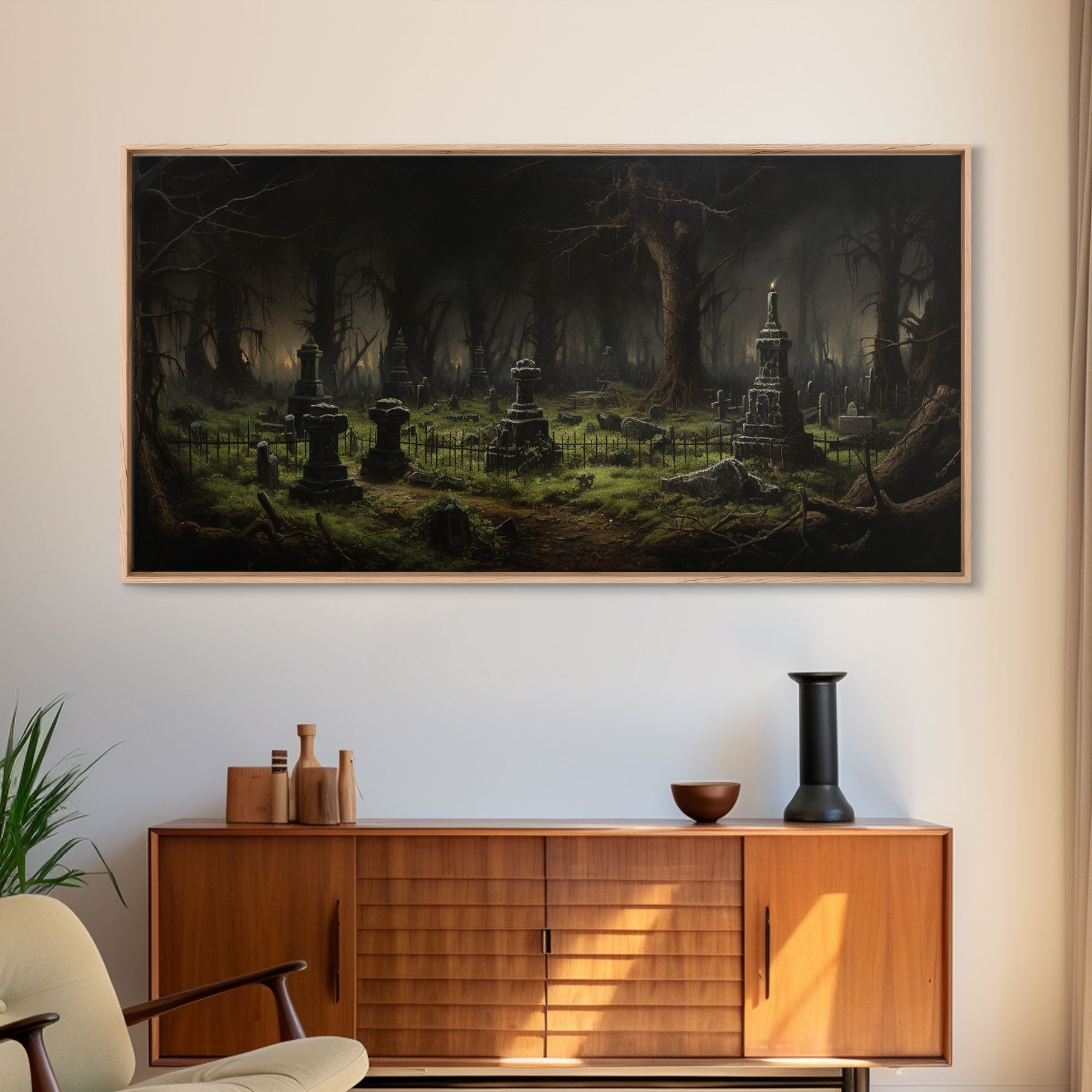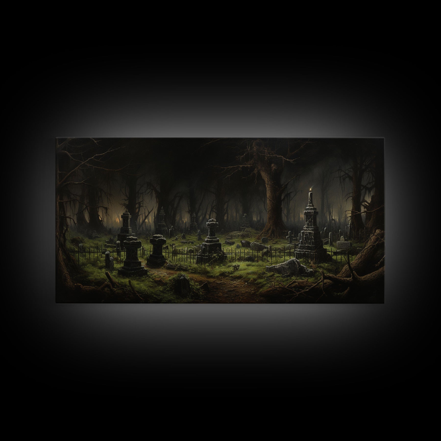 The Haunted Cemetery, Moody and Gloomy Art, Framed Canvas or Poster, Victorian Oil Painting, Dark Academia, Graveyard At Midnight