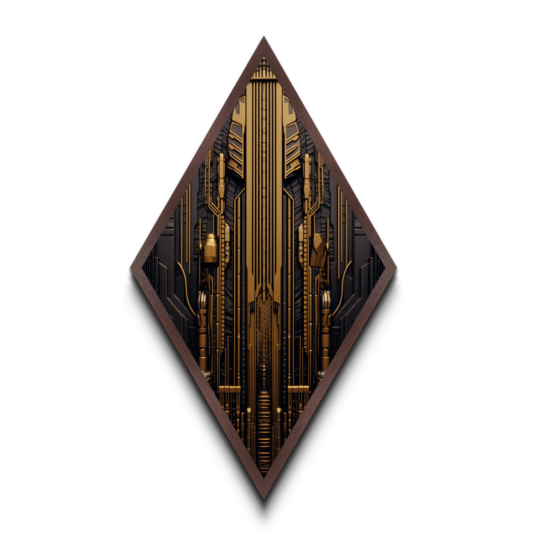 Cyber Gold Machine – Diamond Shaped Canvas Embossed Print Futuristic Wall Art, Sci-Fi Circuit Board Decor, Tech Industrial Steampunk Vibe
