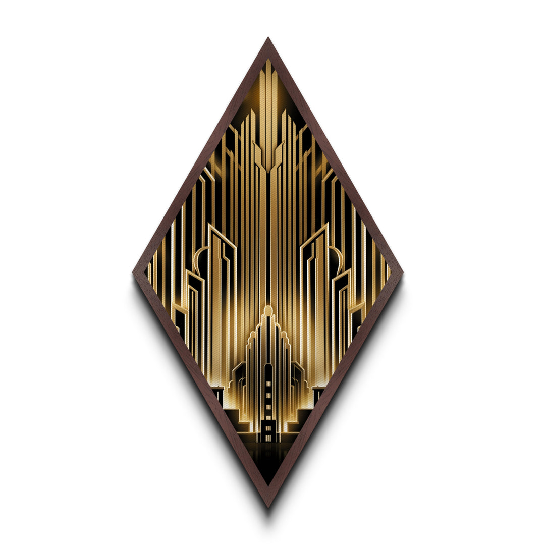 Art Deco Skyline – Diamond Shaped Canvas Art Print Golden Cityscape Wall Decor, Gatsby Era Style, Urban Elegance, Vintage Metropolis Design