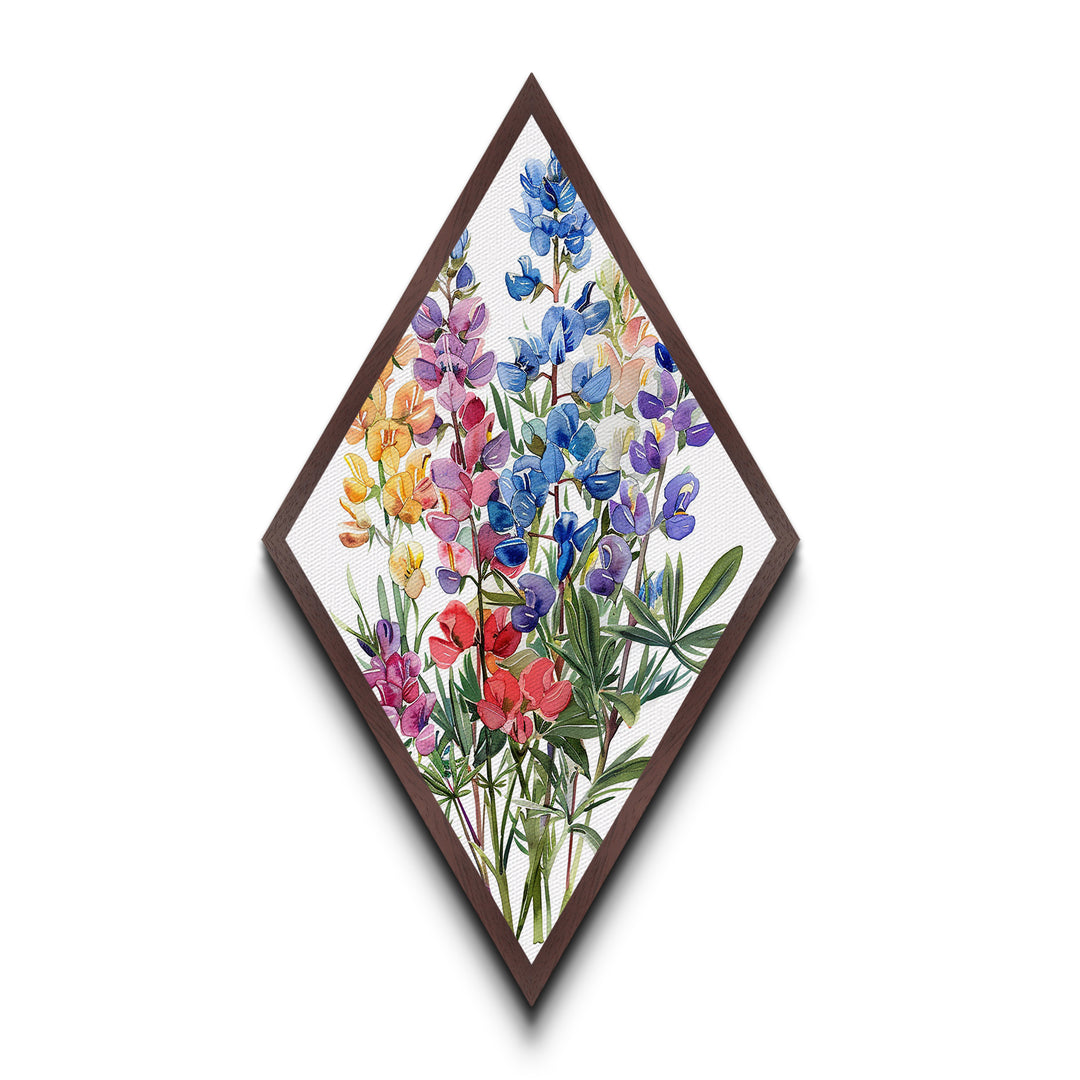 Diamond Shaped Lupine Wildflower Bouquet, vibrant watercolor botanical Canvas Art Print, colorful nature decor, spring bloom wall hanging
