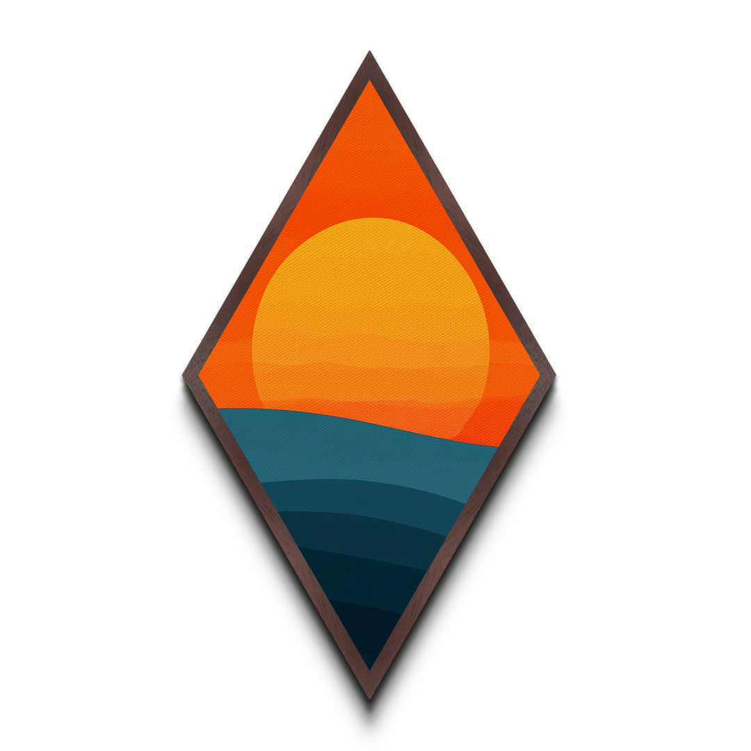 Sunset Radiance Horizon Diamond Shaped Canvas Textured Print with bold orange sun minimalist landscape warm earth tones geometric wall decor