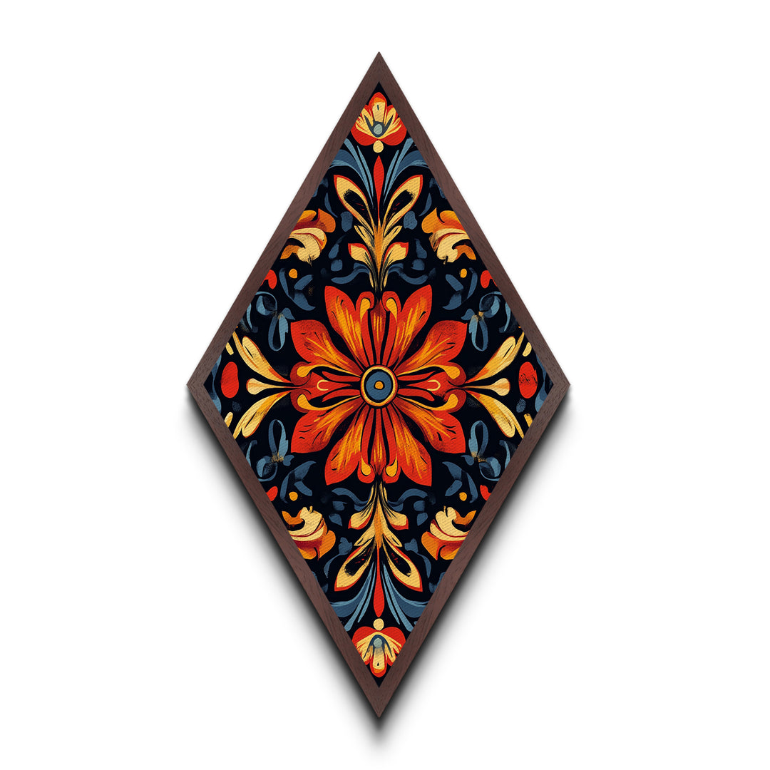 Crimson Bloom Folk Diamond Shaped Canvas Embossed Print featuring stylized red floral design dark background ethnic boho wall art vibrant palette