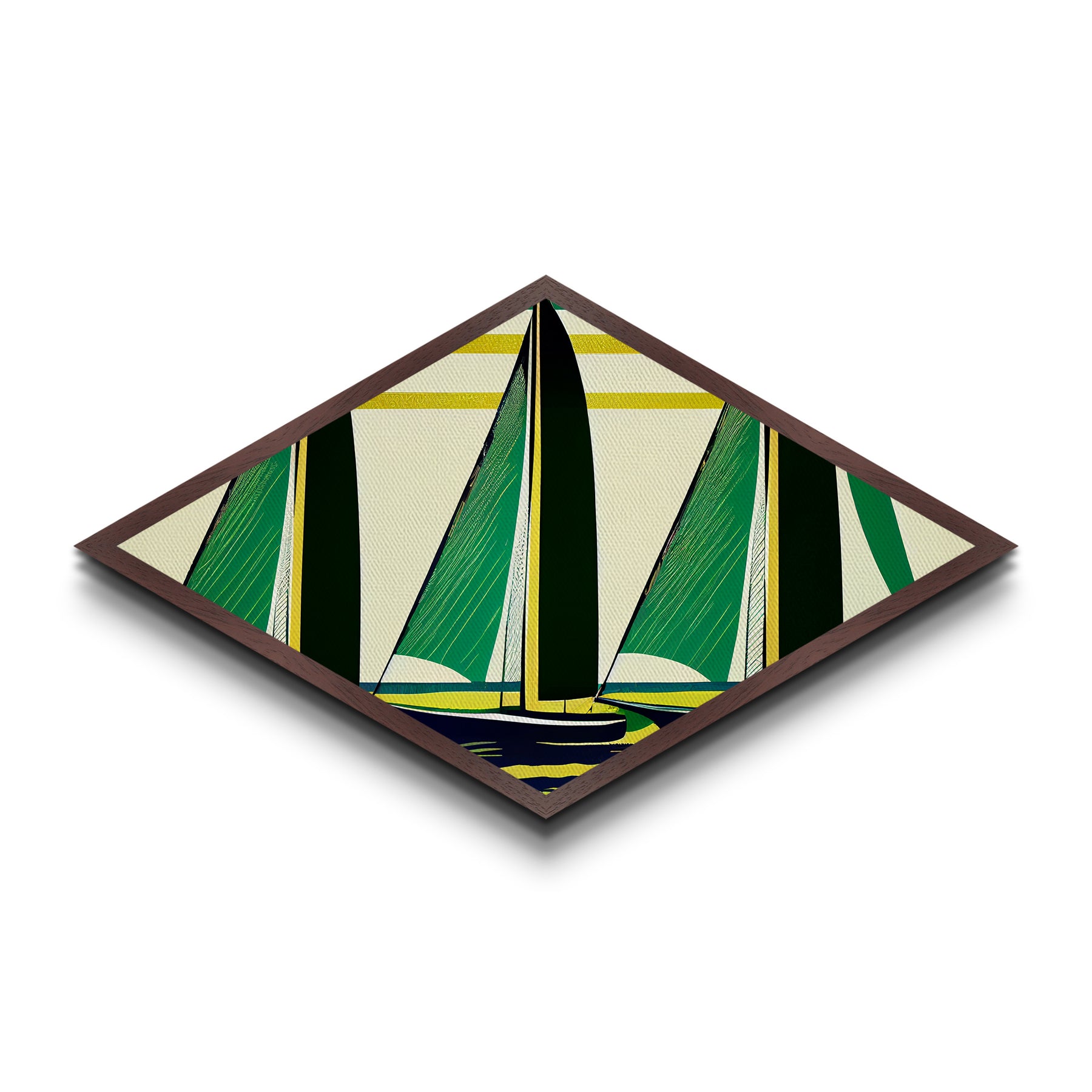 Abstract Sail Wind – Diamond Shaped Canvas Textured Print with retro sailboat geometry, green yellow nautical minimalist coastal theme