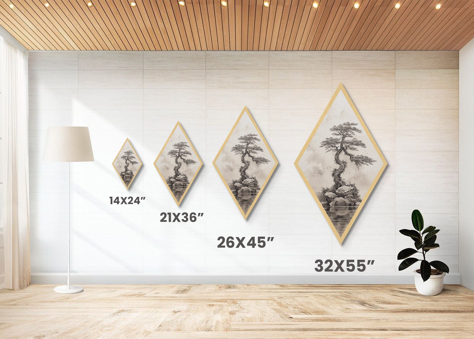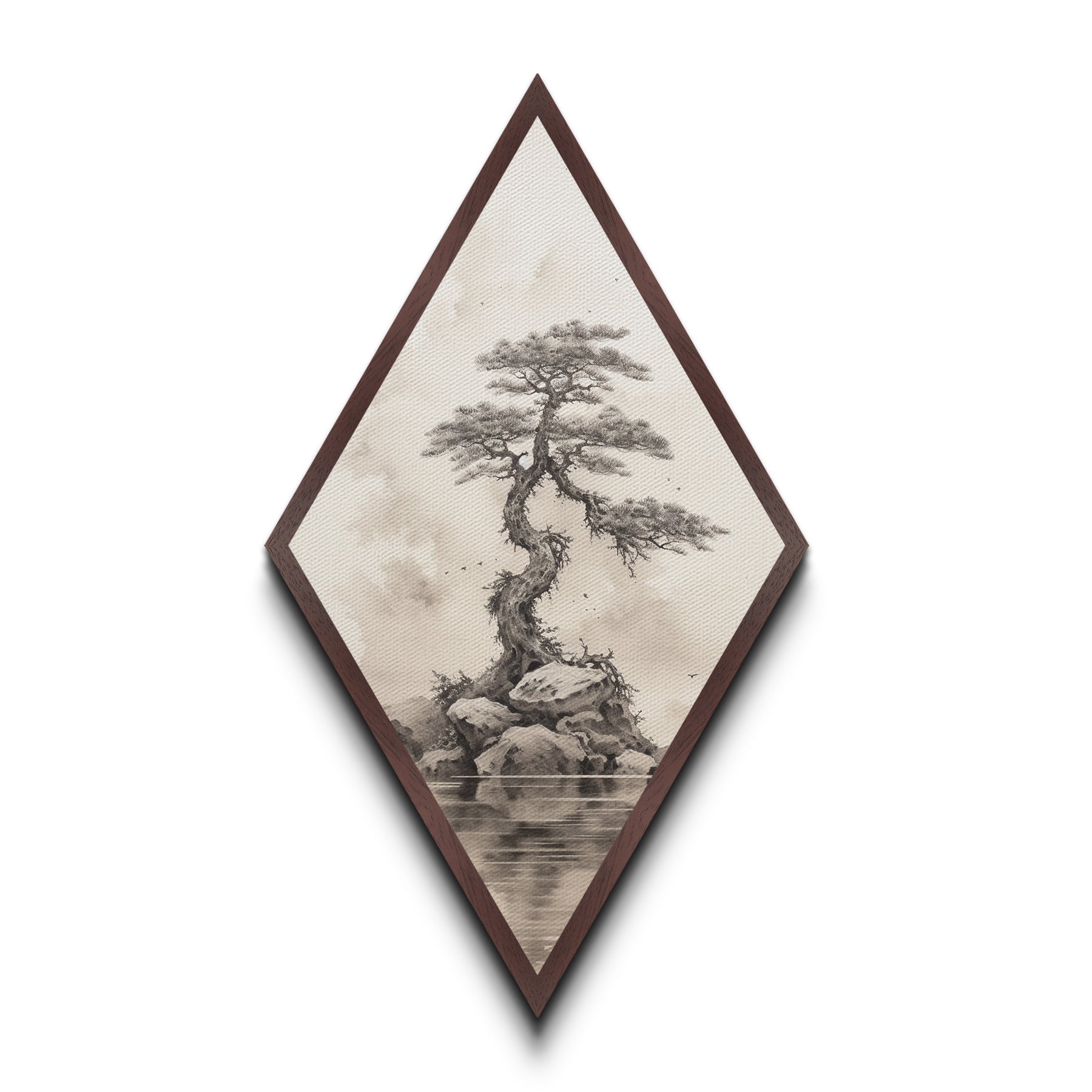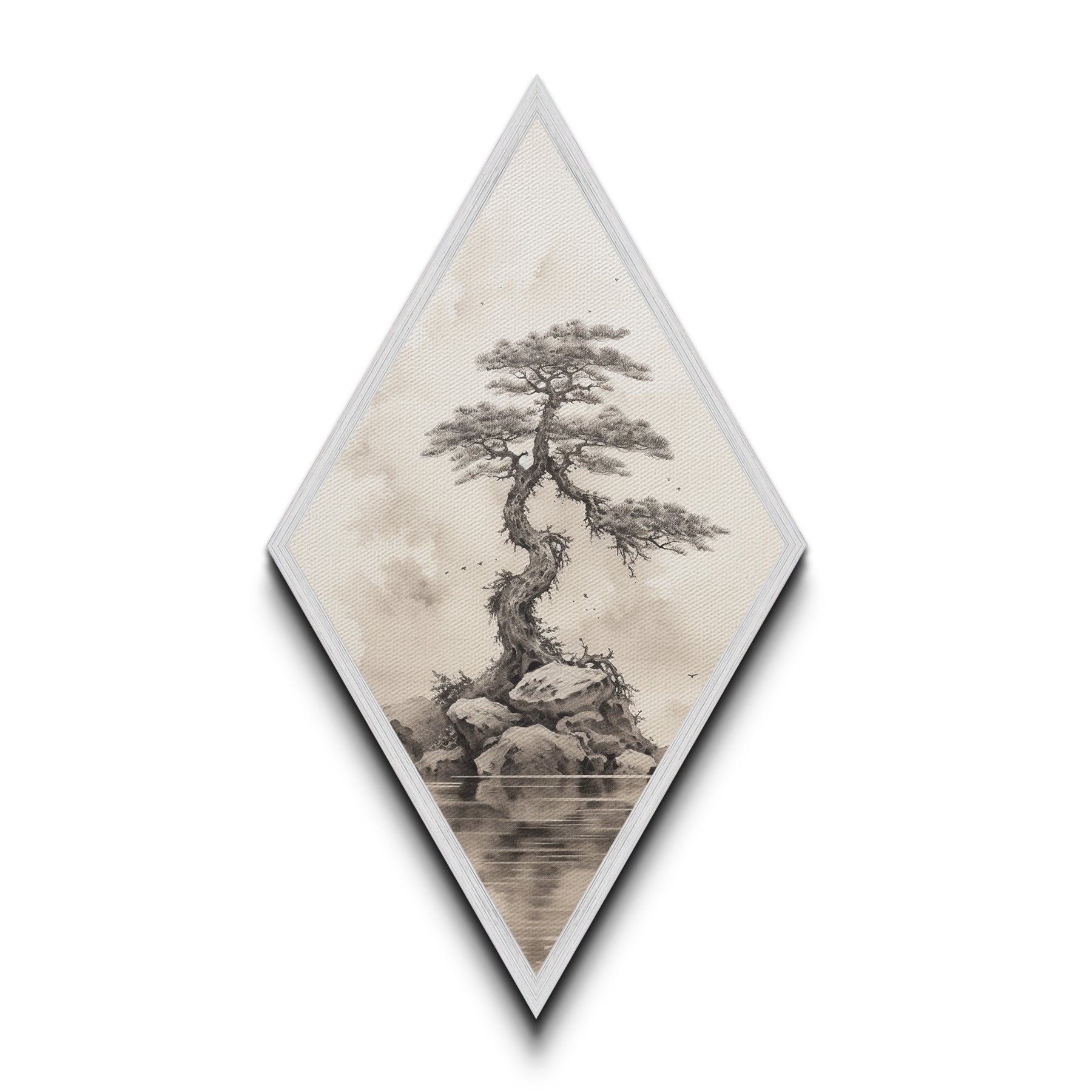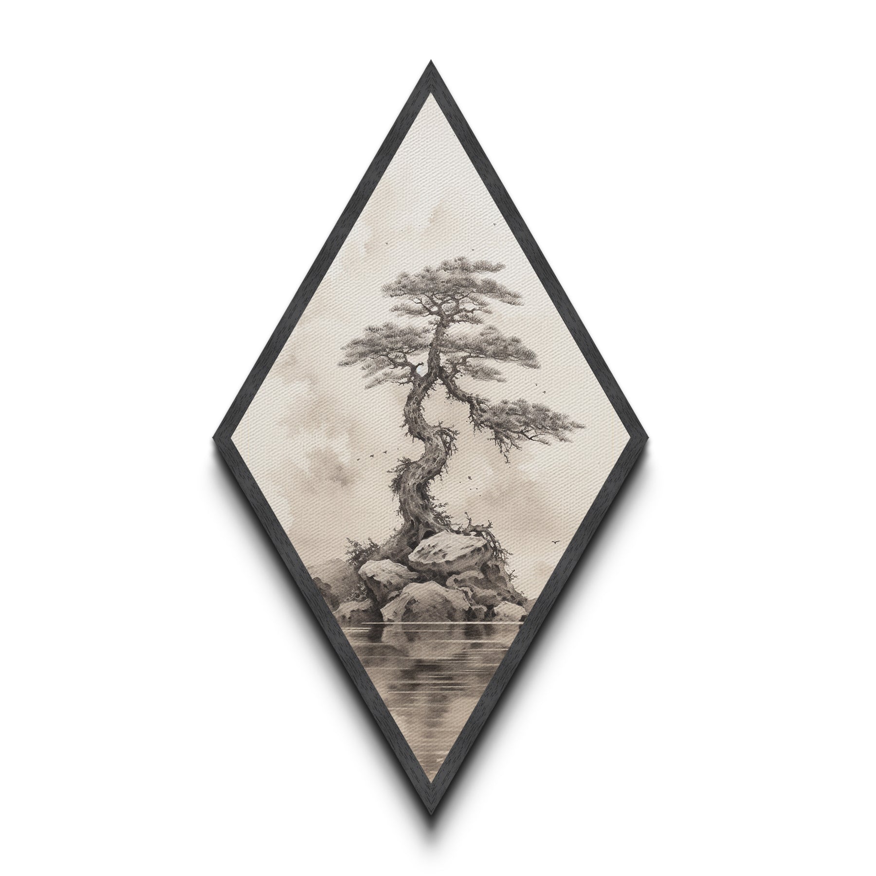 Charcoal Sketch of a Bonzai, Bonsai Tree Wall Art, Diamond Shaped Canvas Art Print, MCM Wall Decor, Odd Wall Art, Japanese Style Artwork