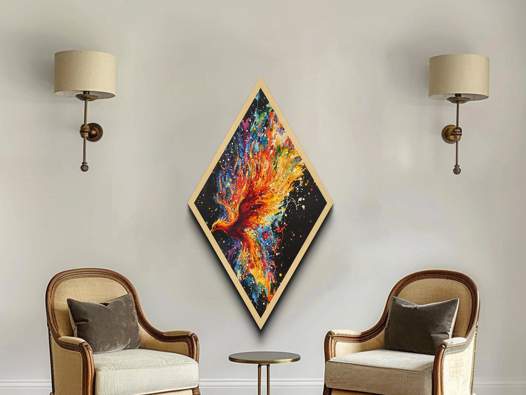 Cosmic Phoenix Bloom Diamond Shaped Canvas Embossed Print, Vibrant Color Splash Wall Art, Celestial Bird Fantasy Artwork