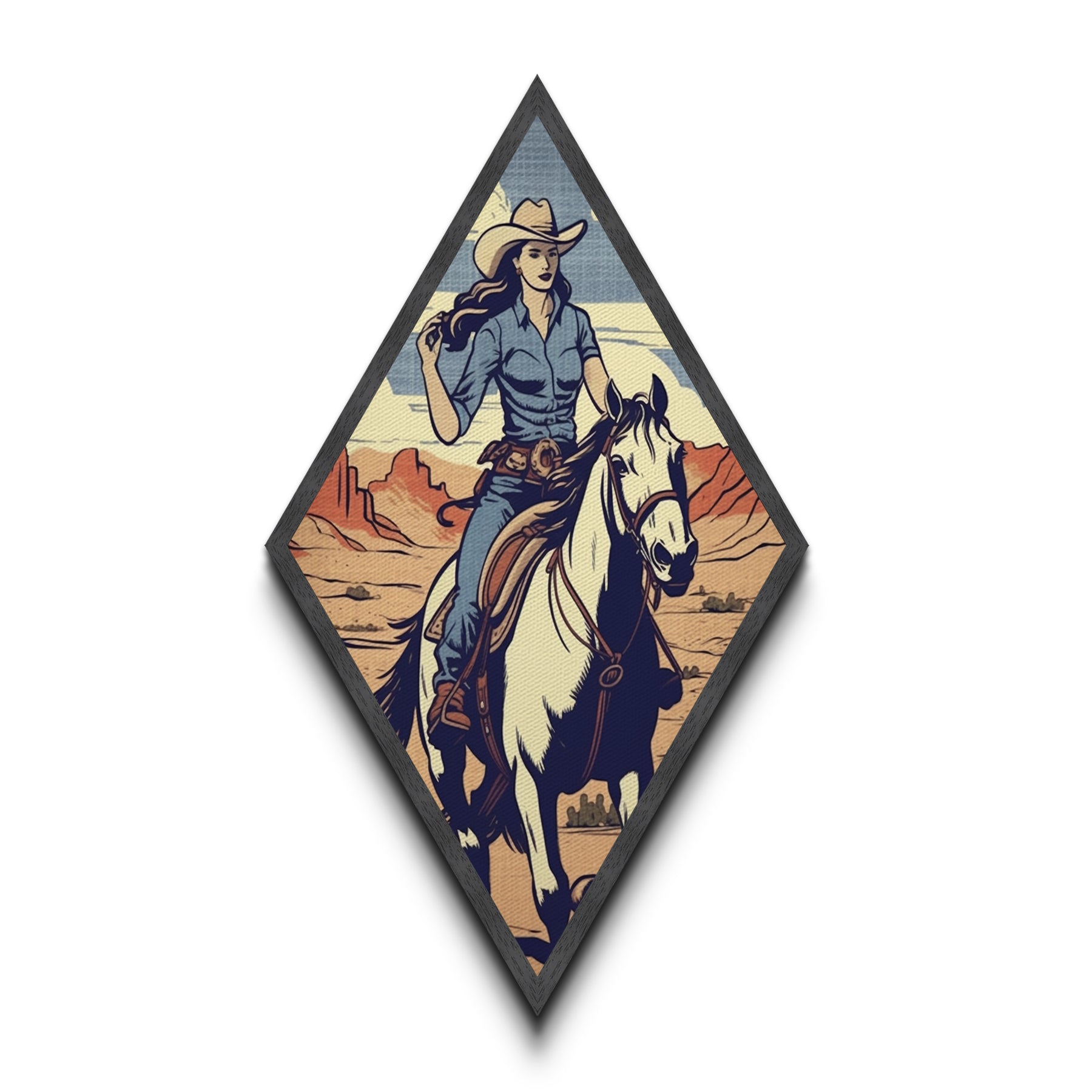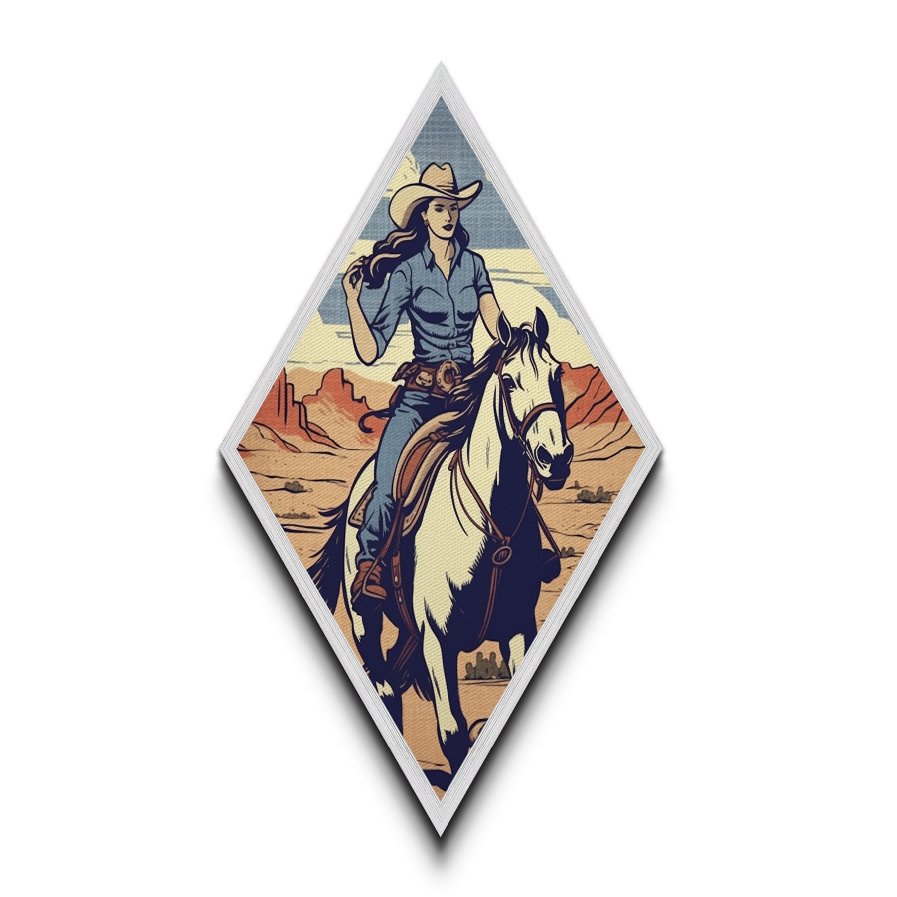 Cowgirl Canyon Ride Diamond Shaped Horseback Art Print Canvas Textured Print Retro Western Style Ranch Decor with Female Rider