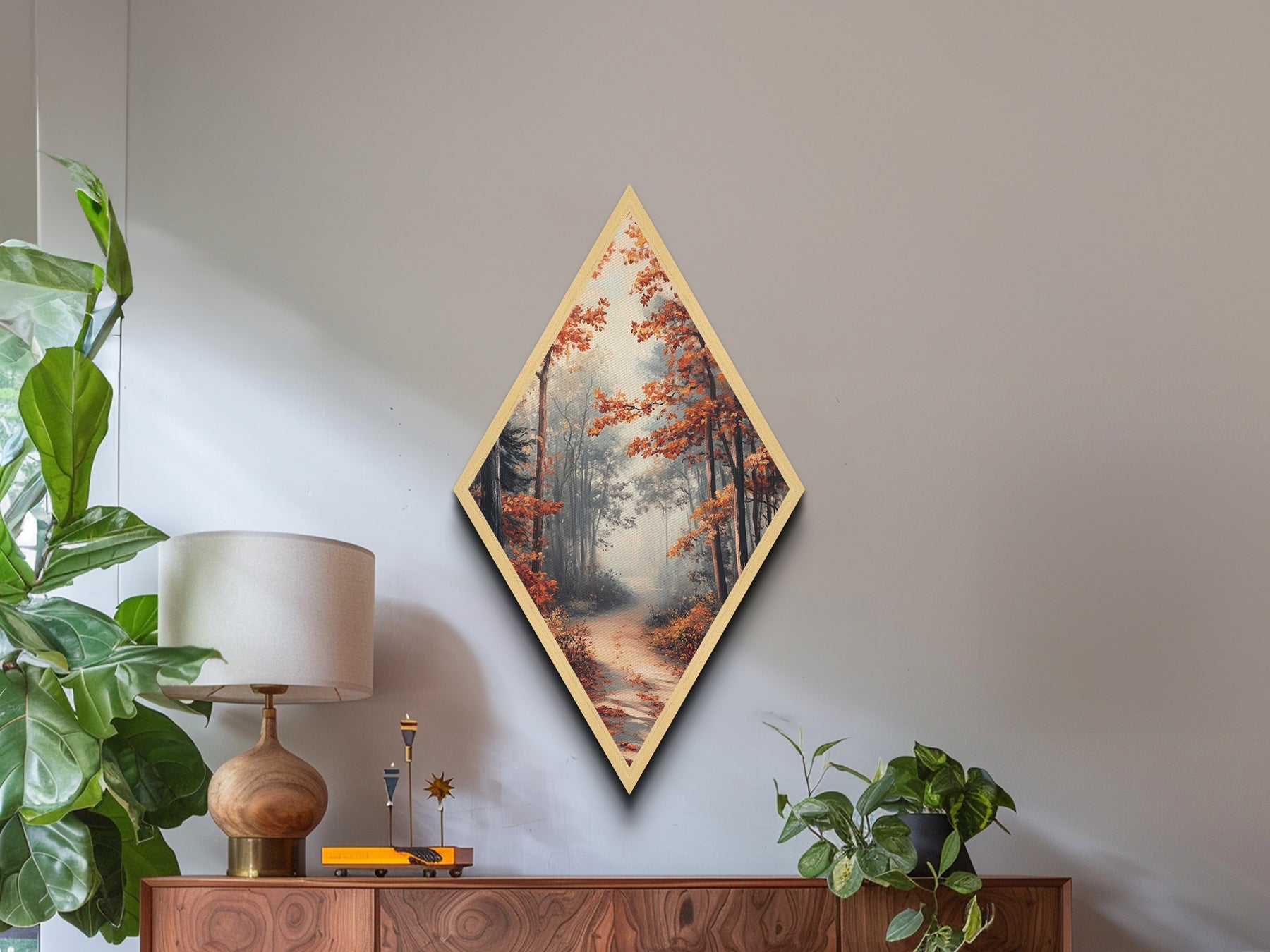 Diamond Shaped Autumn Forest Glow, warm foliage scenic Canvas Textured Print, cozy woodland path artwork, rustic fall home wall piece
