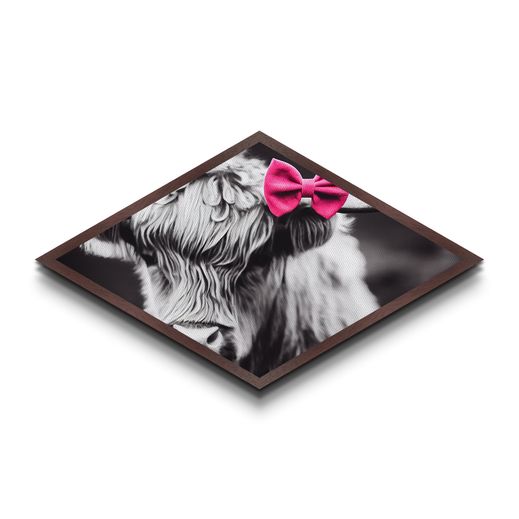 Diamond Shaped Cow Detail — Cute Highland Cow Wall Art Canvas Embossed Print, Rustic Farm Animal Decor, Pink Bow Aesthetic