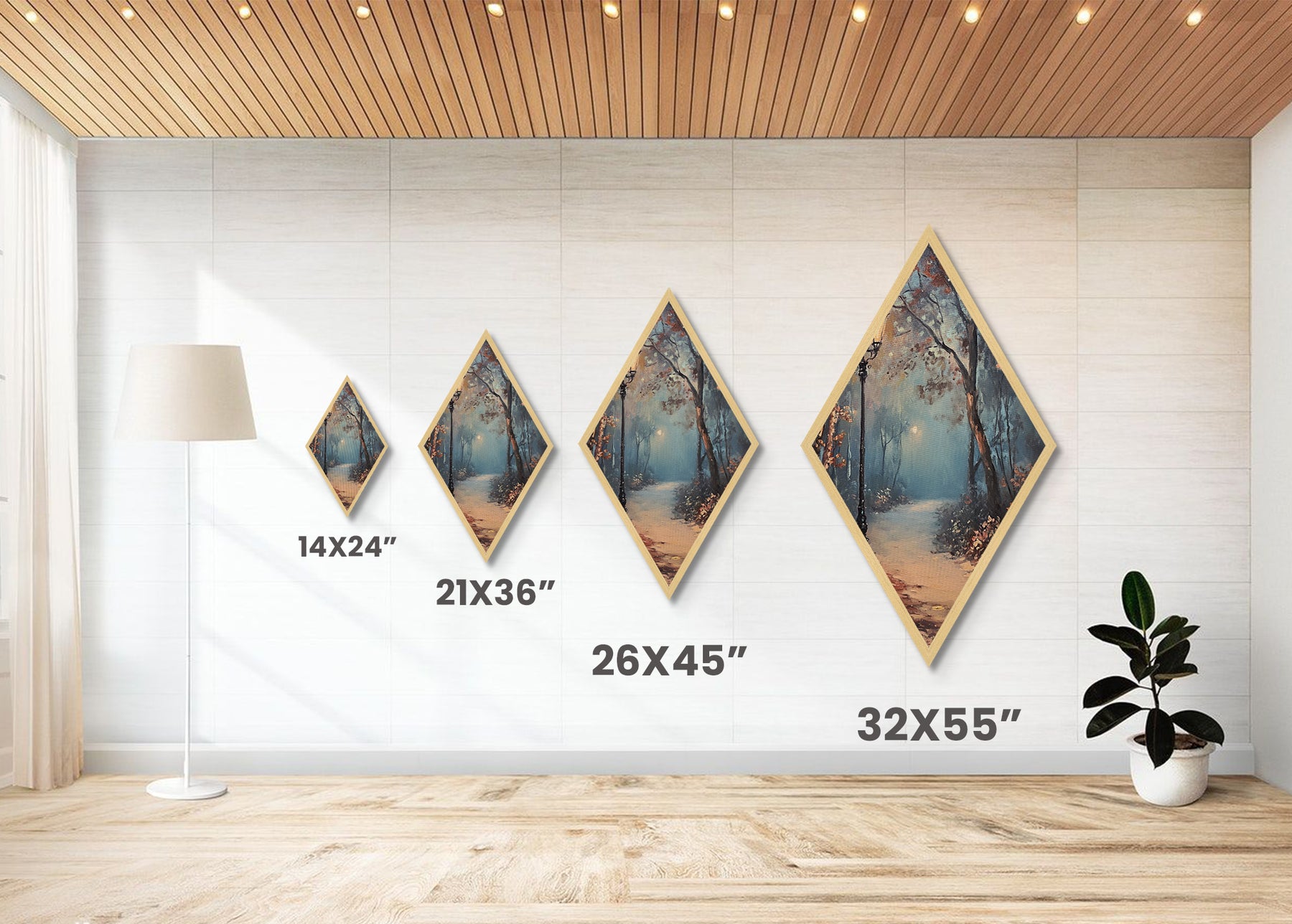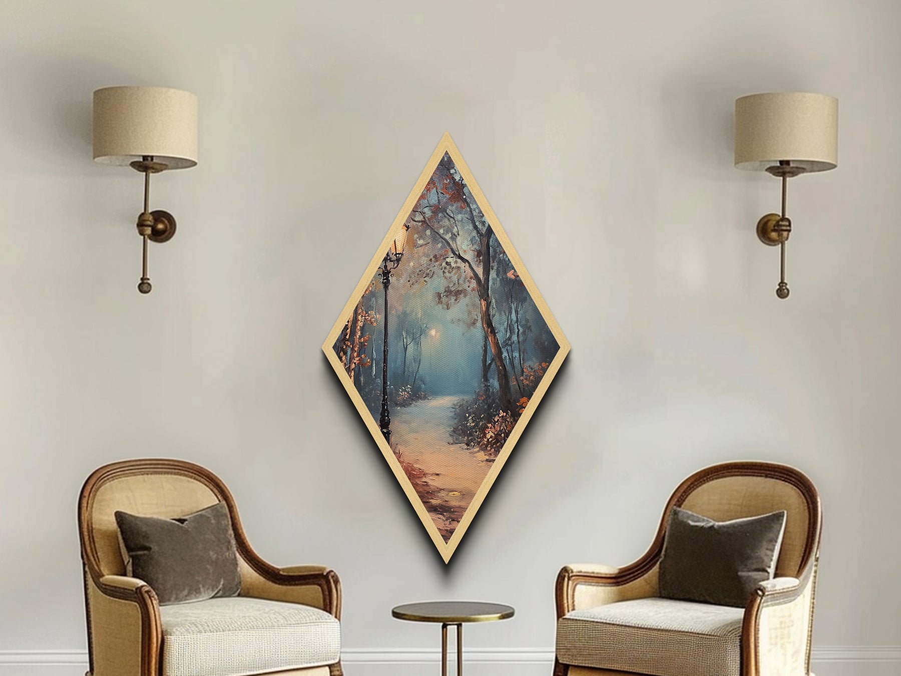 Diamond Shaped Foggy Forest Pathway, misty woodland Canvas Art Print, serene landscape painting, autumn moody nature trail home decor