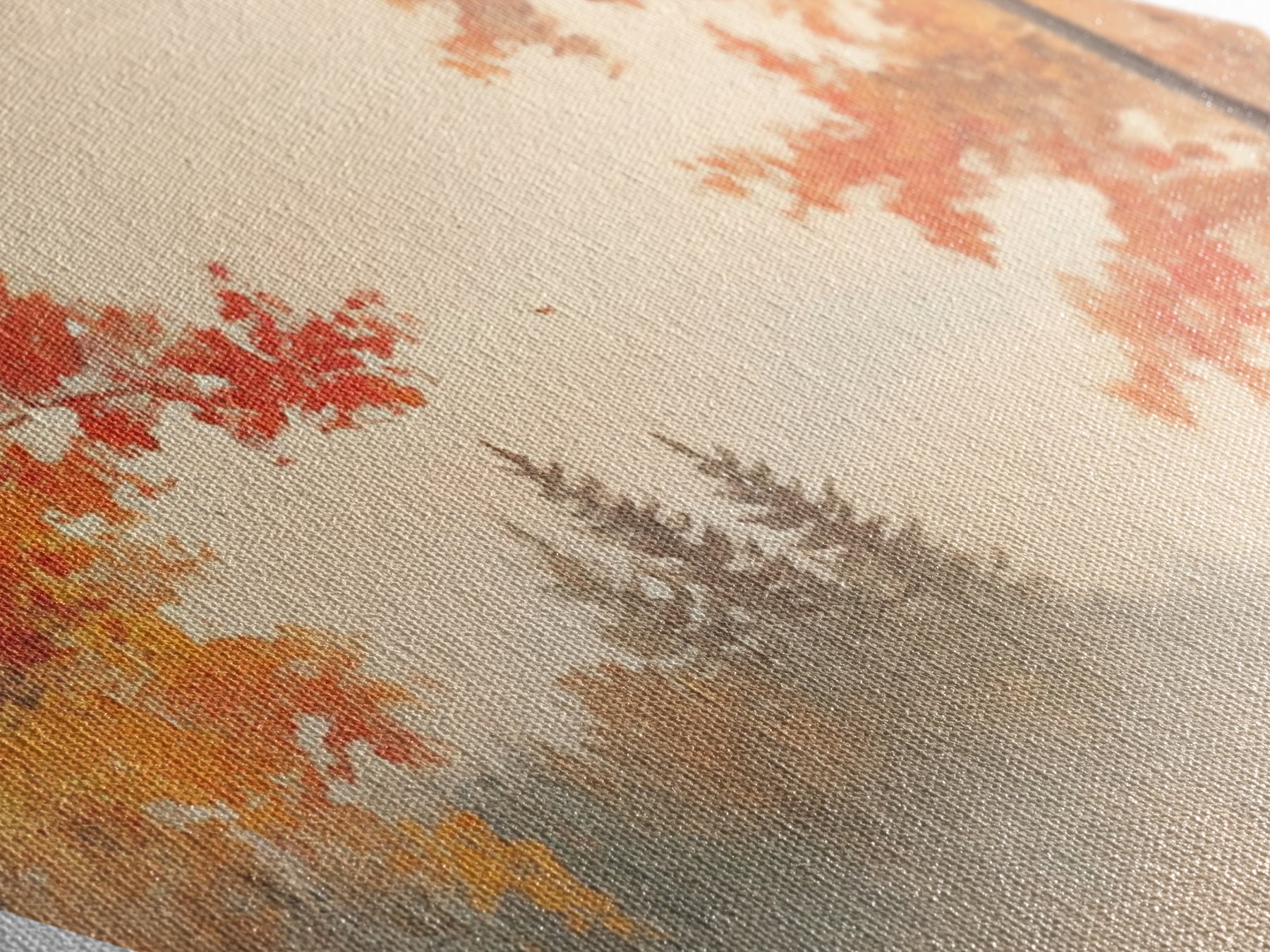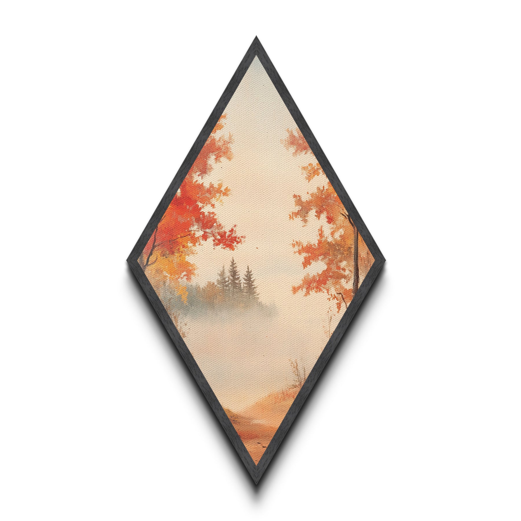Golden Autumn Path – Diamond Shaped Canvas Art Print, misty fall landscape wall decor, seasonal forest artwork, rustic nature home accent