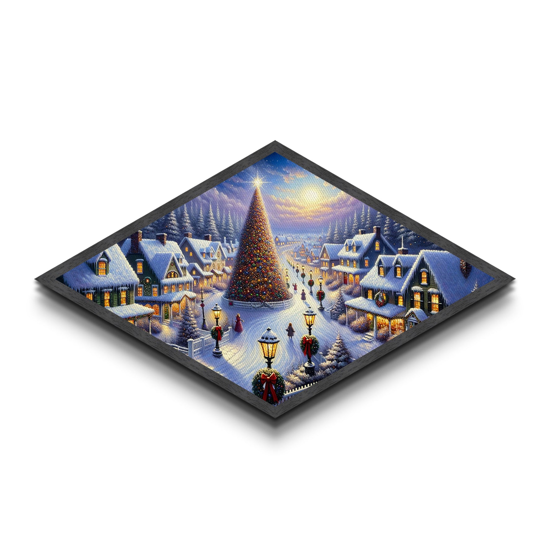 Magic Tree Lane Diamond Shaped Canvas Art Print snowy Christmas town glowing lights holiday gift home wall decor winter wonderland