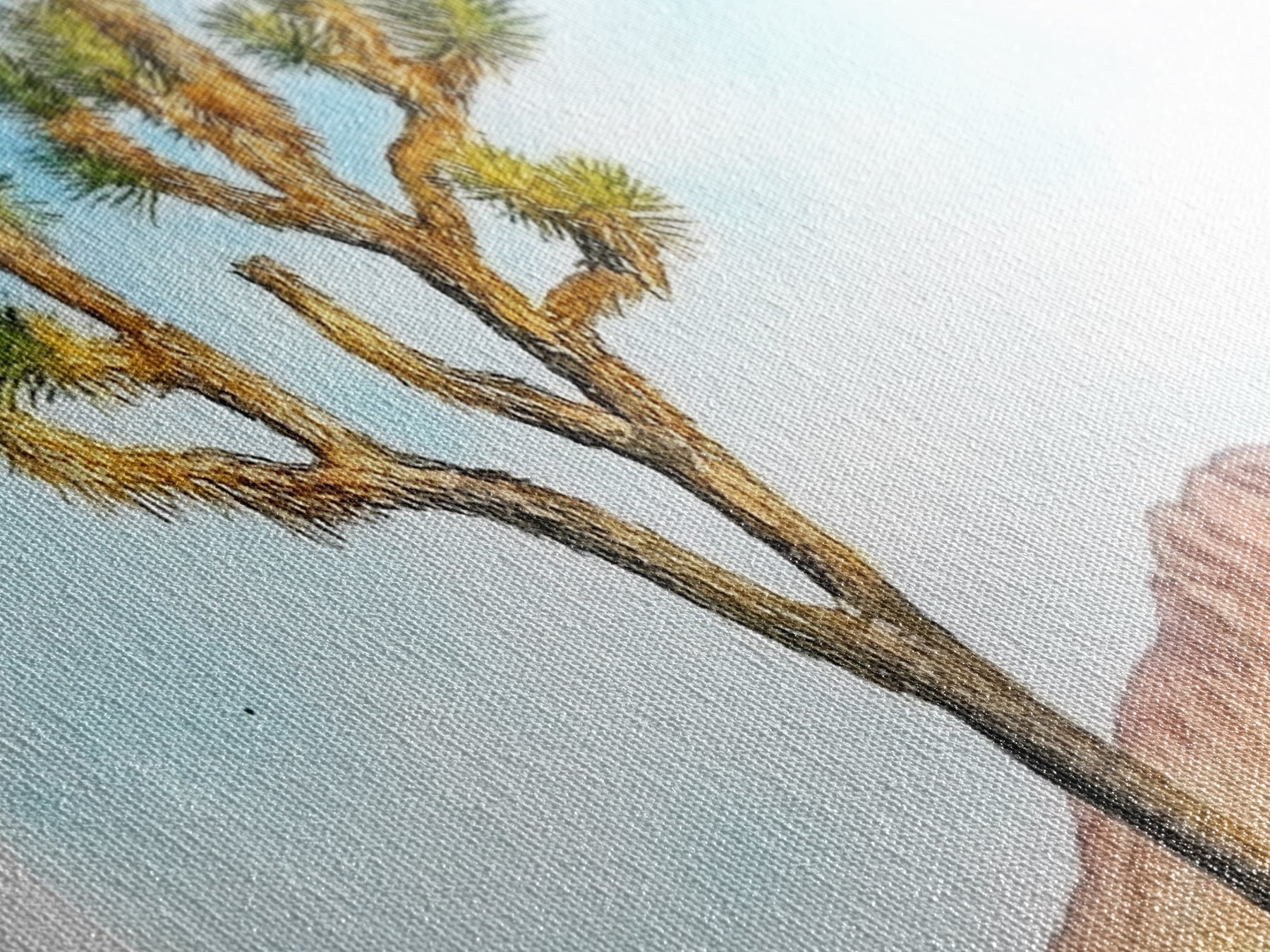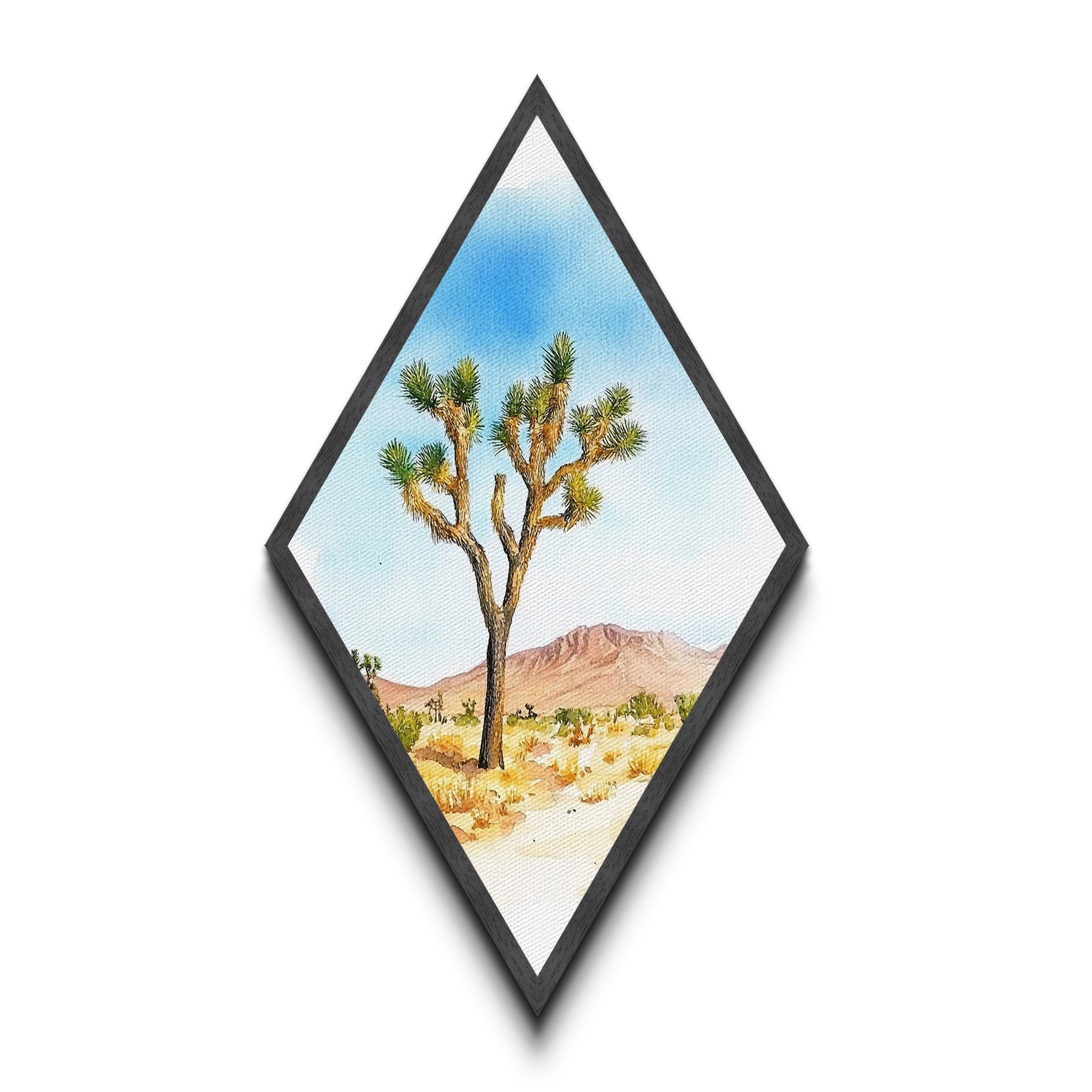 Mojave Tree Scene Diamond Shaped Canvas Textured Print, Watercolor Nature Landscape, Desert Mountain Western Wall Art
