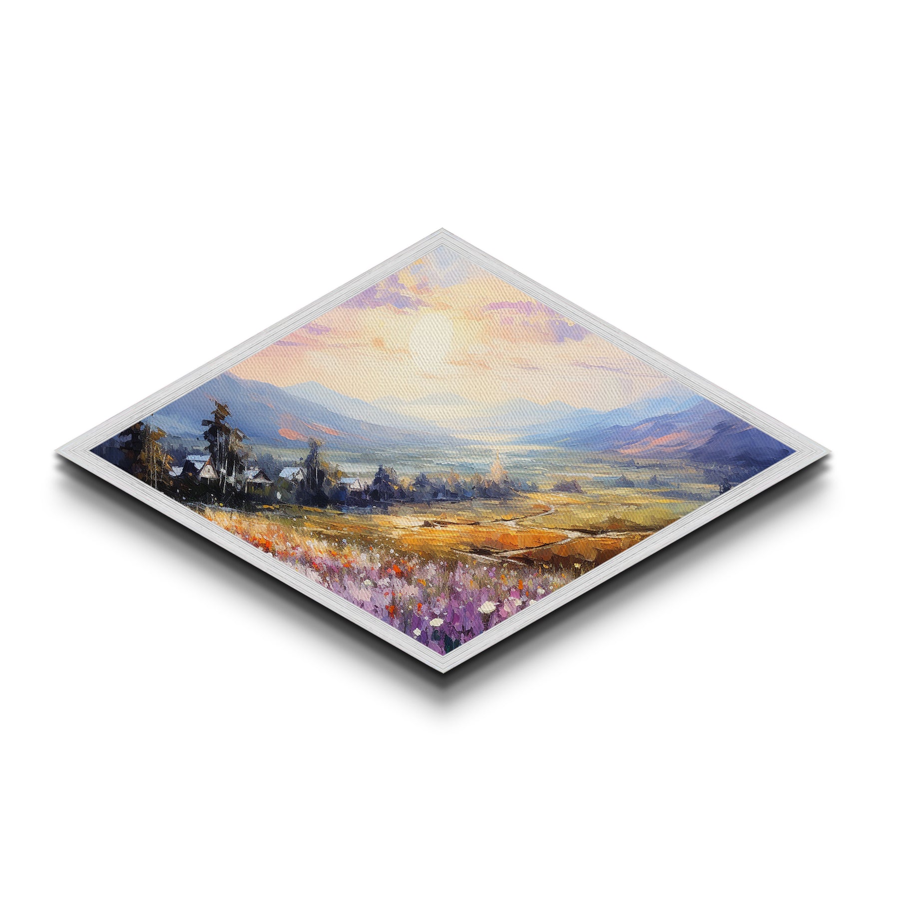 Morning Valley Bloom Diamond Shaped scenic countryside sunrise Canvas Art Print floral landscape painting warm family room decor